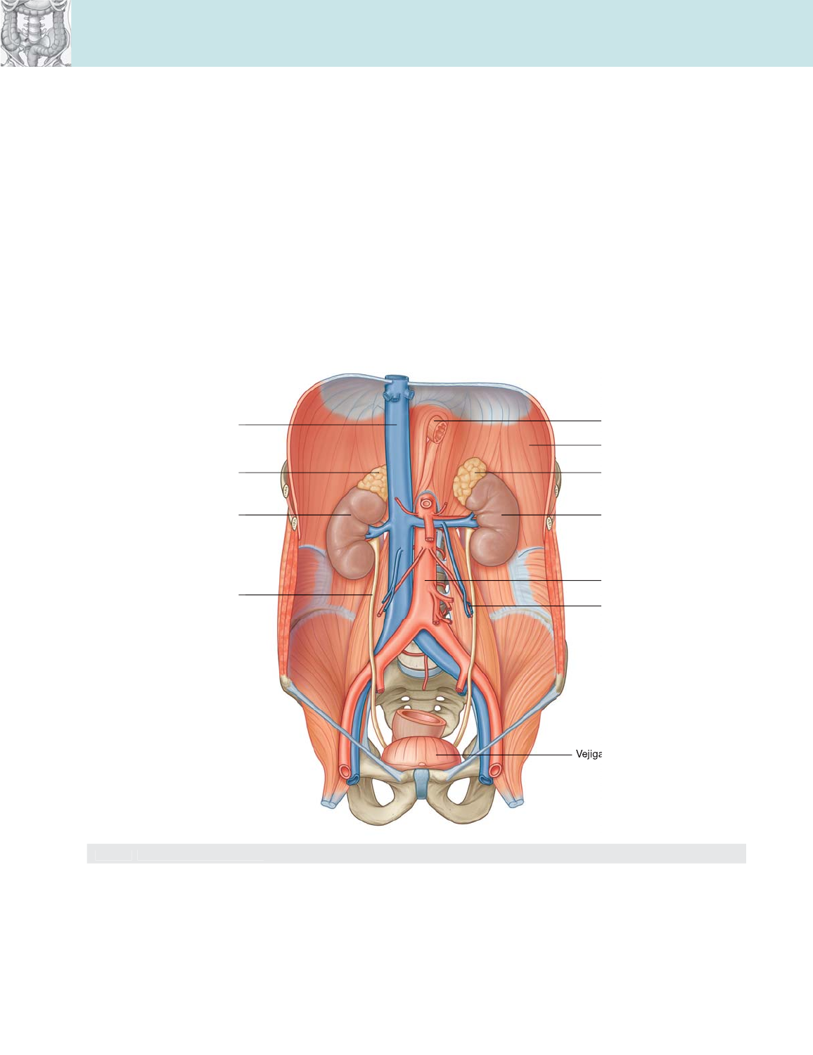 REGIÓN POSTERIOR DEL ABDOMEN Fig. 4.127 Región posterior del abdomen. Diafragma Esófago Aorta abdominal Glándula suprarrenal izquierda Riñón izquierdo Glándula suprarrenal derecha Riñón derecho Vena cava inferior Uréter a Vasos gonadales zona como conducto a su paso de una región del cuerpo a otra, como la aorta abdominal y los plexos nerviosos rela- cionados, la vena cava inferior, los troncos simpáticos y los linfáticos. Existen otras estructuras que tienen su origen en esta zona y que son críticas para el funcionamiento normal de otras regiones del cuerpo (p. ej., el plexo nervioso lum- bar), y otros órganos que se relacionan con esta zona duran- te su desarrollo y permanecen en ella en el adulto (p. ej., los riñones y las glándulas suprarrenales). La región posterior del abdomen está situada por detrás de la porción abdominal del tubo digestivo, del bazo y del pán- creas (fig. 4.127). Esta zona, delimitada por los huesos y músculos que forman la pared posterior del abdomen, con- tiene muchas estructuras directamente relacionadas con la actividad del contenido abdominal y que utilizan esta Pared posterior del abdomen Huesos Vértebras lumbares y sacro Los cuerpos de las cinco vértebras lumbares se proyectan en la línea media de la zona posterior del abdomen (fig. 4.128). La curvatura secundaria (convexidad hacia delante) que forma la región lumbar de la columna vertebral hace que es- tas estructuras sean prominentes. Las vértebras lumbares se diferencian de las cervicales y torácicas por su tamaño. Son mucho más grandes que las vértebras del resto de las regiones. Los cuerpos vertebrales son muy grandes y aumentan de tamaño progresivamente desde LI a LV. Los pedículos son cortos y macizos, las apófi- sis transversas largas y delgadas y las apófisis espinosas grandes y resistentes. Las apófisis articulares son grandes y están orientadas hacia la cara interna y lateral, lo que facilita la flexión y extensión de esta parte de la columna vertebral. Entre las vértebras lumbares están los discos interverte- brales, que completan esta parte de la línea media de la pa- red posterior del abdomen. La línea media de la pared posterior del abdomen por debajo de las vértebras lumbares la forma el borde superior del sacro (fig. 4.128). El sacro es el resultado de la fusión de las cinco vértebras sacras en un hueso único, en forma de cuña con la parte superior ancha y que se estrecha infe- riormente. La cara anterior cóncava y la posterior convexa presentan orificios sacros anteriores y posteriores por los que pasan las ramas anteriores y posteriores de los nervios espinales. Huesos de la pelvis Los huesos ilíacos, que son componentes de cada hueso pélvico, se articulan a los lados del sacro en las articulacio- nes sacroilíacas (fig. 4.128). La parte superior del ilíaco se expande hacia arriba para formar una zona delgada en for- ma de ala (la fosa ilíaca). La cara interna del ílion y los músculos relacionados forman parte de la pared posterior del abdomen. Costillas Superiormente las costillas XI y XII completan el marco óseo de la pared posterior del abdomen (fig. 4.128). Estas costillas se diferencian del resto en que no se articulan con el esternón, tienen en la cabeza una sola cara articular y no tienen cuello ni tubérculos. La costilla XI es posterior a la porción superior del riñón izquierdo, y la costilla XII es posterior a la porción superior de ambos riñones. En la costilla XII se insertan muchos músculos y ligamentos. Músculos Los músculos que forman los límites interno, lateral, infe- rior y superior de la región posterior del abdomen rellenan el marco óseo de la pared posterior del abdomen (tabla 4.2). En la parte interna están los músculos psoas mayor y me- nor, en la parte lateral el músculo cuadrado de los lomos, en la parte inferior el músculo ilíaco, y en la parte superior está el diafragma (fig. 4.129). Psoas mayor y menor Medialmente los músculos psoas mayores cubren la su- perficie anterolateral de los cuerpos de las vértebras lumba- res, ocupando el espacio entre los cuerpos vertebrales y las apófisis transversas (fig. 4.129). Este músculo sale de los cuerpos de la vértebra TXII y de las cinco vértebras lumba- res, de sus discos intervertebrales y de las apófisis transver- sas de las vértebras lumbares. Después de pasar el borde de la pelvis, continúa inferiormente en la parte anterior del muslo, inferior al ligamento inguinal, y se inserta en el tro- cánter menor del fémur. Anatomía regional • Región posterior del abdomen Fig. 4.128 Huesos de la pared posterior del abdomen. Vé t b LIII Isquion Sínfisis del pubisSacro Abdomen tra la gravedad en posición supina. Está inervado por los ramos anteriores de los nervios L1 a L3. El músculo psoas menor, que puede estar ausente, está relacionado con el psoas mayor. Cuando existe, está sobre la superficie del psoas mayor, y sale de las vértebras TXII y LI y su disco intervertebral; tiene un tendón largo que se inserta en la línea pectínea del borde pélvico y en la eminencia ilio- púbica. El psoas menor es un flexor débil de la columna vertebral, y está inervado por el ramo anterior del nervio L1. Cuadrado lumbar A los lados, el músculo cuadrado lumbar llena el espacio entre la costilla XII y la cresta ilíaca a ambos lados de la co- lumna vertebral (fig. 4.129). El psoas mayor se superpone en la parte interna; a lo largo de sus bordes laterales están los músculos transversos del abdomen. El cuadrado lumbar se origina en las apófisis transver- sas de la vértebra LV, del ligamento iliolumbar y de la por- ción contigua de la cresta ilíaca. La inserción superior del músculo está en las apófisis transversas de las cuatro pri- meras vértebras lumbares y en el borde inferior de la costi- lla XII. Los músculos cuadrados lumbar bajan y estabilizan la costilla XII y contribuyen a la flexión lateral del tronco. Cuando actúan ju