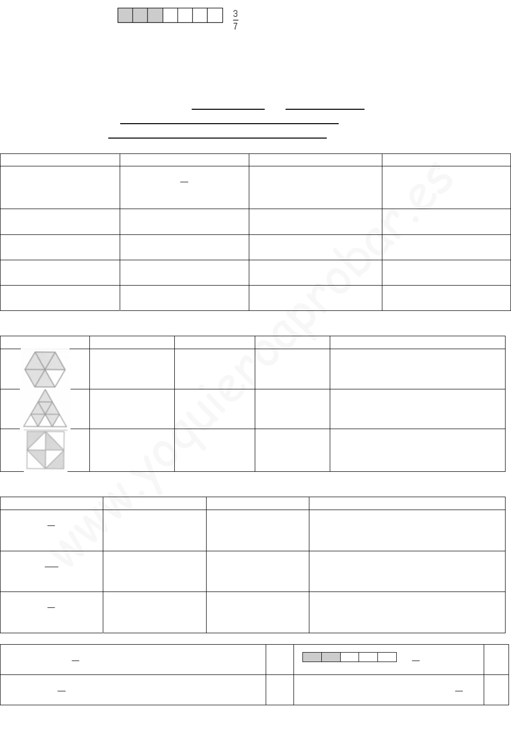1 Escribe y representa las siguientes fracciones: a) Tres séptimos b) Siete octavos c) Un cuarto d) Seis sextos e) Doce quinceavos 2 Completa la siguiente frase: �os términos de una fracción son el y el . El denominador indica . El numerador indica . 3 Escribe las siguientes fracciones. Señala el numerador y el denominador de cada una. Lectura Fracción Numerador Denominador Dos tercios 3 2 2 3 Tres cuartos Cinco séptimos Ocho novenos Un sexto 4 Completa en tu cuaderno la siguiente tabla: Representación Denominador Numerador Fracción Se lee 6 5 5 Completa la siguiente tabla: Fracción Numerador Denominador Se lee 8 1 10 6 9 7 6 Contesta V, de verdadero, o F, de falso, a las siguientes afirmaciones y corrige aquellas que sean falsas. La fracción 9 8 se lee como nueve octavos = 5 2 La fracción 4 3 quiere decir que de cuatro partes tomo 3 La fracción siete quintos se escribe 7 5 ww w.y oq uie ro ap ro ba r.e s felipe 6.1. Las fracciones. Representación gráfica 7 Señala en qué casos está coloreado 4 1 de la figura: 8 Copia en tu cuaderno las siguientes figuras y colorea 2 1 de cada una de ellas. 9 Completa lo que falta: a) Trece quinceavos = ... 13 b) 9 1 = ....... noveno c) ... ... = … 10 Completa el siguiente cuadro: Representación Se escribe 8 5 Se lee Dos quintos 11 Un grupo de montañeros llega a un refugio, que está casi lleno. En la entrada se encuentran con el siguiente cartel: Número de plazas: 20 Ocupadas: 17 Libres: 3 Expresa mediante fracciones el número de plazas ocupadas y plazas libres que hay. 12 De los 26 alumnos de la clase de 6º, tienen como actividad extra escolar fútbol 10 alumnos, baloncesto 7, natación 6 y el resto van a música. Escribe la fracción que corresponde a cada actividad. 13 Milagros tiene un rompecabezas con 100 piezas: 20 son verdes, 35 son rojas, 15 son amarillas y el resto son azules. Escribe la fracción que corresponde a cada color. 14 Carmen parte su tarta de cumpleaños en 12 trozos. Si se comen 7 pedazos, expresa mediante una fracción la cantidad de tarta que se han tomado y la cantidad que les queda. 15 La mandarina de Manuel tenía 10 gajos y se ha comido 3; la mandarina de María Jesús tenía 11 gajos y se ha comido 4. Expresa mediante fracciones la cantidad que ha tomado cada uno. ww w.y oq uie ro ap ro ba r.e s 1 Completa la siguiente frase: Para obtener fracciones equivalentes, .............................. o .............................. el numerador y el ............................. por el ................... número. 2 ¿Son 21 7 y 3 1 fracciones equivalentes? Razona la respuesta. 3 Comprueba si las siguientes parejas de fracciones son equivalentes, multiplicando en cruz. a) 7 4 y 21 12 b) 24 15 y 72 45 c) 8 5 y 32 20 d) 5 3 y 15 13 4 Completa la siguiente frase: Dos fracciones son equivalentes cuando............................................................... 5 Escribe dos fracciones equivalentes a cada una de las siguientes. Utiliza los dos procedimientos que conoces. 14 6 21 9 15 5 6 Indica qué dibujos representan fracciones equivalentes y escríbelas. 7 Completa estas expresiones: 8 Mira estos rectángulos y contesta: a) ¿En cuántas partes está dividido cada rectángulo? b) ¿Cuántas partes se han coloreado en cada rectángulo? c) ¿Qué fracciones representan la misma parte del rectángulo y, por tanto, son equivalentes? ww w.y oq uie ro ap ro ba r.e s felipe 6.2. Fracciones equivalentes 9 Contesta V, de verdadero, o F, de falso, a las siguientes afirmaciones y corrige aquellas que sean falsas: 24 36 y 6 9 son equivalentes. La fracción 3 2 es la fracción irreducible de 12 4 Es lo mismo comer 5 4 de pastel que 15 10 6 4 , 72 48 y 36 24 son fracciones equivalentes. 10 Empareja las fracciones que aparecen en la columna de la izquierda con las fracciones que sean equivalentes de la columna de la derecha. 8 3 21 14 40 12 13 9 10 3 39 27 3 2 16 6 11 La fracción 36 24 ha perdido a sus fracciones equivalentes. Ayúdale a encontrarlas de entre todas las que están aquí. 5 1 18 12 15 11 9 6 6 4 18 40 6 2 3 2 20 25 12 8 31 7 72 48 12 Halla la fracción irreducible de: 120 24 72 3 123 41 75 15 13 Escribe los numeradores y los denominadores que faltan para que las parejas de fracciones sean equivalentes. a) ... 2 15 6 = c) ... 9 7 1 = e) 80 ... 8 3 = b) 3 ... 6 10 = d) 3 2 18 ... = f) 15 3 ... 7 = 14 Icíar y Ernesto tienen dos parcelas en el valle. Icíar tiene 9 3 de la parcela de su abuela y Ernesto 15 5 de la parcela de su padre. ¿Tienen el mismo terreno? Dibuja las parcelas de ambos para apoyar tu razonamiento. 15 Andrea y José van al cine. Al llegar, en la taquilla les dicen que 75 de las 100 localidades están ocupadas. ¿Podrías expresar este hecho a través de tres fracciones equivalentes? ww w.y oq uie ro ap ro ba r.e s 1 Escribe en cada caso el signo > o < según corresponda. a) 7 5...... 7 8 b) 4 3...... 4 1 c) 13 10...... 13 11 d) 9 8...... 9 7 2 Completa la siguiente frase: Si dos fracciones tienen el mismo denominador, la mayor es la que tenga el ..................................... mayor. Por ejemplo 5 4...... 5 2 3 Escribe en cada caso el signo > o < según corresponda. a) 7 2..... 5 2 b) 2 3..... 4 3 c) 6 7..... 8 7 d) 5 9..... 3 9 4 Completa la siguiente frase: Para comparar fracciones con distinto numerador y denominador, buscamos fracciones .............................. que tengan todas el .................. denominador, y luego comparamos sus .................................... Por ejemplo: 3 1..... 5 3 15 5..... 15 9 3 1.?. 5 3 ⇒⇒ 5 Completa la siguiente frase: Si dos fracciones tienen el mismo numerador, es mayor la que tenga el denominador ............................ Por ejemplo: 9 6..... 7 6 6 Escribe en cada caso el signo > o < según corresponda. Utiliza el método de los productos cruzados. a) 6 5...... 4 3 b) 7 4...... 3 2 c) 3 2...... 5 3 d) 4 1...... 5 4 a) 24 20 24 18 < 7 Coloca las siguientes fracciones en el lugar adecuado para que estén bien ordenadas de men