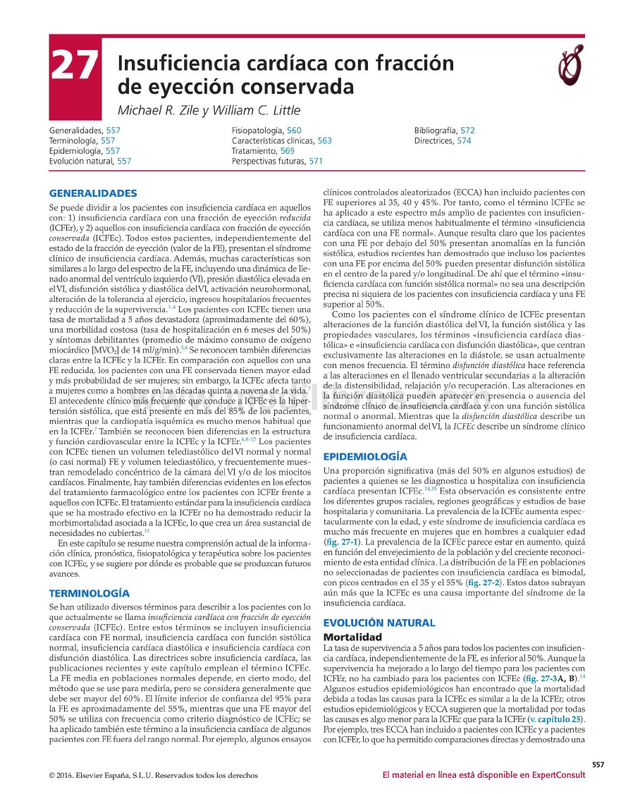 27 Insuficiencia cardíaca con fracción de eyección conservada Michael R. Zile y William C. Little IS Generalidades, 557 Terminología, 557 Epidemiología, 557 Evolución natural, 557 Fisiopatología, 560 Características clínicas, 563 Tratamiento, 569 Perspectivas futuras, 571 Bibliografía, 572 Directrices, 574 GENERALIDADES Se puede dividir a los pacientes con insuficiencia cardíaca en aquellos con: 1) insuficiencia cardíaca con una fracción de eyección reducida (ICFEr), y 2) aquellos con insuficiencia cardíaca con fracción de eyección conservada (ICFEc). Todos estos pacientes, independientem ente del estado de la fracción de eyección (valor de la FE), presentan el síndrome clínico de insuficiencia cardíaca. Además, muchas características son similares a lo largo del espectro de la FE, incluyendo una dinámica de lle nado anormal del ventrículo izquierdo (VI), presión diastólica elevada en el VI, disfunción sistólica y diastólica del VI, activación neurohormonal, alteración de la tolerancia al ejercicio, ingresos hospitalarios frecuentes y reducción de la supervivencia.1'4 Los pacientes con ICFEc tienen una tasa de mortalidad a 5 años devastadora (aproximadamente del 60%), una morbilidad costosa (tasa de hospitalización en 6 meses del 50%) y síntomas debilitantes (promedio de máximo consumo de oxígeno miocárdico [MVOJ de 14 ml/g/min).5,6 Se reconocen también diferencias claras entre la ICFEc y la ICFEr. En comparación con aquellos con una FE reducida, los pacientes con una FE conservada tienen mayor edad y más probabilidad de ser mujeres; sin embargo, la ICFEc afecta tanto a mujeres como a hombres en las décadas quinta a novena de la vida.7 El antecedente clínico más frecuente que conduce a ICFEc es la hiper tensión sistólica, que está presente en más del 85% de los pacientes, mientras que la cardiopatía isquémica es mucho menos habitual que en la ICFEr.7 También se reconocen bien diferencias en la estructura y función cardiovascular entre la ICFEc y la ICFEr.4,8'12 Los pacientes con ICFEc tienen un volumen telediastólico del VI normal y normal (o casi normal) FE y volumen telediastólico, y frecuentemente mues tran remodelado concéntrico de la cámara del VI y/o de los miocitos cardíacos. Finalmente, hay también diferencias evidentes en los efectos del tratamiento farmacológico entre los pacientes con ICFEr frente a aquellos con ICFEc. El tratamiento estándar para la insuficiencia cardíaca que se ha mostrado efectivo en la ICFEr no ha demostrado reducir la morbimortalidad asociada a la ICFEc, lo que crea un área sustancial de necesidades no cubiertas.13 En este capítulo se resume nuestra comprensión actual de la informa ción clínica, pronostica, fisiopatológica y terapéutica sobre los pacientes con ICFEc, y se sugiere por dónde es probable que se produzcan futuros avances. TERMINOLOGÍA Se han utilizado diversos términos para describir a los pacientes con lo que actualmente se llama insuficiencia cardíaca con fracción de eyección conservada (ICFEc). Entre estos térm inos se incluyen insuficiencia cardíaca con FE normal, insuficiencia cardíaca con función sistólica normal, insuficiencia cardíaca diastólica e insuficiencia cardíaca con disfunción diastólica. Las directrices sobre insuficiencia cardíaca, las publicaciones recientes y este capítulo em plean el térm ino ICFEc. La FE media en poblaciones normales depende, en cierto modo, del método que se use para medirla, pero se considera generalmente que debe ser mayor del 60%. El límite inferior de confianza del 95% para la FE es aproximadamente del 55% , mientras que una FE mayor del 50% se utiliza con frecuencia como criterio diagnóstico de ICFEc; se ha aplicado también este término a la insuficiencia cardíaca de algunos pacientes con FE fuera del rango normal. Por ejemplo, algunos ensayos clínicos controlados aleatorizados (ECCA) han incluido pacientes con FE superiores al 35, 40 y 45% . Por tanto, como el término ICFEc se ha aplicado a este espectro más amplio de pacientes con insuficien cia cardíaca, se utiliza menos habitualmente el término «insuficiencia cardíaca con una FE normal». Aunque resulta claro que los pacientes con una FE por debajo del 50% presentan anomalías en la función sistólica, estudios recientes han demostrado que incluso los pacientes con una FE por encima del 50% pueden presentar disfunción sistólica en el centro de la pared y/o longitudinal. De ahí que el término «insu ficiencia cardíaca con función sistólica normal» no sea una descripción precisa ni siquiera de los pacientes con insuficiencia cardíaca y una FE superior al 50%. Como los pacientes con el síndrome clínico de ICFEc presentan alteraciones de la función diastólica del VI, la función sistólica y las propiedades vasculares, los térm inos «insuficiencia cardíaca dias tólica» e «insuficiencia cardíaca con disfunción diastólica», que centran exclusivamente las alteraciones en la diástole, se usan actualmente con menos frecuencia. El término disfunción diastólica hace referencia a las alteraciones en el llenado ventricular secundarias a la alteración de la distensibilidad, relajación y/o recuperación. Las alteraciones en la función diastólica pueden aparecer en presencia o ausencia del síndrome clínico de insuficiencia cardíaca y con una función sistólica normal o anormal. Mientras que la disfunción diastólica describe un funcionamiento anormal del VI, la ICFEc describe un síndrome clínico de insuficiencia cardíaca. EPIDEMIOLOGÍA Una proporción significativa (más del 50% en algunos estudios) de pacientes a quienes se les diagnostica u hospitaliza con insuficiencia cardíaca presentan ICFEc.14,15 Esta observación es consistente entre los diferentes grupos raciales, regiones geográficas y estudios de base hospitalaria y comunitaria. La prevalencia de la ICFEc aumenta espec tacularmente con la edad, y este sínd
