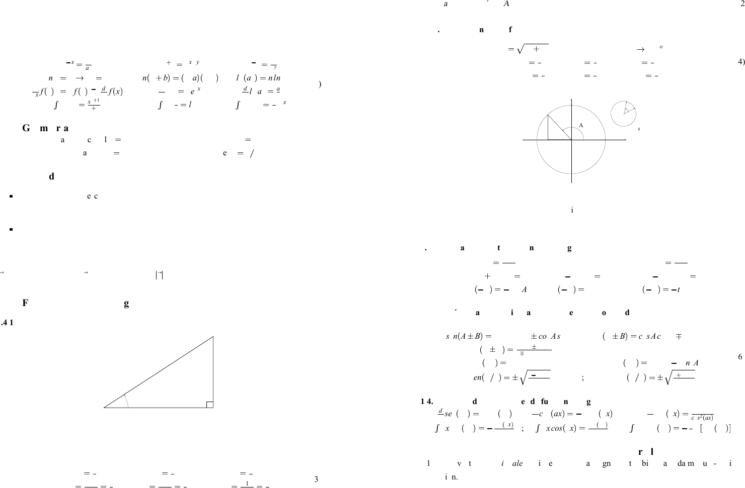 Departamento de Fı́sica Aplicada 1 1. Formulario Básico 1.1. Algunas relaciones matemáticas útiles a � x � 1 ax ; a x � y � axay ; ax � y � ax ay lna � A � eA � a ; ln � a � b � � �lna � � lnb � ; ln � an � � nlna d dx f � x � n � n f � x � n � 1 d dx f � x � ; ddx e ax � aeax ; ddx lnax � a x � dxxn � x n � 1 n � 1 ; � dx 1x � lnx ; � dxeax � 1ae ax (1) 1.2. Geometrı́a Área de un cı́rculo � πR2 ; Perı́metro de un cı́rculo � 2πR Área de una esfera � 4πR2 ; Volumen de una esfera � 4 3πR3 (2) 1.3. Tipos de magnitudes ESCALARES Se describen por completo con un número y la unidad correspondiente. Ejemplos: Temperatura, Masa, Carga eléctrica. VECTORIALES Además de la magnitud y la unidad requieren que se especifique una direccion. Ejemplos: Desplazamiento, Velocidad, Fuerza, Campo Eléctrico. Notación: Las cantidades vectoriales se representan en negrita (v) o con una flecha sobre ellos ( v). El módulo del vector v se indica como v ó � v � . 1.4. Fórmulas básicas de trigonometrı́a plana 1.4.1. Funciones trigonométricas en un triángulo rectángulo A C B c a b Figura 1: senA � ac ; cosA � b c ; tanA � a b cosecA � 1senA � c a ; secA � 1 cosA � c b ; cotanA � 1 tanA � b a (3) Departamento de Fı́sica Aplicada 2 1.4.2. Extensión de las fórmulas para ángulos mayores del ángulo recto r � � x2 � y2 2π rad � 360 senA � yr ; cosA � x r ; tanA � y x cosecA � ry ; secA � r x ; cotanA � x y (4) X Y A r y x O r r s α = s/r α Figura 2: 1.4.3. Relaciones entre las funciones trigonométricas tanA � senAcosA cotanA � cosA senA sen2A � cos2A � 1 ; sec2A � tan2A � 1 ; cosec2A � cotan2A � 1 sen � � A � � � senA ; cos � � A � � cosA ; tan � � A � � �tanA (5) 1.4.4. Fórmulas de adición, ángulo doble y ángulo mitad sen � A � B � � senAcosB � cosAsenB ; cos � A � B � � cosAcosB � senAsenB tan � A � B � � tanA � tanB 1 �tanAtanB ; sen � 2A � � 2senAcosA ; cos � 2A � � cos2A � sen2A sen � A 2 � � � � 1 � cosA 2 ; cos � A 2 � � � � 1 � cosA 2 (6) 1.4.5. Derivadas e integrales de funciones trigonométricas d dxsen � ax � � acos � ax � ; ddx cos � ax � � � asen � ax � ; ddx tan � ax � � a cos2 � ax � � dxsen � ax � � � cos � ax � a ; � dxcos � ax � � sen � ax � a ; � dxtan � ax � � � 1 a ln � cos � ax �� 1.5. Definiciones fundamentales en análisis vectorial 1. Dos vectores son iguales si tienen la misma magnitud -también llamada módulo- y direc- ción. Departamento de Fı́sica Aplicada 3 2. Si m es un escalar, entonces m A es un vector con módulo � m � veces el módulo de A y cuya dirección es la misma que la de A si m � 0 u opuesta si m � 0. 3. La suma, adición o resultante de dos vectores A y B es un vector C � A � B que se cons- truye haciendo coincidir el origen de B con el extremo de A y uniendo luego el origen de A con el extremo de B. Esta definición es equivalente a la regla del paralelogramo. El vector A � B se define como A � � � B � . A B C B A Figura 3: 4. Un vector unitario es un vector con módulo unidad. Si A es un vector cualquiera entonces a � A � A � es un vector unitario con la misma dirección que A. 5. Propiedades: Si A, B y C son vectores y α y β escalares, entonces A � B � B � A ; � A � B � � C � A � � B � C � ; α � β A � � �αβ � A � α � β � A � α A � β A ; α � A � B � � α A � α B (7) 6. Componentes de un vector: Un vector A se puede representar colocando su origen en el origen O de un sistema de referencia cartesiano. Si ı, j y k representan vectores unitarios cuya dirección es la dirección positiva de los ejes x, y y z entonces A � Ax ı � Ay j � Az k � (8) donde Ax, Ay y Az son las llamadas componentes de A. 1.6. Producto escalar Definimos el producto escalar de dos vectores A y B como un escalar igual a A � B � ABcos � α � � (9) donde α es el ángulo que forman los vectores A y B. Algunas propiedades del producto escalar son A � B � B � A ; A � � B � C � � A � B � A � C ; A � B � AxBx � AyBy � AzBz Departamento de Fı́sica Aplicada 4 1.7. Producto vectorial El resultado del producto vectorial de dos vectores A y B es un vector igual a A � B � ABsen � α � u � (10) donde α es el ángulo formado por A y B, y u es un vector unitario perpendicular al plano que forman los vectores A y B de tal manera que los vectores A, B y u forman un sistema dextrógiro. Algunas propiedades del producto vectorial son A C B α u Figura 4: A � B � � B � A ; A � � B � C � � A � B � A � C � A � B � � Área del paralelogramo con lados A, B. (11) A � B � �� �� �� �� �� �� �� � ı j k Ax Ay Ak Bx By Bz �� �� �� �� �� �� �� � � �AyBz � AzBy � ı � � AzBx � AxBz � j � � AxBy � AyBx � k (12)