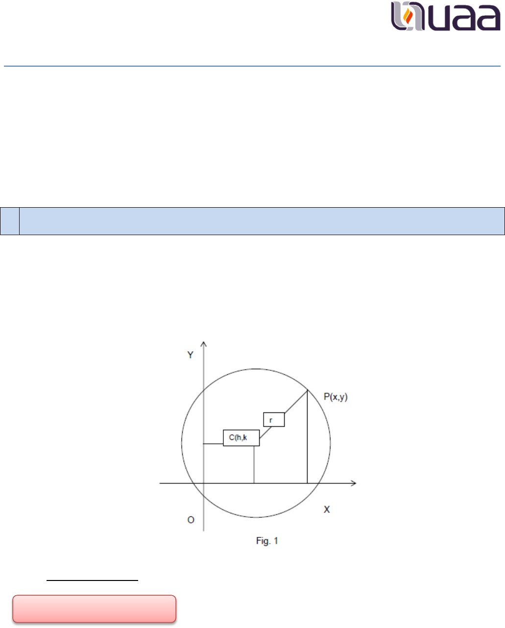MATEMÁTICAS III. GEOMETRÍA ANALÍTICA Unidad de Aprendizaje IV. Academia de Matemáticas 2015 UNIDAD DE APRENDIZAJE IV Saberes procedimentales Emplea de manera sistemática conceptos algebraicos, geométricos, trigonométricos y de geometría analítica. Relaciona la ecuación de segundo grado en dos variables con la gráfica de una circunferencia y viceversa. Interpreta los parámetros o elementos de la ecuación de la circunferencia. A Definición y elementos de la circunferencia La circunferencia es el lugar geométrico del conjunto de puntos equidistantes de un punto fijo, llamado centro. A la distancia fija de cualquier punto de la circunferencia al centro se le denomina radio (r). *( ) ̅̅ ̅̅ + Si en la figura 1, se considera el centro ( ) fijo (de coordenadas constantes) y el punto ( ) que gira alrededor de C, conservando la distancia constante, se tiene la gráfica de la circunferencia. Aplicando la fórmula para la distancia entre dos puntos se obtiene: √( ) ( ) Elevando al cuadrado ambos miembros ( ) ( ) (Ecuación de la circunferencia en forma ordinaria (1) Desarrollando los binomios al cuadrado y ordenando términos, se obtiene: MATEMÁTICAS III. GEOMETRÍA ANALÍTICA Unidad de Aprendizaje IV. Academia de Matemáticas 2015 Se observa que los términos cuadráticos tienen el mismo coeficiente; condición que caracteriza a la ecuación de la circunferencia. Si se hace: , , y , se obtiene una nueva forma de la ecuación: (2) A esta ecuación se le llama forma general de la circunferencia. Para utilizar la ecuación (1) se puede observar que se requiere conocer los valores de las coordenadas del centro y la longitud del radio. Elementos Asociados con la circunferencia RADIO: Es la distancia que existe entre el centro y la circunferencia; siempre es un valor constante para cada uno de los puntos que la forman. CUERDA: Segmento que une dos puntos de la circunferencia. DIAMETRO: Cuerda de mayor longitud que pasa por el centro y la divide simétricamente. Tiene un valor de dos radios. SECANTE: Recta que corta en dos puntos la circunferencia. TANGENTE: Recta que toca en un solo punto, llamado punto de tangencia a la circunferencia. El radio siempre es perpendicular a cualquier recta tangente. B Ecuación de la circunferencia con centro en el origen Si h = k = 0, es decir, cuando el centro de la circunferencia está en el origen de coordenadas (Figura 2), al sustituir en (1) se obtiene: (1A) Que es la ecuación de la circunferencia con centro en el origen, también conocida como ecuación ordinaria de la circunferencia. MATEMÁTICAS III. GEOMETRÍA ANALÍTICA Unidad de Aprendizaje IV. Academia de Matemáticas 2015 Figura 2 Ejemplos a) Escriba la ecuación de la circunferencia que tiene por centro el origen y que pasa por el punto A(6, 8) Solución: Se conocen las coordenadas del centro, pero no el radio, por lo tanto, de la ecuación (1A): sustituyendo (x,y) ( ) ( ) extrayendo la raíz cuadrada se obtiene Por lo tanto la ecuación pedida es ó . b) x 2 + y 2 = 9. Al comparar esta ecuación con la de la circunferencia, x 2 + y 2 = r 2 Se obtiene que r 2 = 9. Por consiguiente, r = √ = 3. Debido a la forma de la ecuación, las coordenadas del centro son C(0,0). Su grafica es esta: MATEMÁTICAS III. GEOMETRÍA ANALÍTICA Unidad de Aprendizaje IV. Academia de Matemáticas 2015 c) 4x 2 + 4y 2 = 9 Para encontrar el valor del radio, dividimos la ecuación entre 4, de tal manera que las variables tengan un coeficiente uno. x 2 + y 2 = Con esto sabemos que r 2 = , esto es r = , y las coordenadas del radio son C(0,0). Ejercicios 1. Encuentra la ecuación de la circunferencia con centro en el origen a. Si el radio es igual a 5 b. Si el radio es igual a √ c. Si el radio es igual a 8 d. Si el radio es igual 4 e. Radio igual a 1 f. Diámetro igual a 12 g. Pasa por el punto (0 , -9) h. Su diámetro une los puntos ( ) ( ) i. Radio √ 2.- Calcula el área y perímetro de las circunferencias cuyas ecuaciones son: a. x 2 + y 2 = 144 b. 9 x 2 + 9 y 2 = 36 c. 7 x 2 + 7 y 2 = 16 d. x 2 + y 2 = √ e. x 2 + y 2 = 1 MATEMÁTICAS III. GEOMETRÍA ANALÍTICA Unidad de Aprendizaje IV. Academia de Matemáticas 2015 3.- Indica si el punto: a. (4, -3) pertenece a x 2 + y 2 = 25 b. (12, 5) pertenece a x 2 + y 2 = 169 c. (-2, -7) pertenece a x 2 + y 2 = 1 d. (1, 1) pertenece a 10 x 2 +10 y 2 = 125 e. (-8, -6) pertenece a x 2 + y 2 = 100 C Forma ordinaria de la ecuación de la circunferencia. Forma General. Gráficas. Ecuación de la circunferencia con centro en cualquier punto. En el estudio de las cónicas consideramos las coordenadas del centro como h para la coordenada en el eje X y k para la coordenada en el eje y, es decir, C (h, k). Supón que se tiene un punto cualquiera P(x, y) en un plano cartesiano por donde pasa la circunferencia. Al encontrar la distancia entre el centro y este punto se obtiene el radio. E decir: √( – ) ( – ) Se elevan ambos miembros al cuadrado y se acomoda la ecuación ( ) ( ) A esta ecuación se le llama la ecuación canónica u ordinaria de la circunferencia (ecuación 1) y es la forma más sencilla de representar un lugar geométrico cuando el centro se coloca en cualquier punto del plano cartesiano. Ejemplos 1. Escriba la ecuación de la circunferencia que tiene su centro en C (3, 5) y su radio es igual a 8. Solución: Datos h = 3; k = 5 r = 8 Utilizando la ecuación 1 (x − 3)2 + (y − 5)2 = 64 (forma ordinaria) Desarrollando los binomios y simplificando, después de ordenar, se obtiene (forma general) En donde: D = −6, E = −10, F = −30 2. Escribir la ecuación de la circunferencia con centro en el punto de coordenadas C(-3, -2) y radio r= 5. Solución: Utilizando la ecuación (1) (x + 3 )2 + (y + 2)2 = 25 (forma ordinaria) Quitando paréntesis y reduciendo queda (forma general) En este ejemplo D = 6, E = 4, F = -12. MATEMÁTICAS III. GEOMETRÍA ANALÍTICA Unidad de Aprendizaje IV. Academia de Matemáticas 2015 Ejercicios Encuentra la ecuación de la circunf