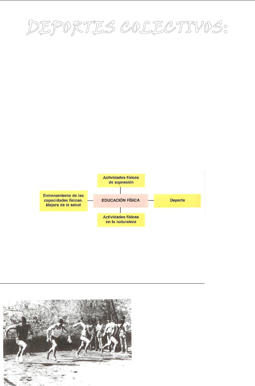 I.E.S. Fray Luis de León – Dpto. Educación Física Bachillerato 1 FFFFFFFFÚÚÚÚÚÚÚÚTTTTTTTTBBBBBBBBOOOOOOOOLLLLLLLL--------SSSSSSSSAAAAAAAALLLLLLLLAAAAAAAA I. EL CONCEPTO DE DEPORTE. EVOLUACIÓN HISTÓRICA. Un ERROR muy frecuente en el ámbito educativo es confundir la Educación Física con la práctica deportiva. Sin embargo hay que saber diferencia el Deporte como un contenido más de la Educación Física que contribuye a la educación mediante la actividad física, pero no es más importante que otros contenidos como la Condición Física, la Expresión Corporal, las actividades gimnásticas o en la naturaleza, etc., presentes en nuestras clases de Educación Física. El concepto de deporte ha ido variando con el discurrir del tiempo y la evolución de las sociedades en las que se ha desarrollado. De esta manera, hasta finales del siglo XIX su significado se relacionaba constantemente con la recreación. A partir de finales del siglo XIX la concepción comenzó a girar alrededor de la actividad competitiva con ejercicio físico y realizada con deportividad (respetando a las reglas y al contrario). Esta concepción está marcada por dos importantes acontecimientos, el primero de ellos protagonizado por Thomas Arnold, al introducir los juegos deportivos como un recurso educativo de los colegios ingleses dentro de un programa para fomentar las cualidades morales y el esfuerzo de sus alumnos en los terrenos de juego. Pretendía darles responsabilidad e iniciarlos en la vida social a través del deporte. Por los excelentes resultados obtenidos, las ideas de Arnold se extendieron pronto por todas las escuelas británicas de manera que en los horarios escolares se consagraron tres medias jornadas por semana al deporte. I.E.S. Fray Luis de León – Dpto. Educación Física Bachillerato 2 A finales del siglo XIX Pierre de Coubertin constituyó el Comité Olímpico Internacional con la intención de promover la práctica deportiva como medio de unión entre todos los hombres y mujeres. Por este motivo restauró los juegos Olímpicos modernos. Este fue otro factor que contribuyó a la extensión del deporte por todo el mundo. RASGOS DEFINITORIOS DEL TÉRMINO DEPORTE. Los rasgos que permiten extraer la esencia del deporte son: a) Situación motriz (ejercicio físico): el movimiento debe necesariamente estar presente y constituir una parte insustituible de la tarea. b) Juego: se da una participación voluntaria con propósitos de recreación y con finalidad en sí misma. c) Competición: se da un deseo de superación, de progreso, de rendimiento elevado, bien para superarse a sí mismo o bien para vencer al adversario. d) Reglas: para que exista deporte deben existir reglas que definan las características de la actividad y su desarrollo. e) Institucionalización: existe una institución, generalmente denominada federación que fija los reglamentos de juego y organiza los campeonatos. II. ANÁLISIS SOCIOLÓGICO DEL DEPORTE. Desde el punto de vista social, podemos distinguir entre deporte escolar, deporte- amateur o deporte para todos y deporte de alto rendimiento. • Deporte escolar: El deporte se utiliza como medio educativo, para mejorar la salud, como medio recreativo y como medio de mejorar de la relación social. • Deporte para todos: Actividad que cubre nuestro tiempo libre. Existe gusto por el deporte en sí, ya sea competitivo o recreativo. • Deporte de alto rendimiento: El deporte aquí se constituye en actividad profesional y medio de vida. Esta actividad cubre todo nuestro tiempo. DEPORTE EN EDAD ESCOLAR. La actividad deportiva contribuye al desarrollo del niño, la puesta a punto de su organismo y la mejora en la coordinación de movimientos. Las vivencias emocionales y cognitivas del deporte fomentan su inteligencia, desarrollando la facultad de observación, creatividad, capacidad de coordinación, sentido del equilibrio, el espacio y el tiempo, así como la actuación lógica. Además, también ayuda a superar complejos, y es socializante, al fomentar las relaciones con los demás. En el deporte infantil -denominado también deporte escolar o deporte educativo- se pretende que el mayor número posible de niños desarrolle de manera armónica sus capacidades físicas y psicomotoras. Según la edad del niño, la práctica de deporte tendrá I.E.S. Fray Luis de León – Dpto. Educación Física Bachillerato 3 una orientación más hacia el juego y la formación de las capacidades de base, o al aprendizaje de técnicas deportivas. Es una práctica gestionada por Colegios, Asociaciones deportivas, padres, etc, con el apoyo de las Instituciones, y no precisa de instalaciones complejas ni de coste elevado, pero sí de un personal humano -voluntario generalmente- que interviene en la organización. Las reglas se adaptan a cada edad y la competición es tan sólo un medio para mejorar día a día: lo importante es participar, respetando siempre la igualdad en categorías y edades. DEPORTE AMATEUR O DEPORTE PARA TODOS. En el modo de vida de la gente en las denominadas sociedades del tiempo libre, el deporte es algo más que una destacada forma de ocupación del ocio, pues sin dejar de ser un bien cultural universal, también se ha convertido en un producto de consumo. La práctica deportiva está íntimamente ligada a la calidad de vida y contribuye a mejorar la salud de las personas. Está demostrado que favoreciendo hábitos de vida que incluyan la práctica correcta y sistemática de una actividad físico-deportiva, el estado de salud de los habitantes de un país tiende a mejorar. Por estas razones, en la actualidad crece la demanda de una práctica deportiva donde la participación es más importante que la competición y donde no se busca el récord sino la mejora de las propias posibilidades de cada uno, o el contacto cordial con los demás. Las instalaciones deportivas no son tan necesarias como los recursos humanos, es decir, aquellas personas que voluntariamente 