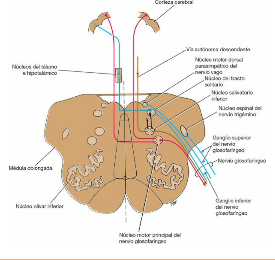 y una serie de núcleos hipotalámicos. Desde el tálamo, los axones de las células talámicas pasan a través de la cápsula interna y la corona radiada para terminar en la parte inferior de la circunvolución poscentral. La información aferente relacionada con la sensibilidad común entra en el tallo cerebral a través del ganglio superior del nervio glosofaríngeo, pero termina en el núcleo espinal del nervio trigémino. Los impulsos aferentes del seno carotídeo, un barorreceptor situado en la bifurcación de la arteria carótida común, también viajan con el nervio glosofaríngeo. Terminan en el núcleo del tracto solitario y están conectados con el núcleo motor dorsal del nervio vago. El reflejo del seno carotídeo que incluye los nervios glosofaríngeo y vago ayuda a la regulación de la presión arterial. Figura 11-16 Núcleos del nervio glosofaríngeo y sus conexiones centrales. 591 https://booksmedicos.org https://booksmedicos.org booksmedicos.org Botón1: