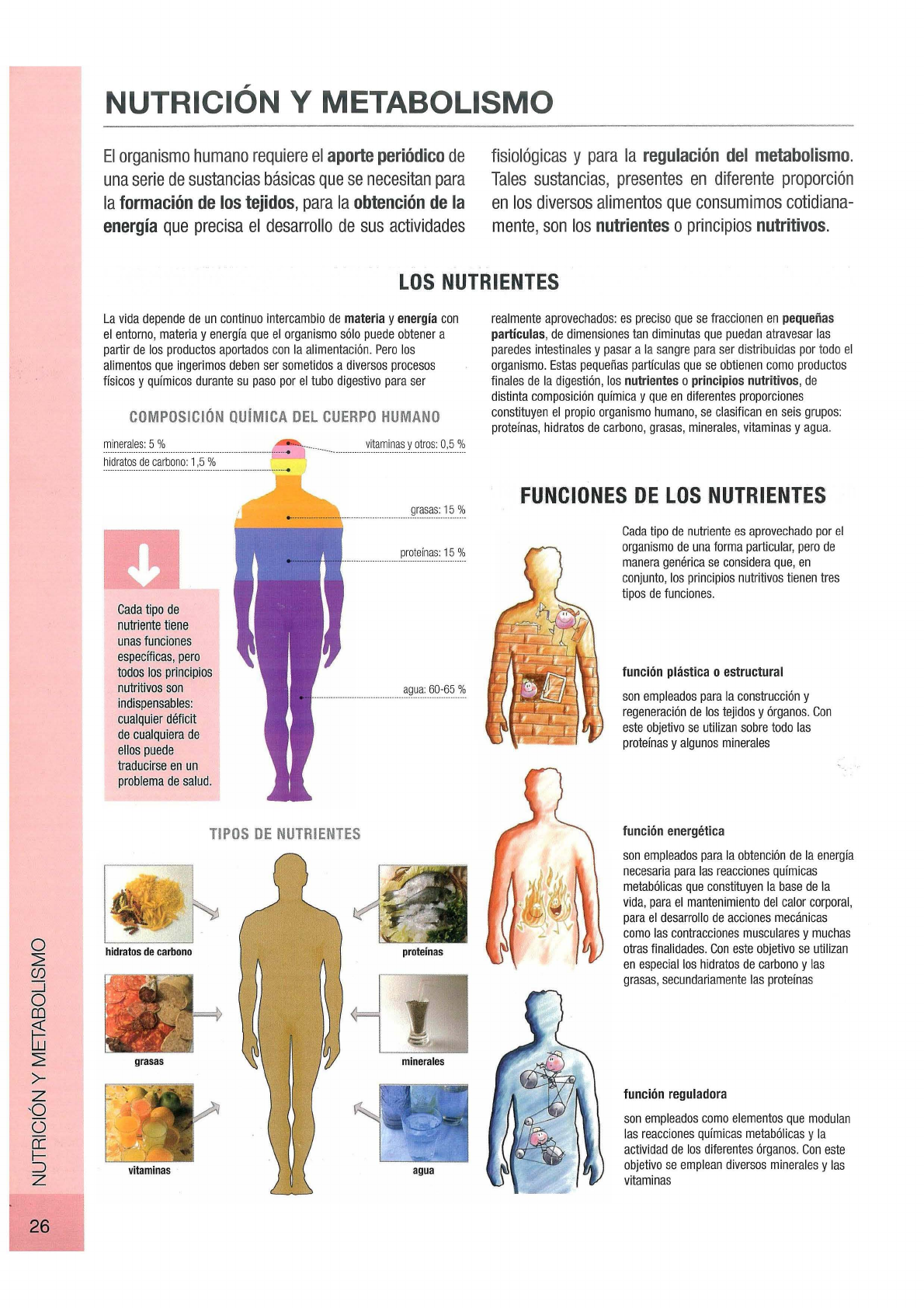 o 2 (f) -1 o co ~ 2 >- z '0 o a: f- ::J Z 26 NUTRICION Y METABOLISMO EI organismo humano requiere el aporte periodico de una serie de sustancias basicas que se necesitan para la formacion de los tejidos, para la obtencion de la energia que precisa el desarrollo de sus actividades fisiologicas y para la regulacion del metabolismo. Tales sustancias, presentes en diferente proporcion en los diversos alimentos que consumimos cotidiana- mente, son los nutrientes 0 principios nutritivos. LOS NUTRIENTES La vida depende de un continuo intercambio de materia y energia con el entorno, materia y energfa que el organismo solo puede obtener a partir de los productos aportados con la alimentacion. Pero los alimentos que ingerimos deben ser sometidos a diversos procesos fisicos y quimicos durante su paso por el tubo digestivo para ser GOMPOSIGION QUiMIGA DEL GUERPO HUMANO minerales: 5 % ------ ------------- ---- ---- ---_ .. __ .. _- ---------------............... ... . ....• hidratos de carbono: 1.5 % ---------- --------- ---- ------------- ._-----_ .. __ ........... - Cada tipo de nutriente tiene unas funciones especfficas, pero todos los principios nutritivos son indispensables: cualquier deficit de cualquiera de ellos puede traducirse en un problema de salud. TIPOS DE NUTRIENTES hidratos de carbono grasas vitaminas y otros: 0,5 % grasas: 15 % proteinas: 15 % realmente aprovechados: es preciso que se fraccionen en pequefias particulas, de dimensiones tan diminutas que puedan atravesar las paredes intestinales y pasar a la sangre para ser distribuidas por tOdD el organismo. Estas pequefias particulas que se obtienen como productos finales de la digestion, los nutrientes 0 principios nutritivos, de distinta composicion quimica y que en diferentes proporciones constituyen el propio organismo humano, se clasifican en seis grupos: proteinas, hidratos de carbono, grasas, minerales, vitaminas y agua. FUNCIONES DE LOS NUTRIENTES Cada tipo de nutriente es aprovechado por el organismo de una forma particular, pero de manera generica se considera que, en conjunto, los principios nutritivos tienen tres tipos de funciones. funci6n plastica 0 estructural son empleados para la construccion y regeneracion de los tejidos y organos. Con este objetivo se utilizan sobre tOdD las proteinas y algunos minerales funci6n energetica son empleados para la obtencion de la energia necesaria para las reacciones quimicas metabolicas que constituyen la base de la vida, para el mantenimiento del calor corporal, para el desarrollo de acciones mecanicas como las contracciones musculares y muchas otras finalidades. Con este objetivo se utilizan en especial los hidratos de carbono y las grasas, secundariamente las proteinas funci6n reguladora son empleados como elementos que modulan las reacciones quimicas metabolicas y la actividad de los diferentes organos. Con este objetivo se emplean diversos minerales y las vitaminas EL AGUA, ELEMENTO VITAL PROPORCION DE AGUA ORGANIGA EI agua es el principal componente del ser leta: 90 % recien nacido: 80 % nino: 70 % adulto: 60-65 % anciano: 55 % humano y de todos los seres vivos, un elemento fundamental para la vida tanto cuantitativa como cualitativamente: no solo es el componente mayoritario de nuestro cuerpo, sino que es indispensable porque todas las reacciones quimicas necesarias para la vida se desarrollan en un medio acuoso. EI agua se encuentra en el interior de todas las celulas (liquido intracelular), entre las celu las de los diversos tejidos (liquido intercelular) y en algunos compartimientos corporales (liquido extracelular), pues forma parte de la sangre, la linfa y las secreciones organicas. Mas de la mitad de la masa corporal del ser humane corresponde al agua, aunque la proporci6n disminuye a 10 largo de la existencia. BALANCE HiDRICO DEl ORGANISMO ADULTO MOll~CULA DE AGUA aporte alimentos: 1.100 ml .................................. == .. ~==~ bebidas: 1.100 ml -- ---------_ ... _- -- ---_ .. _-_ .. _-_ .. _-_ ... _--.. metabolismo: 300 ml ..... . . . ......... .... . ......... .. ==. . ~=:;:::::..~ total: 2.500 ml perdidas respiraci6n: 400 ml sudor: 450 ml hidr6geno hidr6geno heces: 150ml NECESIDADES DE AGUA orina: 1.500 ml total: 2.500 ml Si no se reponen las perdidas de agua, puede producirse un estado de deshidrataci6n que, en casas extremos, es incompatible can la vida. EI organismo pierde constantemente agua por diferentes vias: a traves de los desechos, con la orina y las heces; por la piel, con la sudoracion, y por los pulmones, con la respiracion. Las reacciones quimicas que se desarrollan en el organismo a partir del metabolismo de los hidratos de carbono, las proteinas y las grasas originan cierta cantidad de agua, lIamada agua endogena, unos 300 ml al dia en el adulto, pero esta cantidad no basta para reponer las perdidas. Es preciso, por 10 tanto, aportar la diferencia, y eso solo puede lograrse con la alimentacion: la lIamada agua exogena es proporcionada por las bebidas, constituidas fundamental mente por agua, y tam bien por los alimentos, que contienen agua en menor 0 mayor proporcion. Sin consumir nada de agua, sin beber ni comer nada, solo se puede sobrevivir alrededor de una semana, como mucho diez dias. Introducci6n Una maquina perfecta Piel Aparato digestivo • Aparato respiratorio Aparato circulatorio y sangre Sistema nervioso Aparato locomotor Aparato urinario :Sistema endocrino Sistema inmunol6gico Los sentidos Genetica Sistema reproductor Evoluci6n del cuerpo humane Indice allabetico de materias 27 o ~ Cf) --.J o CO ~ ~ >- z '0 o a: f- ::) Z 28 LOS HIDRATOS DE CARBONO, FUENTE DE ENERGiA Alimentos ricos en hidratos de carbono. FORMULA QUiMICA DE LOS HIDRATOS DE CARBONO carbona o oxigeno o hidrogeno carbo no oxigeno hidrogeno Tambien lIamados carbohidratos a glucidos, estos nutrientes, aunque forman parte de diversas estructuras del cuerpo, tienen sabre todo una funcian energlitica, pues el organismo los utiliza para obtener la energfa necesaria para 