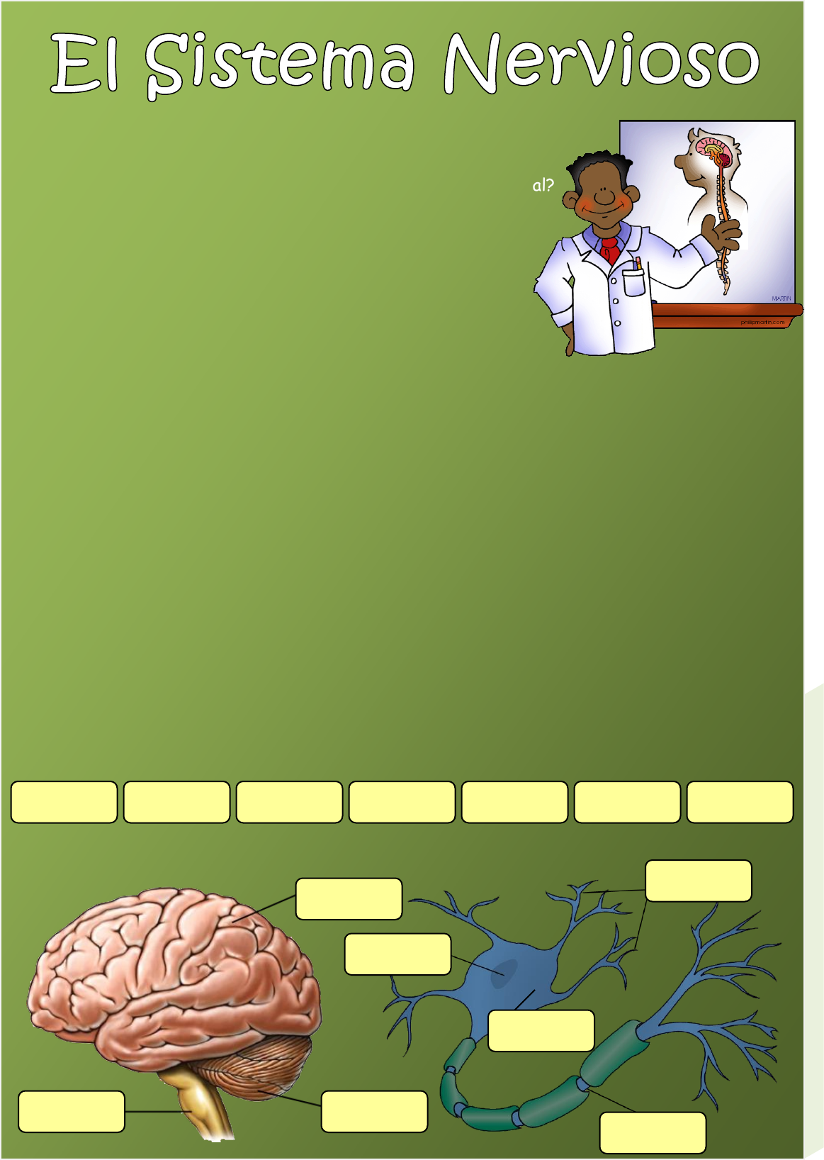 1. ¿En qué parte del sistema nervioso se encuentra la médula espinal? 2. ¿En qué parte del sistema nervioso se encuentran los nervios? 3. ¿En qué parte del sistema nervioso se encuentra el encéfalo? 4. ¿Cuáles son las partes que forman el encéfalo? 5. ¿Qué parte del encéfalo se ocupa de coordinar los movimientos y de mantener el equilibrio? 6. ¿Qué parte del encéfalo ordena los movimientos voluntarios? 7. ¿Qué parte del encéfalo controla el funcionamiento de los órganos del cuerpo? 8. Los nervios están formados por: 9. Las partes de la neurona son: 10. Coloca cada etiqueta en su lugar: NÚCLEO DENDRITAS CEREBRO AXON CEREBELO BULBO RAQUÍDEO CUERPO CELULAR 11. Coloca las etiquetas en su lugar correspondiente en el esquema: SISTEMA NERVIOSO CEREBELO MÉDULA ESPINAL CEREBRO SISTEMA NERVIOSO PERIFÉRICO NEURONAS BULBO RAQUÍDEO NERVIOS ENCÉFALO SISTEMA NERVIOSO CENTRAL