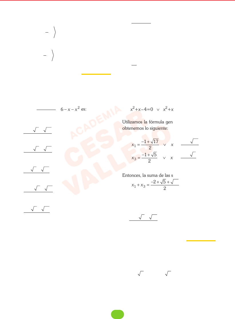 9 unI 2009 -IISolucionario de Matemática Luego, B=[0; +∞〉 ∴ A B\ ;= − 1 2 0 Respuesta A B\ ;= − 1 2 0 Alternativa D Pregunta N.º 10 La suma de todas las soluciones positivas de la ecuación 10 1 6 2 2 + + = − − x x x x es: A) − − +2 5 17 2 B) − + +2 5 17 2 C) 2 5 17 2 + + D) − + +3 5 17 2 E) 3 5 17 2 + + Solución Tema Ecuaciones fraccionarias Referencias Resolución de ecuaciones cuadráticas por el crite- rio de factorización y por fórmula general. Análisis y procedimiento Cambiando la forma de la ecuación convenien- temente, obtenemos 10 1 7 1 2 2 + + = − + +( ) x x x x Hacemos cambio de variable (incógnita). Sea y=1+x+x2; luego, en la ecuación tenemos que 10 7 7 10 02 y y y y= − ↔ − + = ↔ (y – 5)(y – 2)=0 ↔ y=5 ∨ y=2 Volvemos a la incógnita inicial x2+x+1=5 ∨ x2+x+1=2 x2+x – 4=0 ∨ x2+x – 1=0 Utilizamos la fórmula general para cada caso y obtenemos lo siguiente: x x x x 1 2 3 4 1 17 2 1 17 2 1 5 2 1 5 2 = − + ∨ = − − = − + ∨ = − − Entonces, la suma de las soluciones positivas es x x1 3 2 5 17 2 + = − + + Respuesta La suma de las soluciones positivas es − + +2 5 17 2 Alternativa B Pregunta N.º 11 Sea f una función tal que f x x x x−( ) = −( )2 2 4 , x ≥ 4, entonces Dom( f ) ∩ Ran( f ) es igual a: A) [0; ∞〉 B) [1; ∞〉 C) 〈0; ∞〉 D) [4; ∞〉 E) 〈1; ∞〉