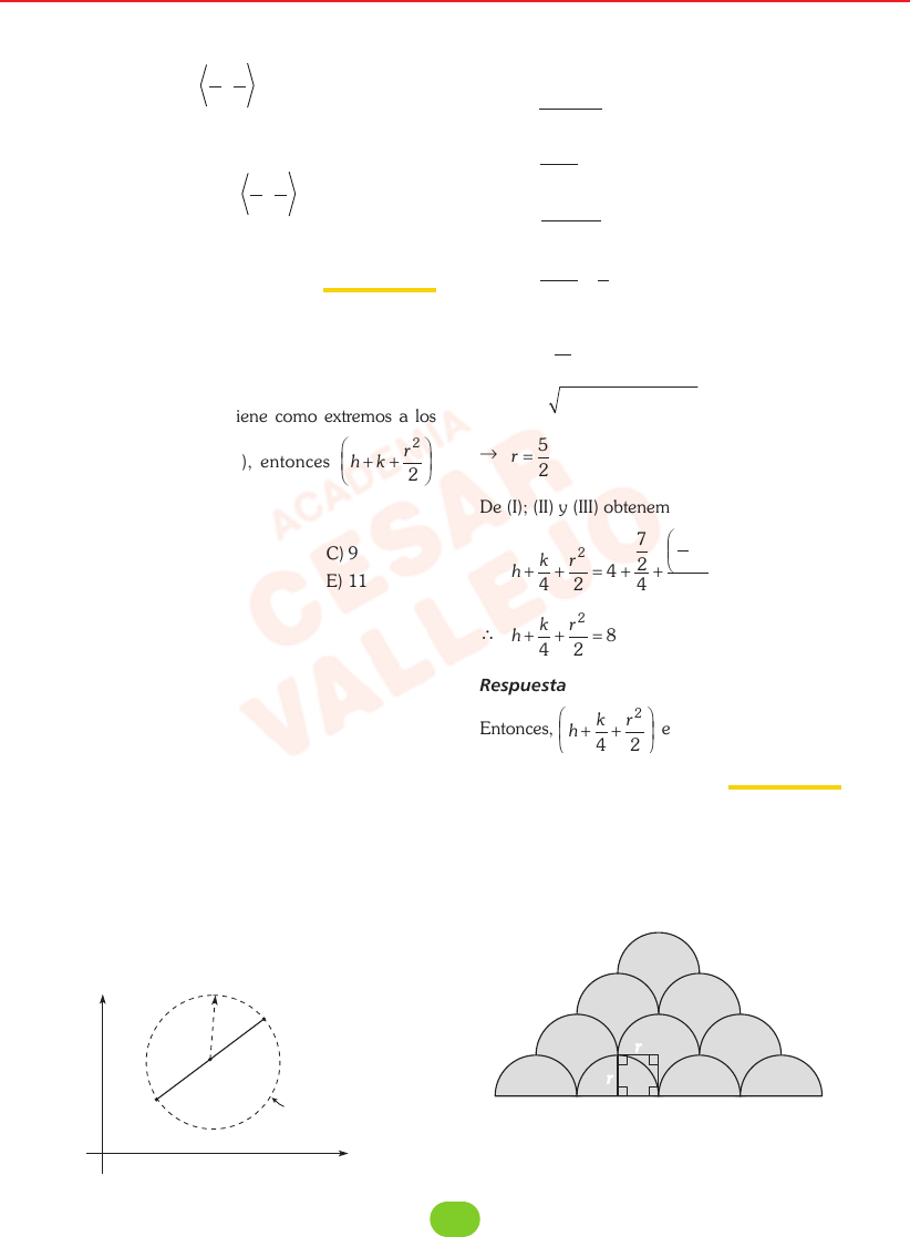 22 unI 2009 -II Academia CÉSAR VALLEJO Por lo tanto, x∈ 1 4 5 4 ; . Respuesta El conjunto es igual a 1 4 5 4 ; . Alternativa B Pregunta N.º 28 Si un diámetro de la circunferencia (x – h)2+(y – k)2=r2 tiene como extremos a los puntos (2; 2) y (6; 5), entonces h k r+ + 2 2 es igual a A) 7 B) 8 C) 9 D) 10 E) 11 Solución Tema Cónicas Referencias Ecuación de una circunferencia. Coordenadas del punto medio de un segmento. Análisis y procedimiento Graficamos la circunferencia: B (6; 5) A (2; 2) ( – ) +( – ) =x h y k r 2 2 2 O h k( ; ) r X Y Determinamos el centro de la circunferencia: h x xA B= + 2 → h = + =2 6 2 4 (I) k y yA B= + 2 → k = + =2 5 2 7 2 (II) Determinamos el radio: 2 r=dAB 2 6 2 5 22 2r = −( ) + −( ) → r = 5 2 (III) De (I); (II) y (III) obtenemos: h k r+ + = + + 4 2 4 7 2 4 5 2 2 2 2 ∴ h k r+ + = 4 2 8 2 Respuesta Entonces, h k r+ + 4 2 2 es igual a 8. Alternativa B Pregunta N.º 29 En la figura mostrada, el área de la superficie sombreada es r r A) (7+12p)r2 B) (10+12p)r2 C) (12+7p)r2 D) (2+12p)r2 E) (12+2p)r2