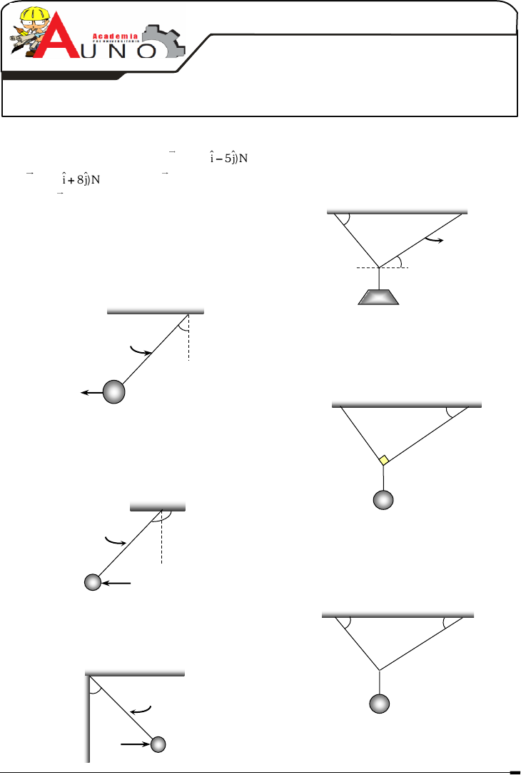 1 67 ESTÁTICA 01. (CEPRU 2015 – INT B) Sobre una partícula actúan tres fuerzas: 1F ( 8i 5j)N ; 2F (4i 8j)N y la fuerza 3F . El módulo (en N) de 3F , si la partícula está en equilibrio es: a) 5 b) 3 c) 1 d) 0 e) 7 02. En el sistema en equilibrio, determine la fuerza F si su masa es de 4 kg. 2 (g 10m/s ) a) 20 N b) 30 N c) 40 N d) 50 N e) 60 N 03. El sistema mostrado se encuentra en equilibrio. Determine el módulo de la fuerza F, la masa m = 50 kg. 2 (g 10m/s ) a) 50 N b) 60 N c) 250 N d) 500 N e) 800 N 04. Calcule la fuerza horizontal F, que mantiene a la esfera de 80 N de peso en reposo. a) 60 N b) 70 N c) 90 N d) 100 N e) 120 N 05. Si la tensión del cable "1" es de 400 N. Determine el peso del bloque, el sistema mostrado está en equilibrio. a) 200 N b) 300 N c) 400 N d) 450 N e) 500 N 06. Si la tensión del cable "1" es de 40 N. Determine el peso del bloque, el sistema mostrado está en equilibrio. a) 80 N b) 100 N c) 200 N d) 450 N e) 500 N 07. En el sistema en equilibrio. Calcule la suma de las tensiones en las cuerdas A y B. Si la masa del bloque es 6 kg. 2 (g 10m/s ) a) 60 N b) 74 N c) 84 N d) 90 N e) 120 N Ficha # 15 Física ord Con: Edwin Escalante Flores SOLO PARA INGENIEROS cuerda 45º F m 135ºcuerda F m 37º F cuerda m Cuerda(1)Cuerda(2) 37º 53º 60º (2)(1) (A) 53º (B) 37º Edwin Escalante Flores 2 08. El cuerpo de 10 kg de masa sube a velocidad constante, calcule la reacción de la pared sobre el bloque. 2 (g 10m/s ) a) 40 N b) 65 N c) 70 N d) 90 N e) 100 N 09. En el sistema en equilibrio el bloque de 30 kg de masa, sube a velocidad constante. Determine la diferencia entre el módulo de la fuerza F y el módulo de la reacción de la pared vertical. 2 (g 10m/s ) . (No hay fricción). a) 40 N b) 65 N c) 70 N d) 100 N e) 120 N 10. Determine el valor de F. para que el bloque mostrado de 600 N de peso suba por el plano inclinado con velocidad constante. (No hay fricción). a) 400 N b) 450 N c) 700 N d) 800 N e) 920 N 11. Calcule la fuerza "F" horizontal, que mantiene a la esfera mostrada de 24 N de peso en reposo. a) 10 N b) 15 N c) 18 N d) 20 N e) 25 N 12. En el sistema en equilibrio. Calcule la diferencia entre los módulos de la tensión de la cuerda y la reacción del piso sobre el bloque. Si la masa del bloque es 2 kg. 2 (g 10m/s ) . a) 4 N b) 6 N c) 7 N d) 9 N e) 10 N 13. En la figura mostrada el cuerpo pesa 50 N, se encuentra en equilibrio. Halle la deformación del resorte, que tiene una constante de rigidez K = 100 N/m (desprecie el efecto de rozamiento). a) 0,1 m b) 0,2 m c) 0,3 m d) 0,4 m e) 0,5 m 14. Si la esfera mostrada pesa 80 N. determine la fuerza de reacción en la pared vertical, el sistema mostrado está en reposo. (No existe rozamiento). a) 40 N b) 50 N c) 60 N d) 80 N e) 90 N 15. El sistema mostrado está en equilibrio. Calcule la reacción provocada en la pared vertical lisa sobre la esfera de 80 N de peso. m 0 45ºF 53º F m 37º F 37º F m 53º k m 37º 37º Edwin Escalante Flores 3 a) 40 N b) 50 N c) 60 N d) 80 N e) 90 N 16. En el siguiente sistema que se encuentra en equilibrio, la cuerda BC es horizontal. Determine la tensión de la cuerda CD. a) 5 N b) 6 N c) 7 N d) 8 N e) 9 N 17. El sistema de cuerdas se encuentra en reposo. Calcule la tensión de la cuerda T. el bloque P = 4 N. a) 6 N b) 7 N c) 8 N d) 9 N e) 12 N 18. Sabiendo que el conjunto de poleas imponderables (sin peso) logran equilibrar al bloque que pesa 600 N, se pide calcular la tensión en el cable más largo. a) 110 N b) 120 N c) 130 N d) 140 N e) 150 N 19. En el sistema mostrado, los bloques están en equilibrio. Si sus pesos son P = 60 N y Q = 40 N, calcule con qué fuerza se comprimen los bloques. Desprecie el peso de las poleas. a) 5 N b) 7 N c) 10 N d) 13 N e) 17 N 20. En el sistema mostrado, la fuerza que mantiene en equilibrio al bloque de 50 N de peso es F = 20 N. Calcule el peso de las poleas, si estas son iguales entre sí. a) 8 N b) 9 N c) 10 N d) 12 N e) 14 N 21 Sabiendo que el sistema mostrado está en reposo. Calcule la longitud del resorte sin deformar; F = 50 N; K = 40 N/cm. a) 2 cm b) 5 cm c) 7 cm d) 9 cm e) 12 cm 22. El bloque de 500 N de peso se encuentra en equilibrio apretando un resorte de constante de elasticidad k = 400 N/m. Calcule la deformación del resorte en cm. a) 12 b) 15 c) 23 135º A B C D 30º45º 4 N W 45º 60º T P Q 600N F liso37º F 8 cm 53º k F 80N liso P Q Edwin Escalante Flores 4 d) 25 e) 34 23. Sabiendo que el sistema mostrado está en equilibrio, calcule la deformación en cm del resorte cuya constante de elasticidad es k = 500 N/m. Se sabe además que A Bw 4w y no hay rozamiento. a) 12 cm b) 24 cm c) 13 cm d) 26 cm e) 14 cm 24. El sistema que se muestra está en reposo. ¿Cuál es la mayor masa que puede tener el bloque B de tal forma que se siga manteniendo el equilibrio? ( Am 12kg , polea(1)m 2kg , 2 g 10m/s ) a) 20 kg b) 22 kg c) 24 kg d) 25 kg e) 28 kg 25. Si el cuerpo se encuentra en reposo. Halle la fuerza de rozamiento. a) 5 N b) 10 N c) 15 N d) 20 N e) 30 N 26. Si el cuerpo se encuentra en reposo. Halle la fuerza de rozamiento. (W = 60 N). a) 10 N b) 20 N c) 30 N d) 40 N e) 50 N 27. Si el bloque está a punto de bajar, halle la fuerza F. (m = 2 kg; e 0,2 ; 2 g 10m/s ) a) 20 N b) 50 N c) 60 N d) 80 N e) 100 N 28. Un obrero sujeta un ladrillo y para que no caiga lo aprieta horizontalmente contra una pared vertical. ¿Qué fuerza mínima deberá ejercer, si el ladrillo pesa 20 N y el e entre la pared y el ladrillo es 0,4? a) 10 N b) 20 N c) 30 N d) 40 N e) 50 N 29. Halle el peso del bloque que se encuentra a punto de resbalar hacia abajo, donde F = 500 N y e 3/4 a) 200 N b) 300 N c) 400 N d) 450 N e) 600 N 30. Si el bloque está a punto de bajar. Halle la fuerza “F” (m = 5 kg; e 0,5 ; 2 g 10m/s ). a) 30 N b) 40 N c) 45 N d) 50 N e) 55 N A B 150N 37º g (1) A B W 53º 50 N 45º 30 2 N 25 N F 53º 37º F F