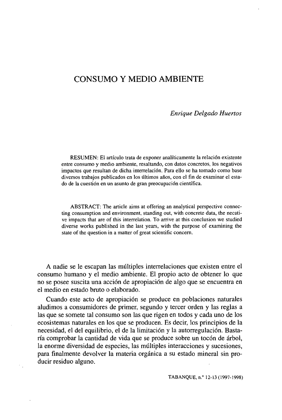 CONSUMO Y MEDIO AMBIENTE Enrique Delgado Huertos RESUMEN: El artículo trata de exponer analíticamente la relación existente entre consumo y medio ambiente, resaltando, con datos concretos, los negativos impactos que resultan de dicha interrelación. Para ello se ha tomado como base diversos trabajos publicados en los últimos años, con el fin de examinar el esta- do de la cuestión en un asunto de gran preocupación científica. ABSTRACT: The article aims at offering an analytical perspective connec- ting consumption and environment, standing out, with concrete data, the necati- ve impacts that are of this interrelation. To arrive at this conclusion we studied diverse works published in the last years, with the purpose of examining the state of the question in a matter of great scientific concern. A nadie se le escapan las múltiples interrelaciones que existen entre el consumo humano y el medio ambiente. El propio acto de obtener lo que no se posee suscita una acción de apropiación de algo que se encuentra en el medio en estado bruto o elaborado. Cuando este acto de apropiación se produce en poblaciones naturales aludimos a consumidores de primer, segundo y tercer orden y las reglas a las que se somete tal consumo son las que rigen en todos y cada uno de los ecosistemas naturales en los que se producen. Es decir, los principios de la necesidad, el del equilibrio, el de la limitación y la autorregulación. Basta- ría comprobar la cantidad de vida que se produce sobre un tocón de árbol, la enorme diversidad de especies, las múltiples interacciones y sucesiones, para finalmente devolver la materia orgánica a su estado mineral sin pro- ducir residuo alguno. TABANQUE, n.° 12-13 (1997-1998) 42 Enrique Delgado Huertos En cambio, cuando el acto de consumir tiene lugar en comunidades organizadas socialmente, tal hecho aparece regulado por normas distintas a las naturales. Las comunidades humanas, desde el mismo momento en que dejan de ser cazadoras y recolectoras para convertirse en productoras y almacenadoras de bienes y utillaje, comienzan a subordinar el medio a sus necesidades y, a partir de entonces, a explotarlo conforme a sus cre- cientes insumos, de manera que el medio natural deja de ser simplemente el entorno donde se desenvuelve la vida y pasa a ser el soporte y la princi- pal fuente de recursos. Ahora bien, no se trata de remontamos demasiado lejos para establecer claramente los vínculos entre consumo y deterioro ambiental. Las socieda- des industriales, a diferencia de las comunidades agrarias del pasado, han dado un salto cualitativo en materia de consumo; no se trata de abastecer o prever las necesidades humanas fundamentales, sino que el sistema consis- te en incitar el consumo tanto si es necesario como si es superfluo. Se trata de fundamentar la sociedad en la ideología del consumo, como proclama- ba un analista de ventas norteamericano, y recoge Alan Durning (1991), «Nuestra economía enormemente productiva, ...exige que hagamos del consumo nuestro modo de vida, que convirtamos la compra y el uso de mercancías en rituales y que busquemos nuestra satisfacción espiritual, la satisfacción de nuestro ego, en el consumo... Necesitamos que las cosas se consuman, se quemen, se gasten, se sustituyan y se desechen a un ritmo cada vez mayor». La lógica en la que se mueve el sistema consiste en aumentar perma- nentemente la producción, la productividad, en conquistar mercados y nuevas áreas de influencia comercial, con el objeto de incrementar los beneficios empresariales y de ese modo reproducir el propio sistema, un sistema cuyos valores se miden en términos monetarios, un sistema que poco tiene que ver con la construcción de un planeta sostenible. Es preci- samente en el fundamento del sistema donde radica el inexorable e impa- rable deterioro ambiental. Como dice Paul Hawken (1997). «Hemos reci- bido del mundo industrial una factura que casi no se puede pagar, por sus pasados y repetidos excesos». El modo de vida generado en las sociedades más industrializadas aso- cia el grado de bienestar con la capacidad de consumo, de tal modo que, desde el punto de vista individual, a mayor consumo mayor calidad de vida y viceversa. La perversión de la mentalidad consumista ha llegado al punto de minusvalorar los consumos de productos imprescindibles como los alimentos, el agua, la energía, el papel y los combustibles cuya presen- cia en el mercado es abundante y asequible; y, por otra parte, a considerar deseables e imprescindibles aquellos productos cuya principal característi- ca es la de su escasez y carestía (vehículos de gran cilindrada, pieles, apa- ratos acondicionadores de aire, jardines privados, viviendas de recreo, ves- timentas para animales, etc.). Consumo y Medio Ambiente 43 Así es posible comprender que socialmente sea un hecho aceptado el mal aprovechamiento y los despilfarros en materia de productos esenciales y, por contra, los exquisitos cuidados que se proporciona a los bienes más caprichosos. Además hay que tener en cuenta dos nuevas formas de consumo, por un lado, la extraordinaria capacidad de la industria para sacar al merca- do un volumen creciente de productos desechables (objetos de usar y tirar, envases, etc.), que por su escaso coste de producción y la irrespon- sabilidad sobre su destino final, permiten presentar el producto a pre- cios competitivos, como más acabado o mejor presentado, y aumentar el valor añadido del mismo, hecho que hay que asociar a la menor durabi- lidad general de los productos y al principio de la renovación automáti- ca de los mismos, fomentado por la publicidad y los grandes centros comerciales. Por otro lado, el ocio como consumo ha permitido extender los usos, costumbres y valores de las sociedades urbanas e industriales a todos los rincones del planeta, marcando con una impronta espacial altamente alte- radora, aquellos lugares que ofrecen a nuestros ojos productos de consumo abstracto como el so