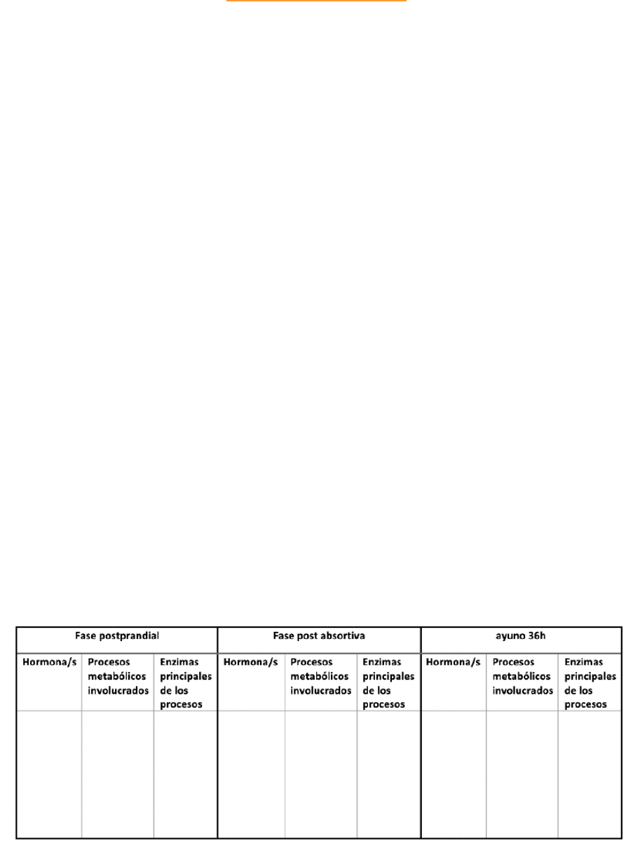 Clase de Metabolismo Guía de estudio 1. Fundamente la siguiente aseveración: “El mantenimiento de la glucosa plasmática dentro de límites bastante estrechos es de vital importancia para el organismo” a) ¿Qué tejidos son usuarios obligatorios de glucosa? b) ¿Qué tejidos son usuarios facultativos de glucosa? 2. Defina los procesos de Glucogenólisis, Gluconeogénesis; Glucólisis; Glucogenogénesis; Lipólisis; Síntesis de ácidos grasos; β-oxidación; Esterificación de ácidos grasos; Cetogénesis; Síntesis de proteínas; Desaminación y oxidación de aminoácidos; Proteolisis; Fosforilación oxidativa y Ciclo de Krebs. 3. ¿Qué hormonas se sintetizan en los islotes pancreáticos? Mencione los factores que regulan la síntesis y secreción de estas hormonas. 4. ¿En qué tejido ejercen sus acciones la insulina y el glucagón? ¿Qué acciones ejerce sobre los procesos definidos en el punto 2? 5. Enuncie las acciones de los glucocorticoides, las hormonas tiroideas, las hormonas de la médula suprarrenal y la hormona de crecimiento en el metabolismo de hidratos de carbono, proteínas y lípidos. 6. A partir del nacimiento el ser humano alterna períodos de ingesta y ayuno, cubriendo el gasto energético durante este último período mediante el consumo de reservas. Considerando las distintas adaptaciones metabólicas que ocurren en los estadios de ayuno respecto del estado postprandial, complete el siguiente cuadro indicando: a) Las hormonas están involucradas en cada situación b) Los procesos estimulados por dichas hormonas. ¿En qué tejidos ocurren estos procesos? c) Las enzimas principales cuya función se ve modificada para llevar a cabo esos procesos 7. Explique cómo se mantiene la glucemia durante un ayuno de 24 hs. ¿Qué es el efecto Randle? 8. ¿Qué adaptación metabólica ocurre en el tejido nervioso luego de un período de inanición prolongada? 9. Defina cociente respiratorio (CR). ¿Cuál es su valor cuando los hidratos de carbono son los únicos sustratos que se están oxidando? ¿Y cuándo se están oxidando los ácidos grasos? Explique cómo varía el CR durante el ayuno en los tejidos nervioso y muscular. 10. Explique la función que desempeña el hígado en la cetogénesis. 11. ¿Cuál es la función del ciclo de la urea? ¿Dónde se realiza? 12. ¿Cómo se ve afectado el transporte de glucosa en diferentes tejidos en estas situaciones? a) Cuando aumentan los AGNE (ácidos grasos no esterificados) plasmáticos. (Relaciónelo con el efecto Randle) b) Durante el ejercicio muscular. c) En el ayuno. d) Cuando aumenta la adrenalina circulante. e) Frente a un aumento de glucocorticoides circulantes. 13. a) ¿Cómo se realiza la Prueba de Tolerancia Oral a la Glucosa (PTOG)? b) ¿Por qué la glucosa administrada por vía oral posee mayor efecto que la endovenosa sobre la secreción de insulina? c) ¿Es aconsejable realizar la PTOG en un individuo con franca hiperglucemia en ayunas? Actividades para el Seminario 1. Rutas metabólicas a) Identifique las rutas del metabolismo intermedio descritas en la figura 1, colocando el número en el círculo correspondiente. ¿Cuáles de estas vías metabólicas son anabólicas y cuáles catabólicas? 1.Glucogenólisis; 2. Gluconeogénesis; 3. Glucólisis; 4. Glucogenogénesis; 5. Lipólisis; 6. Síntesis de ácidos grasos; 7. B-oxidación; 8. Esterificación de ácidos grasos; 9. Síntesis de aminoácidos; 10. Síntesis de proteínas; 11. Desaminación y oxidación de aminoácidos; 12. Proteólisis; 13. Fosforilación oxidativa; 14. Ciclo de Krebs Proteínas→ al degradarlas obtenemos los AA à materia prima para generar glucosa u otros componentes cuando se encuentra en baja proporción. Siguiendo la flecha luego de que los AA son degradados obtenemos NH3 y urea eliminada a través de la orina. Por otro lado, el producto de degradación de AA, NADH, priuvato y Acetil CoA • Polisacáridos → por el proceso de glucolisis obtenemos GLUCOSA, esta se convierte en piruvato + Acetil CoA y pasa al ciclo de Krebs. Hay varias flechas que van hacia el ciclo de Krebs porque en caso de no tener glucosa, se van a utilizar otros componentes para la obtención de energía. Funcionaria como un punto de contacto, el Acetil CoA puede provenir disntias vías, donde la principal es a partir de la glucosa, pero puede provenir también de AA y ácidos grasos. • Grasas→ obtengo ácidos grasos y estos se degradan por lipolisis (lisis de lípidos) y luego sufren beta oxidación para la generación de Acetil CoA. A partir del Acetil CoA puedo ingresar en el ciclo de Krebs o sufrir lipogénesis para la formación de ácidos grasos. Beta oxidación→ Es un proceso de varias fases, elimina un fragmento de 2 carbonos del extremo de un acil-CoA y libera el fragmento en forma de acetil-CoA. Este proceso también libera un dinucleótido de flavina y adenina reducido (FADH2), un NADH y el resto de la cadena acilo (que comienza con el carbono β original), que sirve como punto de partida para el siguiente ciclo. La β-oxidación continúa hasta que consume toda la cadena de AG. Se produce en la matriz mitocondrias de los hepatocitos en el hígado. 2. Metabolismo de la glucosa: Glucólisis aeróbica vs gluconeogénesis Analice la figura 2 y responda: Glucolisis: degradación de glucosa en piruvato Gluconeogénesis: Síntesis de glucosa a partir de sustancias no glucosídicas. a) ¿Qué diferencias encuentra entre la vía de la glucólisis y la gluconeogénesis?, ¿Cuáles son sus principales puntos de control? La glucólisis→ proceso catabólico por el cual se convierte la molécula de glucosa de 6 carbonos en dos moléculas de 3 carbonos de piruvato. La degradación de glucosa en piruvato puede producirse en presencia de O2 (glucólisis aeróbica) o en ausencia de O2 (glucólisis anaeróbica). De la energía producida o liberado durante este proceso la célula puede retener la suficiente para producir directamente 2 moles de ATP por cada mol de 