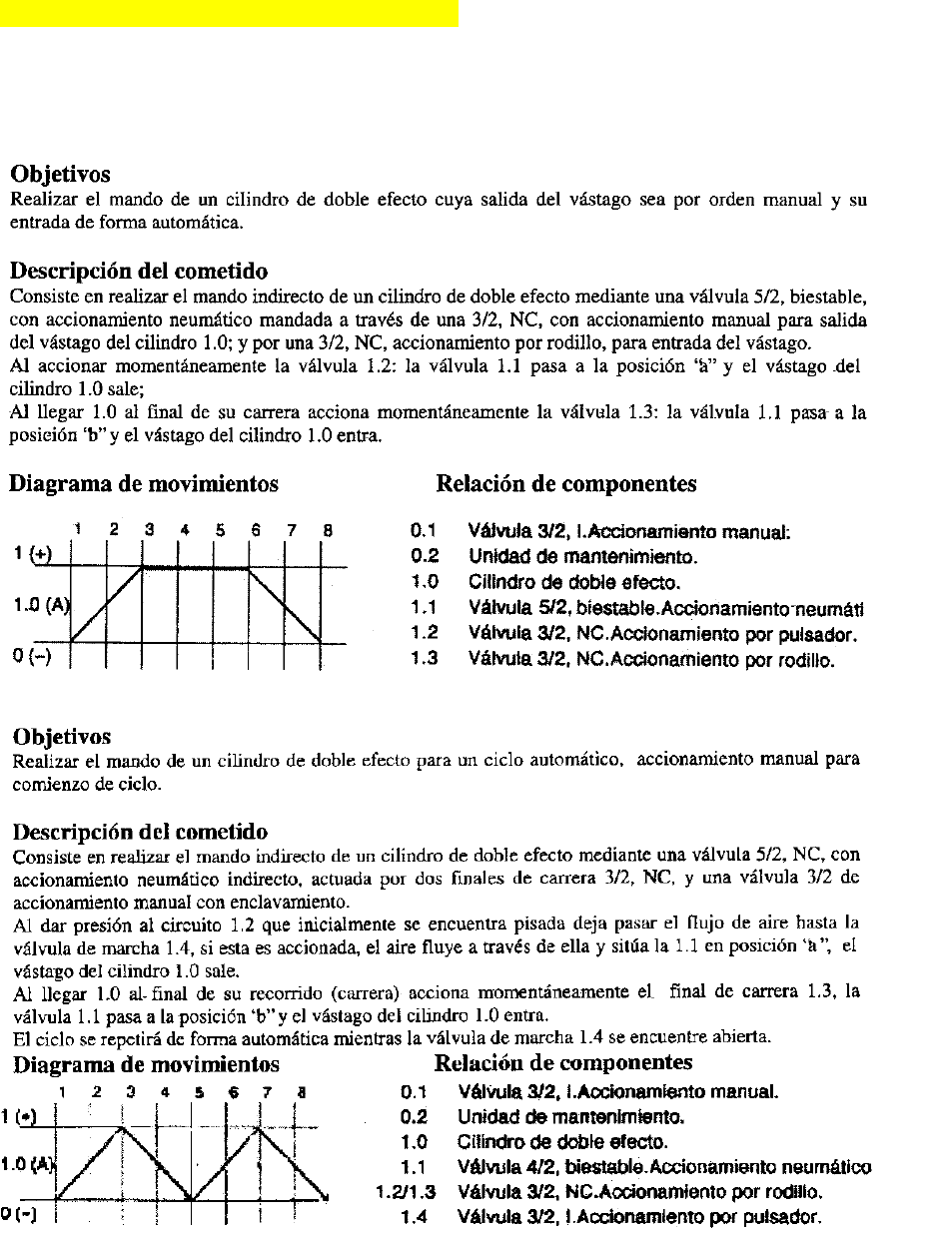 17 e 18.INI.Ciclo semiautomatico; ciclo automático. Fanse as dúas prácticas nun arquivo do Automation Hai que ter coidado a hora de enlazar os sensores de posición coas levas xa que hai 2 A1 no mesmo arquivo. 17 18 A1 A11.0 1.021.01 P R A A B R SP P R A 1.1 1.31.2 A0 A1 A11.0 1.021.01 P R A A B R SP P R A 1.1 1.31.4 P R A 1.2 A0 19.INI.Ciclo automático con retroceso temporizado A11.0 1.021.01 A B R SP 1.1 A0 A0 A1 1.5 1.3 1.2 1.4 1.6 1.8 1.10 A A RP P R P R A A P A P R R 20.INI.mando alternativo 1.3 1.0 1.021.03 A B R SP 1.01 A B1.1 P R A1.2 1.4