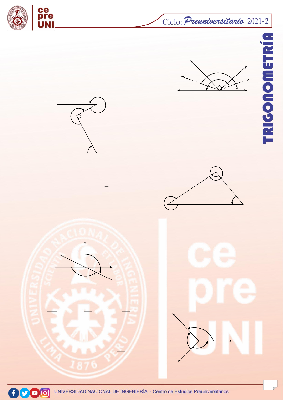 - 1 - TRIGONOMETRÍA SISTEMA DE MEDIDAS ANGULARES 01. Si ABCD es un rectángulo, determine . A) 0 B) 1 2 vuelta C) 1 vuelta D) 3 2 vuelta E) 2 vueltas 02. De la figura, se sabe que: 8a + 9b = 0, calcule la medida del ángulo aº, expresado en rad. A) 11 12 B) 5 6 C) 3 4 D) 2 3 E) 7 12 03. En la figura mostrada OP es bisectriz del ángulo AOB y OQ es bisectriz del ángulo COD. ¿Cuál de las siguientes relaciones entre y es correcta? A) 300º B) 300º C) 315º D) 315º E) 330º 04. Según la figura mostrada, ¿cuál es la ecuación que relaciona a los ángulos , y ? A) 180º B) 180º C) 180º D) 180º E) 360º 05. En la figura mostrada, el valor de se expresa como: Rx xx ; 196 1500 2 Si toma su máximo valor, calcule . A D B C aº bg O D A P B C Q 1 3 vuelta º g - 2 - A) – 105 B) – 120 C) – 135 D) – 145 E) – 1500 06. Dos ángulos complementarios tienen la siguiente relación: el triple del número de grados sexagesimales del menor, es igual al número de grados centesimales del mayor. Calcule el producto de 37 por el número de grados centesimales del menor ángulo. A) 800 B) 1000 C) 1200 D) 1400 E) 1500 07. Sean S y C los números que representan la medida de un mismo ángulo en los sistemas sexagesimal y centesimal, que cumplen la relación: 22 22 baba baba SC a y b positivos, calcule el máximo valor de este ángulo expresado en radianes. A) 380 B) 360 C) 200 D) 180 E) 150 08. Las raíces de la ecuación: 2x 2ax 360 0 Tienen como raíces a S y C. Si a la vez, S y C son los números que expresan la medida de un mismo ángulo en grados sexagesimales y centesimales, calcule a positivo. A) 18 B) 19 C) 20 D) 21 E) 22 09. Se crea un nuevo sistema de medición angular, el cuál tiene como unidad fundamental al grado n, denotado por 1n que es equivalente al ángulo que se expresa como el menor número entero en los sistemas sexagesimal y centesimal. Calcule el ángulo de 8n expresado en radianes. A) 10 B) 5 C) 3 10 D) 2 5 E) 2 10. Siendo S y C los números que representan la cantidad de grados sexagesimales y centesimales que contiene un ángulo, los cuales verifican: 7 71 1S 45 x y C 20 x 5 2 Calcule la medida de dicho ángulo en radianes. A) 2 B) 5 C) 10 D) 15 E) 20 11. Dado el ángulo trigonométrico , tal que: g 2 3º5' 5º7' 7º9' 9º11'...55º57' xyyx Determine el número de grados centesimales del complemento del ángulo (2xy + y2)º. A) 20 B) 27 C) 30 D) 63 E) 70 12. Si es un número entero de grados sexagesimales y esta expresado por la siguiente sumatoria: 1º1' 2º2' 3º3' 4º 4' ... nºn' - 3 - Calcule n para cuando toma su menor valor. A) 14 B) 15 C) 16 D) 17 E) 18 13. Si se cumple que: 11(0,02q – 3p)p = 19(0,02q+2p) siendo p y q, los números de minutos sexagesimales y segundos centesimales de un mismo ángulo respectivamente, calcule p. A) 13 B) 14 C) 15 D) 19 E) 22 14. Si o ' ''g m o m x x yº y ' rad ab2 1'c2'' x y ' 15º Calcule a + b + c A) 1 B) 2 C) 3 D) 4 E) 5 15. Siendo S, C y R los números de grados sexagesimales, centesimales y radianes de un mismo ángulo, determine la medida de dicho ángulo, si se cumple: 1416,583 2 RS C 720)400)360)180)180) EgDgCBgA 16. Si se cumple: (S + C)3 = C4 – SC3, siendo S y C los números que representan la medida de un ángulo en los sistemas sexagesimal y centesimal respectivamente. Calcule C. 1000 219 ) 100 319 ) 10 319 ) 10 219 ) 10 19 ) EDCBA 17. La hora que indica un reloj de pared es: 5 horas “a” minutos, “b” segundos Si las agujas del minutero y horario forman un ángulo recto, calcule 11b a ; si a < 30. A) 50 B) 60 C) 80 D) 100 E) 120 LONGITUD DE ARCO.ÁREA DE SECTOR Y TRAPECIO CIRCULAR 18. Calcule el área sombreada si OE = AC = OF = DB. A) a 2b B) 2b a C) ab D) 2ab E) 4ab 19. De la figura mostrada, calcule (en u) el perímetro de la región sombreada. A) 5 2 3 9 B) 4 3 3 16 O F A B 4b D E C a C D A B 9 u 3 u - 4 - C) 10 6 3 18 D) 2 3 15 E) 4 6 3 9 20. Del gráfico mostrado AOB y MON son sectores circulares, calcule el área del sector AOB. A) 18 B) 20 C) 24 D) 26 E) 28 21. Una brida del acople de un eje tiene 3.05 m de diámetro. Si un punto del borde de la brida se mueve con una velocidad lineal de 13.72 m/s. Determine la velocidad angular de la brida en rev/s. A) 2.3 B) 3.4 C) 5.7 D) 7.8 E) 9 22. Un agricultor desea cercar un terreno que es de forma de sector circular con una malla de 20 m de longitud. Calcule (en m2) el área máxima que se puede cercar con dicha malla. A) 20 B) 23 C) 25 D) 28 E) 30 23. El perímetro de un sector circular es de 120 cm, calcule (en cm) la longitud del arco si el área del sector circular es máxima. A) 20 B) 30 C) 40 D) 50 E) 60 24. Una cartulina circular de radio igual a 27 u se divide en 3 sectores circulares iguales, con uno de los sectores se construye un cono. Calcule la altura del cono resultante. A) 6 3 B) 10 2 C) 16 D) 18 2 E) 15 3 25. Del gráfico mostrado AOB y COD son sectores circulares. Calcule x A) 4 B) 5 C) 6 D) 7 E) 8 26. Del gráfico, calcular la longitud del arco ABMCD. A) 8 3 B) 10 3 C) 13 3 D) 14 3 E) 16 3 O A B N M 7A 3A - 2 O D C B A 6 x – 2 x + 1 2 A D 6 C 2 M 2 6 B - 5 - 27. Del gráfico AOB y COD son sectores circulares siendo S área calcule: x y A) 6 2 2 B) 12 3 3 C) 15 3 3 D) 10 2 2 E) 13 3 28. Halle (en u2) el área de la región sombreada, si AB = 16 u. A) 4 B) 8 C) 12 D) 16 E) 20 29. Del gráfico, AOB, COD y EOF son sectores circulares, OE = 3 y ED = 1, S1 = S2 = 3 4 u2. Calcule el área de CDEF. A) 3 6 B) 9 5 C) 13 2 D) 7 12 E) 20 3 30. Del gráfico, calcule el área del sector circular AOB. A) 10 B) 12 C) 14 D) 16 E) 18 31. En la figura, AOB, COD y EOF son sectores circulares. Si el área del sector circular AOB y las áreas de los trapecios circulares ABDC y CDFE están en progresión aritmética, halle el valor de 2 2 2 c a b . O A B E c u b u a u B D F O A D C B x 2S y 3S M A B N O F C A S2 S1 E D B A D O B 2 - 6 - A) – 3 B) 1 3 C) 1 3 D) 3 E) 1 32. En la figura, AOB y COD son sectores circulares. El área de trapecio circular ABCD 