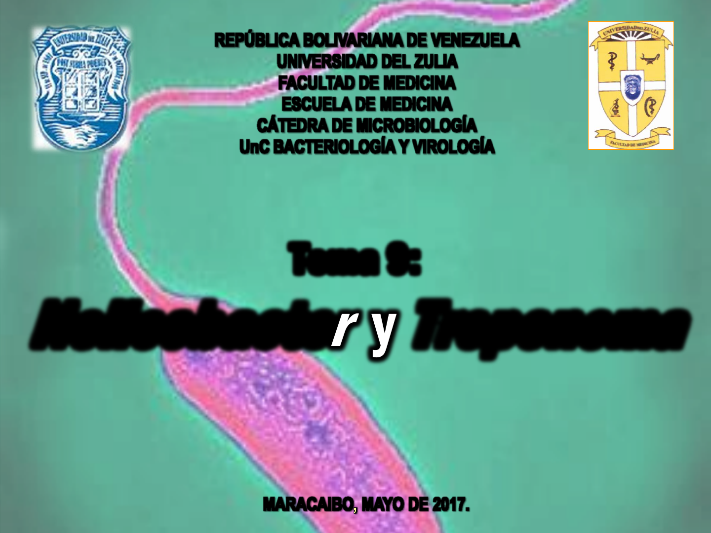 REPÚBLICA BOLIVARIANA DE VENEZUELA UNIVERSIDAD DEL ZULIA FACULTAD DE MEDICINA ESCUELA DE MEDICINA CÁTEDRA DE MICROBIOLOGÍA UnC BACTERIOLOGÍA Y VIROLOGÍA Tema 9: Helicobacter y Treponema MARACAIBO, MAYO DE 2017. • Helicobacter • Sulfuricurvum • Sulfurimonas • Sulfurovum • Thiovulum • Wolinella Familia Helicobacteraceae • 32 especies • H. pylori Género Helicobacter CARACTERÍSTICAS GENERALES • Son bacilos Gram negativo, curvos o espirales, de 0,3 a 1,0 µm de ancho y 1,5 a 10,0 µm de largo. • No formadores de esporas. • Son móviles. Usualmente poseen ocho flagelos únicos o múltiples flagelos bipolares. H. pylori múltiples flagelos monopolares. CARACTERÍSTICAS GENERALES • Son microaerofílicos. Requieren atmósfera húmeda mantenida a 37°C. • Son oxidasa positiva. • Son relativamente inactivos con respecto a los CHO. • Algunos el estómago y otros el intestino y tracto hepatobiliar de mamíferos y aves. • NICHOS (estómago) y (intestino, hígado o bilis). HÁBITAT NATURAL HÁBITAT NATURAL Habitan el estómago, dentro o debajo de la capa de moco adyacente al epitelio. Raramente invaden la circulación sanguínea (a diferencia de los helicobacter enterohepáticos). H. pylori puede en ocasiones estar intracelularmente. H. pylori coloniza el cardias, cuerpo y antro (porción distal) del estómago humano. Los helicobacter gástricos pueden encontrarse transitoriamente en áreas de metaplasia gástrica del duodeno, jugo gástrico (vómito), saliva y heces. HÁBITAT NATURAL Intestino y tracto hepatobiliar de mamíferos y aves. Han sido aislados de: hisopados rectales, heces, sangre y otros sitios extraintestinales. PROPIEDADES ANTIBACTERIANAS DEL ESTÓMAGO 1. Acidez gástrica 2. Lactoferrina 3. Péptidos antibacterianos (LL-37, ß-defensin 1, and ß- defensin 2). 1) Inhibición de la producción de ácido (proteína bacteriana) 2) Neutralización de los ácidos gástricos (ureasa bacteriana). 3) Flagelo movilidad que permite la penetración de la capa de moco. 4) Proteínas de la membrana externa BabA, SabA, AlpA, AlpB, y HopZ median la adherencia a las células epiteliales gástricas. Proteína de shock térmico (HspB): incrementa la actividad de la ureasa. Movilidad para atravesar la mucosidad gástrica y adherirse a las células epiteliales. El daño tisular localizado: ureasa, mucinasa, fosfolipasas y citotoxina formadora de vacuolas y lipopolisacárido lesión de células epiteliales y respuesta inflamatoria. Superóxido dismutasa y catalasa: protege de la fagocitosis y de la muerte intracelular. Estímulo de secreción de interleucina 8 (IL-8), síntesis del factor activador de plaquetas (hipersecreción de ácido gástrico) y muerte programada de las células epiteliales gástricas. Principales características bacteriológicas de H. pylori que ocasionan gastritis Sistema de secreción por inyección VacA Ureasa VacA: CITOTOXINA VACUOLANTE • Causa apoptosis • Formación de múltiples vacuolas citoplasmáticas, por la producción de canales en las membranas lisosómica y endosómica. • Alteración de la función de Linfocitos T. Isla de patogenicidad (PAI) con más de 30 genes que codifica los elementos de un SISTEMA DE SECRECIÓN POR INYECCIÓN inyecta VacA y CagA CagA: induce cambios en diversas proteínas celulares. Poderosa asociación con la virulencia (reorganización del citoesqueleto de actina, estimulación de citocinas y proteína que recluta neutrófilos). Tomado de: Ryan y col. Sherris Microbiología Médica. 2013. McGraw Hilla 6ta edición. La infección primaria puede ser asintomática. La infección aguda puede producir una enfermedad del tubo digestivo alto con náusea, dolor epigástrico, vómito y fiebre, anorexia, eructos. Síntomas agudos una a dos semanas La infección persiste por años, decenios o durante toda la vida. GASTRITIS, ÚLCERA GÁSTRICA Y ÚLCERA DUODENAL (ENFERMEDAD ULCEROSA PÉPTICA) FACTOR DE RIESGO PRINCIPAL DE CÁNCER GÁSTRICOse desconocen los mecanismos específicos de la carcinogénesis CagA Gastritis por H. pylori CagA + es un antecedente de Adenocarcinoma gástrico (una de las causas de muerte por cáncer más comunes en el mundo). También se ha vinculado con Linfoma del Tejido Linfoide asociado con la mucosa (MALT). Prominente inflamación de la mucosa en gastritis crónica activa (antro) + hiperacidez y enfermedad ulcerativa duodenal. Síndromes abdominales recurrentes (dispepsia no ulcerativa). Duodenitis úlceras duodenales 16%. Pangastritis atrófica multifocal. GASTROENTERITIS HUMANA BACTERIEMIA 1994 International Agency for Research on cancer working group of the WHO: H. pylori GRUPO I CARCINÓGENO HUMANO 50% de la población mundial está infectada con H. pylori. La mayoría de las personas adquieren la infección en la niñez y la infección persiste durante toda la vida la colonización aumenta con la edad. Los niños son los principales amplificadores de la bacteria. Se desconoce el modo exacto de transmisión Se asume que es de persona a persona por la ruta fecal- oral O por el contacto con las secreciones gástricas •Mayoría de niños ≈10 años. •80-90% de adultos Países en vías de desarrollo •↓ prevalencia en niños •40-50 % adultos Países desarrollados H. pylori es exclusivo de los humanos. No se ha confirmado si los animales domésticos sirven como reservorio para la infección humana. La IgG o la IgA permanecen elevadas siempre que persista la infección valiosas para la detección y evaluación terapéutica Diagnóstico más sensible: exploración endoscópica con biopsias y cultivos de la mucosa gástrica. Ventaja de la detección directa del organismo cultivo susceptibilidad a los antibióticos Métodos no invasivos: serología y una prueba de urea en aliento. Muestras SANGRE HECES BIOPSIAS GÁSTRICAS JUGOS GÁSTRICOS H. pylori raramente aislado en sangre. H. pylori raramente aislado de heces humanas a ≠ de Campylobacter. “MUESTRA IDEAL” Ensayo rápido de 