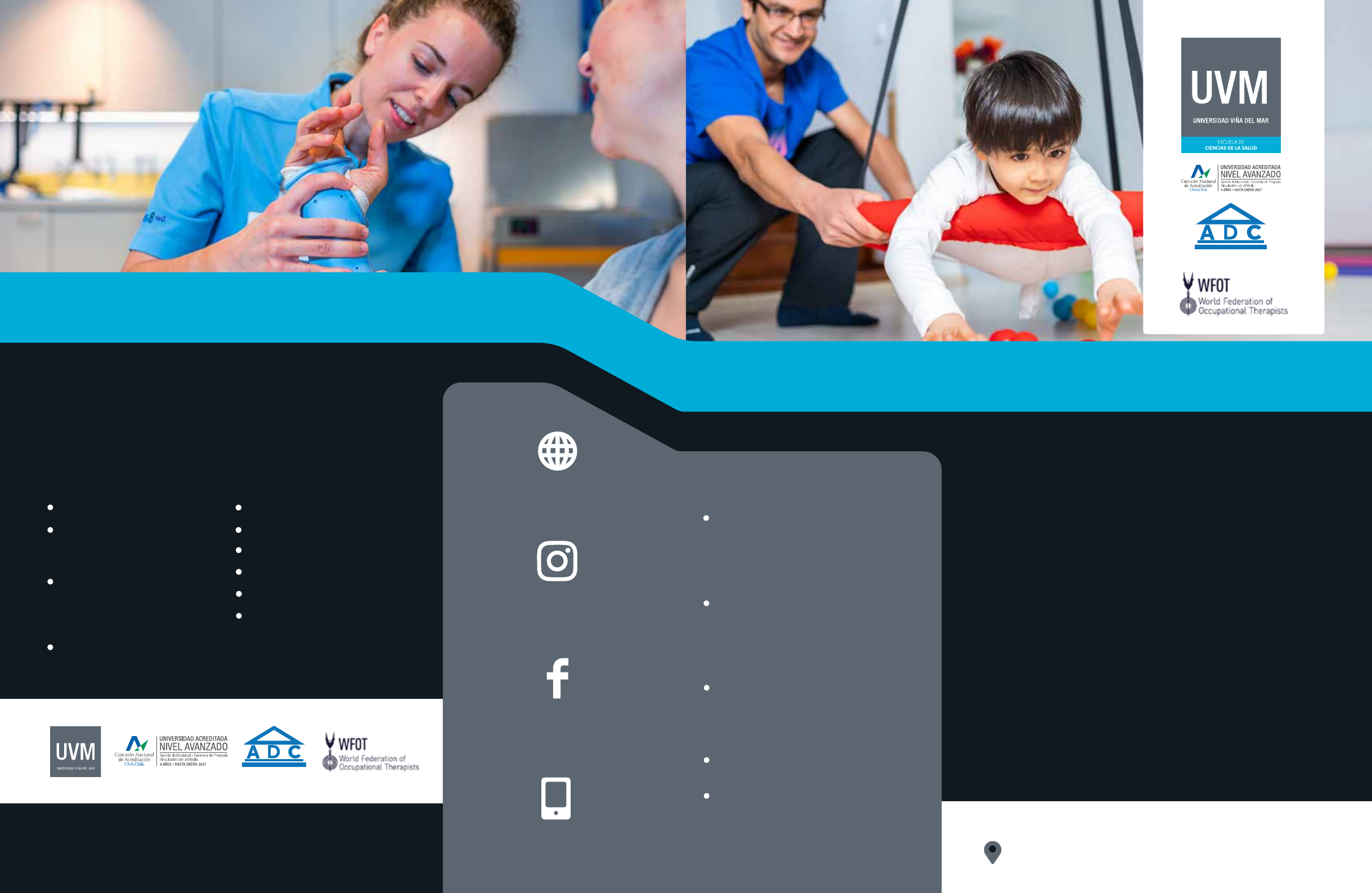 TERAPIA OCUPACIONAL UNIVERSIDAD VIÑA DEL MAR DIURNO ESCUELA DE CIENCIAS DE LA SALUD Dirección de Admisión Universidad Viña del Mar Diego Portales 17, Recreo, Viña del Mar VALORES INSTITUCIONALES Somos una universidad regional, buscamos en el entorno la inspiración para nuestro quehacer, rea�rmando nuestro compromiso con el desarrollo de la región y del país, tanto en nuestra labor formativa como en nuestros proyectos de vinculación con el medio y extensión cultural. Universidad inclusiva. Más de 35 años de prestigio y excelencia académica. Apoyo académico permanente, para estudiantes que requieran reforzar su avance. Convenios internacionales y carreras de doble titulación. ACERCA DE UVM ASPECTOS DESTACADOS uvm.cl uvm.cl 800 374100 UVM_CL Los estudiantes al ingresar a Terapia Ocupacional UVM forman parte de una carrera de formación teórica – práctica cuyo plan de estudios fomenta el contacto temprano de los alumnos con la realidad profesional. Contacto y aproximación temprana en ámbitos prácticos en importantes centros clínicos de la región y promueve la vinculación con el medio a través de jornadas, conferencias y proyectos comunitarios. Los estudiantes se convierten en profesionales integrales y con herramientas para poder enfrentarse a cualquier desafío que les depare el mundo laboral. Carrera certi�cada por 5 años, por la agencia ADC, hasta octubre de 2026. Carrera Acreditada Internacionalmente por 7 años por la Federación Mundial de Terapeutas Ocupacionales (WFOT), hasta noviembre de 2029. La UVM forma profesionales íntegros, inclusivos, que actúan con responsabilidad social, comprometiéndose con le desarrollo de su país, promueve, desarrolla y lidera procesos de intervención propios de la profesión en las áreas de la salud, desarrollo social, educación, justicia entre otras áreas, centrados en la inclusión y participación social, valorando la ciencia ocupación como fundamento del quehacer profesional, interviniendo de manera empática, creativa e innovadora a través del diseño y aplicación de planes y programas dentro de un contexto interdisciplinario en sistemas públicos y/o privados. CAMPO LABORAL El campo laboral que el terapeuta ocupacional hoy tiene para desempeñarse es en todos los niveles de atención de la salud (atención primaria, ej: CESFAM - CCR – RBC) a niveles secundario y terciario (hospitales, unidades de rehabilitación, clínicas, centros de salud y también hoy estamos en campo laboral de educación, ej: PIE), social en la comunidad a través de programas comunitarios o fundaciones y de justicia (Gendarmería, Sename, programas de drogadicción). Título profesional: Terapeuta Ocupacional Grado Académico: Licenciado en Terapia Ocupacional Duración: 10 Semestres CAMPUS RODELILLO / ESCUELA DE CIENCIAS DE LA SALUD Tolerancia y diversidad Responsabilidad Integridad Respeto Compromiso Pasión por la excelencia uvm.cl Agencia de Calidad Agencia de Calidad PERFIL DE EGRESO: Capacitado para establecer un diagnóstico ocupacional y biopsicosocial del usuario y comunidades en cualquier condición de salud y grupo etario. Habilitado para el razonamiento clínico en el desarrollo e implementación de sus acciones lo que permite mejorar la calidad de vida de las personas sanas y en situación discapacidad. Utiliza herramientas como ayudad técnicas, órtesis y adaptaciones en las actividades d la vida diaria, productividad y tiempo libre. Asignaturas Presenciales Malla sujeta a cambios y revisión constante. Para efectos grá�cos fueron suprimidas las líneas de requisitos de las asignaturas. I II III IV V VI VII VIII IX X TÍTULO PROFESIONAL: Terapeuta Ocupacional GRADO ACADÉMICO: Licenciado en Terapia Ocupacional DURACIÓN: 10 Semestres DIURNO ESCUELA DE CIENCIAS DE LA SALUD TERAPIA OCUPACIONAL Introducción a la Terapia Ocupacional Ocupación Humana Fundamentos Biomecánicos Actividades y Técnicas Terapéuticas I Psicología del Desarrollo Actividades y Técnicas Terapéuticas II Desarrollo de Programas Inclusivos Intervención Salud Física y Ergonomía Intervención Salud Física Adultos Internado Profesional I Internado Profesional II Internado Profesional III Internado Profesional IV Intervención Comunitaria Método Cientí�co y Proyecto de Salud Intervención en Salud Mental y Psiquiatría I Intervención en Salud Mental y Psiquiatría II Intervención en Pedriatría I Intervención en Pedriatría II Bases de la Intervención en Geronto - Geriatría Epidemiología y Bioestadística Psicopatología Fisiopatología Médico Quirúrgica Biomecánica Aplicada a la Ocupación Desarrollo Psicomotor del Niño y Escolar Gestión y Salud Pública Traumatología Neurología Órtesis Psiquiatría Estructura y Función Psicología Social y Antropología Inglés I Inglés II Inglés III Inglés IV Formación General Formación General Formación General Formación General Anatomía del Aparato Locomotor Fundamentos Biológicos Pensamiento Lógico Matemático Herramientas y Métodos Básicos para el Trabajo Cientí�co Gestión Personal Expresión Oral y Escrita