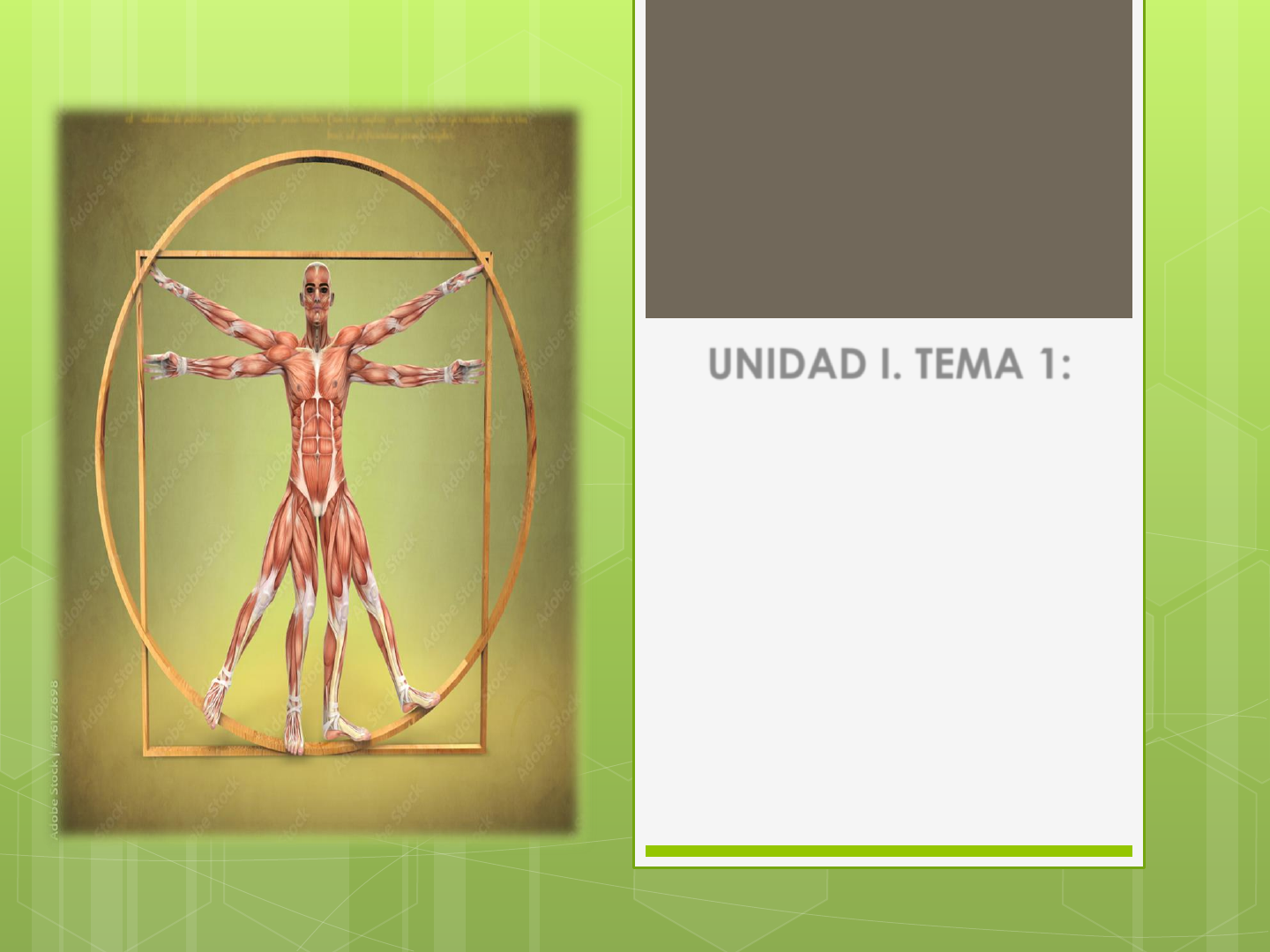 UNIDAD I. TEMA 1: CONCEPTOS Y TERMINOLOGÍA DE ANATOMÍA BÁSICA Dra. Ylamary Rodríguez Cova. Materia: anatomía . Unerg. Núcleo: Maturín. UNIDAD I: •Tema1: Conceptos y terminología anatómicos. Principios morfológicos. •Tema2: Generalidades de osteología, artrología, miología, angiología, neurología. •Tema 3: Terminología Radiológica Objetivos del tema Según los conocimientos adquiridos, y el uso de la nomenclatura internacional el alumno debe estar en capacidad de: 1.Definir anatomía. 2.Definir ejes y planos corporales. 3.Ubicar los diferentes ejes y planos del cuerpo humano. 4.Definir:medial,lateral,proximal,superior,inferior,caudal, rostral,dorsal,ventral,externo,interno,superficial, profundo,volar,plantar y palmar. Objetivos del tema Según los conocimientos adquiridos, y el uso de la nomenclatura internacional el alumno debe estar en capacidad de: 5. Ejemplificar en el cuerpo humano cada uno de los términos. 6. Definir y ejemplificar metámero , polaridad y estratigrafía. Anatomía Anatomía (antropotomía): el termino deriva del griego anatemnein cortar, desecar. Es el estudio , clasificación y descripción de las estructuras y órganos del cuerpo. Puede ser descriptiva, topográfica y funcional. Clasificación : Macroscópica: a)anatomía descriptiva es sistemática, estudia las estructuras que conforman un sistema . b)anatomía topográfica estudio de la anatomía por regiones. o Funcional ,describe según la función del sistema. Planos anatómicos Posición anatómica: Es la posición, neutra estándar de referencia que se utiliza para describir, puntos o movimientos de las diversas partes del cuerpo. A partir de esta posición se ubican tres planos y tres ejes imaginarios. convencionalmente se considera el cuerpo de pie, con la mirada hacia adelante, los pies ligeramente separados, orientados hacia adelante, los miembros superiores ubicados a los lados y las palmas de las manos hacia adelante. Posición anatómica Planos anatómicos Los tres planos son frontal, sagital y horizontal, y los tres ejes que se asocian a cada uno de planos , son perpendiculares entre si, entre estos tenemos el eje longitudinal o cefalocaudal, el eje transversal o laterolateral y el eje anteroposterior o dorsoventral. Planos anatómicos Ejes y planos corporales: Eje o axis: Línea que pasa a través del centro del cuerpo ,o una parte de éste. Planos corporales: 1.Plano Sagital: vertical , paralelo al plano medio del cuerpo lo divide en derecho e izquierdo. Es atravesado por el eje transversal. Medio sagital Parasagital Planos anatómicos Planos corporales: 2. Plano Coronal o frontal: vertical atraviesa el cuerpo en ángulo recto con respecto al plano medio, dividiéndolo en anterior y posterior. Es atravesado por el eje anteroposterior. 3. Plano transversal ,horizontal o axial: atraviesa el cuerpo en ángulo recto con los planos coronal y medio. Es atravesado perpendicularmente por el eje longitudinal. Divide al cuerpo en parte superior e inferior. Planos anatómicos Plano transversal Plano coronal Plano sagital Planos anatómicos Planos Tangenciales: Superior Inferior Anterior Posterior Secundarios o laterales Plano superior Plano inferior Plano lateral Plano posterior Plano lateral Plano anterior Terminología La terminologia anatómica debe ser universal, existe un comite internacional de la nomina anatomica formado en 1950 en Oxford. Se establecio la nomenclatura en paris en 1955 y la ultima modificación se realizo en Sao Paulo en 1997. Establece lo siguiente: Cada estructura sera denominada con un solo termino. Los terminos estaran en idioma latin o ingles, y podrán ser traducidos al idioma vernaculo o sea el idioma propio de cada país. Los terminos tendrán valor descriptivo e informativo. No se utilizaran epónimos. Medial: orientado hacia la línea media del cuerpo. Lateral: alejado de la línea medio sagital, a la derecha o izquierda. Proximal: cercano a un punto determinado de referencia. Superior: encima o hacia arriba. cefálico Inferior: abajo Caudal: situado en la cola, o extremo del cuerpo lejos de la cabeza. Rostral: arriba cerca del rostro. Dorsal: Posterior Ventral: hacia adelante ; anterior. Interno y externo se usan estos términos para describir la localización de la pared corporal (externa) y las vísceras (internas). Superficial, es cerca de la superficie Profundo, traduce bajo la superficie Volar: relativo a la palma de la mano o la planta del pie. Plantar, se refiere a la planta del pie. Palmar, se refiere a la superficie anterior del antebrazo y la mano. La superficie posterior de la mano y el empeine del pie son referidas como superficies dorsales Movimientos ejes y planos Plano Eje Movimientos Sagital Transversal Flexión / Extensión Frontal Anteroposterior Abducción / aducción Horizontal Longitudinal Rotación Terminologia de Movimiento. Flexión: disminución del ángulo que se forma entre 2 segmentos corporales vecinos o movimiento en donde se acerca un segmento a otro segmento vecino. Extensión: incremento del ángulo que se forma entre 2 segmentos corporales o movimiento en el cual se aleja un segmento del otro. Abducción: movimiento lateral que incrementa la distancia a la línea media del cuerpo. Aducción: movimiento lateral que disminuye la distancia a la línea media del cuerpo. Rotación: es el movimiento circular de una porción del cuerpo alrededor de su propio eje. Tipos de rotación según el sentido de giro: Rotación interna: ocurre cuando el giro sucede hacia la línea media, es decir hacia “adentro”. Rotación externa: ocurre cuando el giro sucede desde la línea media del cuerpo, es decir va hacia afuera del cuerpo. Circunducción: la combinación de la flexión, extensión, abducción, aducción y rotación resulta en un movimiento de circunducción. en este tipo de movimiento el extremo distal de dicho segmento describe una circunferencia. Supinación: el antebrazo gira hacia afuera, como una rotación externa, ub