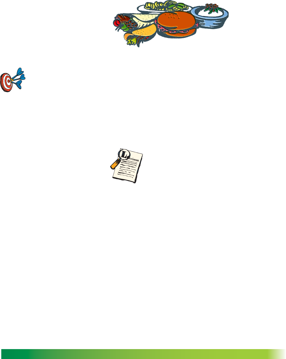 ALIMENTARNOS BIEN PARA ESTAR SANOS Tema 3 Como comer bien para tener una buena salud 199 Lección 7 Realizando una buena selección de alimentos y preparación de comidas OBjETIVOS DE APRENDIzAjE Al final de la lección, tú serás capaz de: • analizar las razones por las cuales las personas comen lo que comen; • comprender las razones que están detrás de tu propia selección de alimentos; • seleccionar alimentos nutritivos y planificar una alimentación saludable. DESCRIPCIóN DEL CONTENIDO Esta lección se refiere a cómo realizar una selección cuidadosa de alimentos para tener una alimentación saludable; considera el valor nutricional de los alimentos y las necesidades individuales de las personas; explora las diferentes razones que determinan lo que comemos: nuestros hábitos alimenticios, tradiciones, costo de los alimentos, gustos y preferencias. Proporciona ejemplos de guías alimentarias de algunos países alrededor del mundo y estimula a los lectores a desarrollar sus guías personales en base a su salud y necesidades alimenticias. Lección 7 Realizando una buena selección de alimentos y preparación de comidas Tema 3 Como comer bien para tener una buena salud 200 ALIMENTARNOS BIEN PARA ESTAR SANOS PARA PENSAR MIENTRAS LEES ¿Estás seleccionando los alimentos correctos para preparar tus comidas? ¿Estás obteniendo lo que necesitas de tus alimentos? ¿Tienes en mente las necesidades de tu cuerpo cuando decides qué comer? ¿Hay guías alimentarias en tu país que te ayuden a saber cuáles alimentos comer con más o con menos frecuencia? Parte 1 Hábitos alimenticios y alimentación saludable PARA LEER Todos necesitamos comer para cubrir nuestras necesidades nutricionales, pero las personas normalmente hacemos la selección de alimentos por razones diferentes de las nutricionales. La disponibilidad de alimentos y su costo, el sabor y la apariencia de los alimentos, los gustos personales, la conveniencia y el conocimiento sobre los alimentos y los requerimientos nutricionales del cuerpo, son todas razones por las cuales las personas comen lo que comen. Los hábitos alimenticios y las tradiciones varían en las diferentes culturas. Algunas culturas ingieren su comida principal en la mañana antes de ir al trabajo; otras lo hacen al medio día y otras al final del día. Algunas sociedades comen dos veces al día; otras lo hacen tres veces al día. En algunas culturas todos los miembros de la familia comen juntos, en otras los adultos comen separados de los niños; e incluso los hombres separados de las mujeres. Numerosas culturas y sociedades tienen normas o creencias sobre alimentos específicos que no deben consumirse (tabúes sobre alimentos). A veces estas creencias se refieren a la población en general y otras sólo a determinadas personas bajo ciertas condiciones, como durante el embarazo, lactancia, infancia o enfermedad. Aunque muchas de estas prácticas son positivas, algunas de ellas pueden ser dañinas, al privar a las personas de ciertos nutrientes necesarios. Cuando, por estas razones, ciertos alimentos con alto valor nutricional son prohibidos, ellos deben ser reemplazados por otros, culturalmente aceptados y de contenido nutricional similar. Ningún alimento por sí solo contiene todos los nutrientes que necesitamos para estar sanos. Una alimentación adecuada incluye diferentes alimentos, consumidos a lo largo del día, en suficiente cantidad y calidad, para cubrir las necesidades individuales de energía (calorías) y de nutrientes. Sin una variedad adecuada, aunque se cubran las necesidades de calorías e incluso se las sobrepase, no se logra cubrir las necesidades de todos los nutrientes. En nuestras comidas y meriendas, refacciones o refrigerios, debemos priorizar alimentos con alto contenido de nutrientes, que nos permitan cubrir ALIMENTARNOS BIEN PARA ESTAR SANOS Lección 7 Realizando una buena selección de alimentos y preparación de comidas Tema 3 Como comer bien para tener una buena salud 201 Parte 1 Hábitos alimenticios y alimentación saludabe también nuestras necesidades de energía (no mucho ni muy poco). Esto promueve un crecimiento y desarrollo normal en niños, un mejor estado de salud para las personas de todas las edades, y reduce el riesgo de desarrollar enfermedades crónicas que representan serios problemas de salud. No existe una alimentación “ideal” adecuada para todos. Las necesidades nutricionales son específicas para cada individuo, pero todos necesitan una alimentación balanceada, que incluya una variedad de alimentos, que a su vez proporcionen diferentes tipos y cantidades de nutrientes. Balance y variedad en la alimentación significa obtener suficiente, pero no demasiado, respecto de la energía y de los nutrientes requeridos. También significa evitar cantidades excesivas de cualquier alimento o de cualquier componente del alimento (nutriente). Con una selección cuidadosa es posible obtener todos los nutrientes necesarios, disfrutar de variados alimentos y mantener un peso corporal saludable. Idealmente, una alimentación balanceada se logra en cada tiempo de comida u ocasión en que se coma. El balance y la variedad se pueden lograr a través de los diferentes tiempos de comidas y meriendas o refacciones a lo largo del día, o de varios días, hasta una semana. Por ejemplo un alimento o nutriente que pueda estar escaso o en exceso en una comida puede completarse o equilibrarse en la comida o merienda siguiente. Comer un día más o menos cantidad de alimentos (calorías) que los requeridos, puede ser equilibrado con lo que se come al día siguiente. Para mantener un buen balance y variedad, debemos saber nuestras necesidades de nutrientes y cuáles alimentos los proporcionan y tenerlo en mente al momento de seleccionar nuestros alimentos. Una alimentación saludable y balanceada puede basarse en patrones de alimentación locales, usando alimentos disponibles y respetando la cultura local. Los alimentos que compo