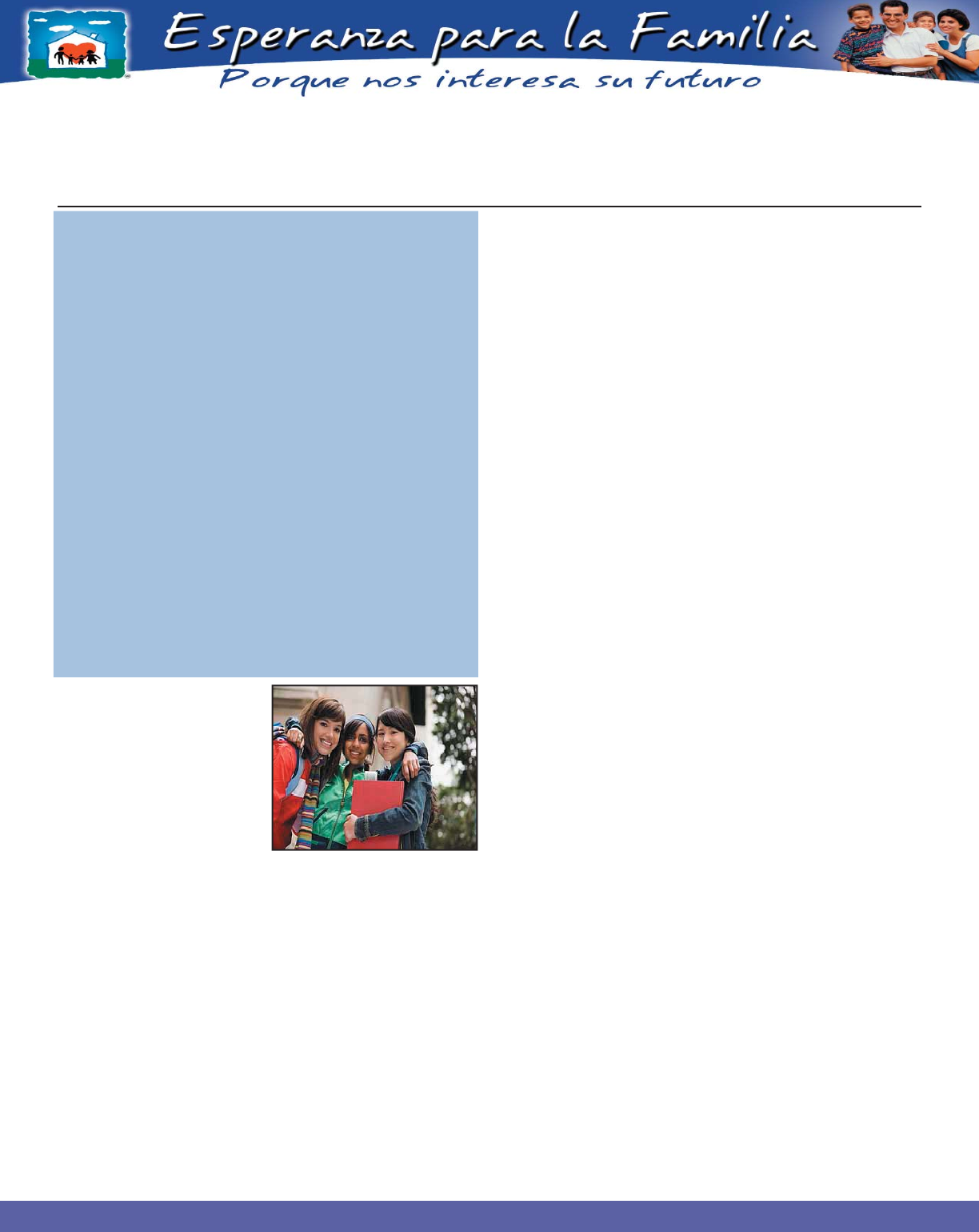 Introducción Muchos padres de familia nos han preguntado cómo deben cuidar a sus hijos de las malas amistades y de las amistades que los corrompen. Para mí es un privilegio que nos permitan entrar en sus hogares, ya que es nuestro deseo fortalecer los valores familiares, tenemos una convicción certera de que éstos son la solución. Hoy vamos a hablar un poco acerca de las amistades. ¿De qué hablan tanto? se podría preguntar un padre sobre su hijo adolescente que ha estado en el teléfono por una hora con su mejor amigo al que no ha visto desde hace dos horas. La capacidad de los amigos cercanos de compartir sus pensamientos y sentimientos interiores, descansa en el desarrollo cognoscitivo. Los adolescentes son más hábiles que los niños pequeños para expresar lo que piensan y sienten, son menos egocéntricos y pueden ser más susceptibles a los sentimientos y pensamientos que sus amigos comparten con ellos. pero sus amistades son rara vez tan cercanas como las de ellas. La intimidad y la confi anza de la mejor amistad llenan el vacío creado por la separación de los padres o algún problema familiar. Los jóvenes que buscan intimidad en una relación para compensar la ausencia de ésta en su casa tienen menos posibilidad de encontrarla. ¿Cómo escogen, entonces, a sus amigos? Tienden a escoger amigos que son muy parecidos a ellos y una vez que se vuelven amigos infl uyen los unos en los otros para parecerse más. Esta necesidad es la tendencia de los adolescentes a imitar el comportamiento del otro y la infl uencia de la presión del grupo de iguales. Con respecto a la rebeldía, prácticamente es una característica de los adolescentes; no son adultos pero muchas veces quieren comportarse como tales. La relación con sus amigos es para ellos muy importante y a los padres se les comienza a ver, en algunas ocasiones, como enemigos. A veces, mantener un equilibrio es difícil. ¿Tiene mi hijo una mala infl uencia? Por demás está decir que los padres queremos lo mejor para nuestros hijos y que les entregamos lo mejor siempre que podemos, pero ¿qué ocurre cuando nuestros hijos no eligen lo más adecuado para ellos o cuando eso que eligieron es una amistad contra la cual sentimos que no podemos luchar? Generalmente los padres son los primeros en darse cuenta de que una infl uencia negativa está afectando a su hijo, dado que el vínculo que tienen con ellos es fuerte, afectivo y primario. Cuando las madres vienen a la consejería familiar o a la consejería de jóvenes, muchas veces no tienen pruebas pero intuyen que algo sucede con sus hijos. Una mala infl uencia puede ocurrir en cualquier lugar; los niños son infl uenciados por sus amiguitos y desde el jardín infantil es posible darse cuenta cómo las relaciones con otros niños pueden ser tremendamente signifi cativas. Sin embargo, es en la pubertad y sobre todo en la adolescencia cuando esa infl uencia se hace notoriamente importante para los jóvenes, ya que el grupo adquiere una gran relevancia; desde los doce o trece años el grupo es fundamental. ¿Cómo saber si nuestro hijo está teniendo una mala infl uencia? Podemos saberlo si notamos que nuestro hijo que siempre fue de una determinada manera comienza a cambiar, si lo que antes le interesaba ya no tiene importancia para él, si las amistades de toda la vida se tornan distantes y si empieza a rechazar actividades familiares. Debemos estar alerta. Una amistad dañina hará que el o la joven se vuelve dependiente de su amigo, de lo que dice, de sus actitudes, de su infl uencia o indiferencia y generalmente se establece una relación poco sana Esperanza para la Familia, A. C. Núm. en Catálogo: 0217 Pag. 1 Las amistades El respaldo emocional y el compartir confi dencias son vitales en las amistades entre mujeres durante la adolescencia y en su vida posterior. Los hombres tienden más a contar con amigos que las mujeres, donde hay un dominante y un dominado. El amigo es idealizado por lo que el dominado no puede ver sus defectos o debilidades, los padres describen esta situación como aislamiento. No quieren contar lo que hacen con ese amigo, lo que piensa porque saben que será sancionado por sus padres. Por eso, éstos deben notar la diferencia entre proteger al hijo de esa mala infl uencia y privarlo de amistades inocuas. Las amistades sanas tienen el componente básico de la libertad y del respeto por el otro, dos aspectos que en este tipo de amistades no se dan sino que pasa al contrario, no se respeta al otro en su legítimo derecho de ser diferente. También es relevante la labor del colegio en este sentido, ya que los profesores suelen darse cuenta del cambio en los niños que han tenido buen rendimiento académico o conducta y que de pronto comienzan a juntarse con cierto compañero y cambian drásticamente su conducta. Los comentarios y opiniones que los maestros hacen a los padres son una información importantísima y de gran ayuda si la asumen constructivamente. Muchas veces a los profesores les preocupa la inseguridad de los alumnos ya que a futuro podrían verse envueltos en ese tipo de relaciones y los padres, al escuchar esos comentarios, reaccionan airadamente, enojados con el colegio por hacerles más difícil la vida, por criticar a sus hijos y querer niños perfectos. Creo que los padres deben prestar oído a todos los comentarios que los hijos generen, poner atención, observar mucho y actuar a tiempo. Actuando rápido Una mala amistad puede cambiar la vida de un niño o joven que probablemente tiene algunas carencias que no fueron tratadas a tiempo. Por eso, enfatizo que los padres deben actuar rápido si notan esta mala infl uencia. Por lo general los padres tardan mucho tiempo en buscar ayuda y atribuyen este mal comportamiento a cuestiones hereditarias, (“es igual a su tío”), genéticas (“desde que nació ha sido tremendo”), o familiares (“lamentablemente nos separamos y los celos que tenía con su hermana aumentaron”). Pero cu