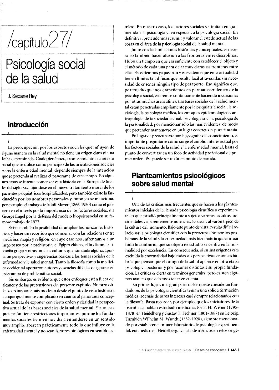 /capítulo2 7/ Psicología social de la salud J. Seoane Rey Introducción La preocupación por los aspectos sociales que influyen de alguna manera en la salud mental no tiene un origen claro ni una fecha determinada. Cualquier época, acontecimiento o contexto social que se utilice como principio de las orientaciones sociales sobre la enfermedad mental, depende siempre de la intención que se pretenda al realizar el panorama de este campo. En algu- nos casos se intenta comenzar esta historia en la Europa de fina- les del siglo XIX, ti.jándose en el nuevo tratamiento moral de los pacienll>s psiquiátricos hospitalizados, pero también existe la fas- cinación por los nombres personales y entonces se menciona, por ejemplo, el trabajo de Adolflvleyer ( 1866-1950) como el pio- nero en el interés por la importancia de los factores sociales, o a George Engel por la defensa del modelo biopsicosocial en su fa- moso trabajo de 1 977. Existe también la posibilidad de ampliar los horizontes histó- ricos y hacer un recorrido que comienza con las relaciones entre medicina, magia y religión, en cuyo caso nos enfrentamos a un largo paseo por la prehistoria, el Egipto clásico, el budismo, la fi- losofía griega y otras muchas culturas que, sin duda alguna, apor- taron perspectivas y sugerencias básicas a los temas sociales de la enfermedad y la salud mental. Tanto la tllosofia como la medici- na occidental aportaron autores y escuelas ditkiles de ignorar en este campo de problemática social. Sin embargo, es evidente que estos enfoques están fuera del alcance y de las pretensiones del presente capítulo. N u estro ob- jetivo es bastante más modesto desde el punto de vista histórico, aunque igualmente complicado en cuanto al panorama concep- tual. Se trata de exponer con cierto orden y claridad la perspec- tiva actual de las bases sociales de la salud mental. Y aun esta pretensión tiene restricciones importantes, porque los funda- mentos sociales tienden hoy día a entenderse en un sentido muy amplio, abarcan prácticamente todo lo que influye en la enfermedad mental y no sean factores biológicos en sentido es- tricto. En nuestro caso, los factores sociales se limitan en gran medida a la psicología y, en especial, a la psicología social. En detinitiva, pretendemos resumir y valorar el estado actual de bs cosas en el área de la psicología social de la salud mental. Junto con las limitaciones históricas y conceptuales, es nece- sario también hacer alusión a las fronteras entre disciplinas. Hubo un tiempo en que era suficiente con establecer el objeto y el método de cada una para dejar muy claras las fronteras entre ellas. Esos tiempos ya pasaron y es evidente que en la actualidad tienen límites tan difusos que resulta fácil atravesarlas sin nece- sidad de enseñar ningún tipo de pasaporte. Eso significa que. por mucho que nos empeilemos en permanecer dentro de la psicología social, estaremos continuamente haciendo incursiones por otras muchas áreas afines. Las bases sociales de la salud men- tal están penetradas ampliamente por la psiquiatría social, la so- ciología, la psicología médica, los ent()ques epidemiológicos, an- tropología de la sociedad actual, psicología social. psicología de la personalidad, por mencionar sólo las más evidentes, de modo que pretender mantenerse en un lugar concreto es pura fantasía. En lugar de preocuparse por la geografía del conocimiento, es importante preguntarse cómo surge el amplio interés actual por los factores sociales de la salud y la enfermedad mental, hasta el punto de convertirse en un foco de actividad profesional de pri- mer orden. Ése puede ser un buen punto de partida. Planteamientos psicológicos sobre salud mental Una de las criticas más frecuente.~ que se hacen a los plantea- mientos iniciales de la llamada psicología científica o experimen- tal es que estudió principalmente a sujetos varones, adultos, oc- cidentales y aparentemente normales. Es decir, al varón típico de la cultura del momento. Bajo este punto de vista, resulta difícil re- lacionar la psicología cientítlca con la preocupación por los pro- blemas de la salud y la enfermedad, más bien habría que atlrmar todo lo contrario, que su objeto de estudio se centra en la nor- malidad por excelencia. En consecuencia, si en sus orígenes está excluida la anormalidad bajo todas sus perspectivas, entonces ha- bría que pensar que el campo de la salud aparece t'll otra etapa psicológica posterior y por razones distintas a su propia funda- ción. La critica es cierta en términos generales, pero existen algu- nos matices que debemos tener en cuenta. En primer lugar. una gran parte de los que se consideran fun- dadores de la psicología científica tenían una sólida t(mnación médica, además de otros intereses casi siempre relacionados con la tllosofía. Basta recordar, por ejemplo, que los iniciadores de la psicofísica habían estudiado medicina, Ernst H. Weber ( 1795- 1878) en Heidelberg yGustav T. Fechner (1801-1887) en Leipzig. También Wilhelm M. Wundt ( 1832-1920), siempre menciona- do por establecer el primer laboratorio de psicología experimen- tal, era médico en Heidelberg. La lista de médicos en estos o rige- 1 Bases psicosooales 1 445 1 1 J. Seoane Rey 1 nes de la psicología cientitka y dumnte bastante tiempo después, sin necesidad de recurrir al caso de Sigmund Freud dentro de otra tradición, es suficientemente larga como para sospechar que no podían estar alejados por completo de las preocupaciones patoló- gicas, las alteraciones funcionales o los comportamientos anor· males. Es cierto que la psicología experimental, en sus inicios, perseguía la mente del ser humano normal, pero al menos siem- pre tuvo en cuenta que las anomalías, tanto en los contenidos como en los procesos, eran una fuente importante de contraste e investigación de la normalidad. Por otro lado, sería un error limitar los comienzos de la psi- cología a s