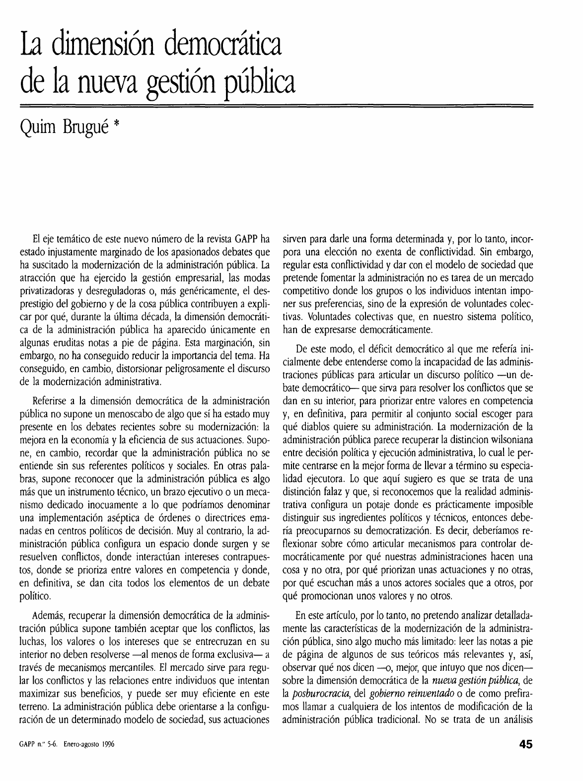 La dimensión democrática de la nueva gestión pública Quim Brugué * El eje temático de este nuevo número de la revista GAPP ha estado injustamente marginado de los apasionados debates que ha suscitado la modernización de la administración pública. La atracción que ha ejercido la gestión empresarial, las modas privatizadoras y desreguladoras o, más genéricamente, el des- prestigio del gobierno y de la cosa pública contribuyen a expli- car por qué, durante la última década, la dimensión democráti- ca de la administración pública ha aparecido únicamente en algunas eruditas notas a pie de página. Esta marginación, sin embargo, no ha conseguido reducir la importancia del tema. Ha conseguido, en cambio, distorsionar peligrosamente el discurso de la modernización administrativa. Referirse a la dimensión democrática de la administración pública no supone un menoscabo de algo que sí ha estado muy presente en los debates recientes sobre su modernización: la mejora en la economía y la eficiencia de sus actuaciones. Supo- ne, en cambio, recordar que la administración pública no se entiende sin sus referentes políticos y sociales. En otras pala- bras, supone reconocer que la administración pública es algo más que un instrumento técnico, un brazo ejecutivo o un meca- nismo dedicado inocuamente a lo que podríamos denominar una implementación aséptica de órdenes o directrices ema- nadas en centros políticos de decisión. Muy al contrario, la ad- ministración pública configura un espacio donde surgen y se resuelven conflictos, donde interactúan intereses contrapues- tos, donde se prioriza entre valores en competencia y donde, en definitiva, se dan cita todos los elementos de un debate político. Además, recuperar la dimensión democrática de la adminis- tración pública supone también aceptar que los conflictos, las luchas, los valores o los intereses que se entrecruzan en su interior no deben resolverse —al menos de forma exclusiva— a través de mecanismos mercantiles. El mercado sirve para regu- lar los conflictos y las relaciones entre individuos que intentan maximizar sus beneficios, y puede ser muy eficiente en este terreno. La administración pública debe orientarse a la configu- ración de un determinado modelo de sociedad, sus actuaciones sirven para darle una forma determinada y, por lo tanto, incor- pora una elección no exenta de conflictividad. Sin embargo, regular esta conflictividad y dar con el modelo de sociedad que pretende fomentar la administración no es tarea de un mercado competitivo donde los grupos o los individuos intentan impo- ner sus preferencias, sino de la expresión de voluntades colec- tivas. Voluntades colectivas que, en nuestro sistema político, han de expresarse democráticamente. De este modo, el déficit democrático al que me refería ini- cialmente debe entenderse como la incapacidad de las adminis- traciones públicas para articular un discurso político —un de- bate democrático— que sirva para resolver los conflictos que se dan en su interior, para priorizar entre valores en competencia y, en definitiva, para permitir al conjunto social escoger para qué diablos quiere su administración. La modernización de la administración pública parece recuperar la distinción wilsoniana entre decisión política y ejecución administrativa, lo cual le per- mite centrarse en la mejor forma de llevar a término su especia- lidad ejecutora. Lo que aquí sugiero es que se trata de una distinción falaz y que, si reconocemos que la realidad adminis- trativa configura un potaje donde es prácticamente imposible distinguir sus ingredientes políticos y técnicos, entonces debe- ría preocuparnos su democratización. Es decir, deberíamos re- flexionar sobre cómo articular mecanismos para controlar de- mocráticamente por qué nuestras administraciones hacen una cosa y no otra, por qué priorizan unas actuaciones y no otras, por qué escuchan más a unos actores sociales que a otros, por qué promocionan unos valores y no otros. En este artículo, por lo tanto, no pretendo analizar detallada- mente las características de la modernización de la administra- ción pública, sino algo mucho más limitado: leer las notas a pie de página de algunos de sus teóricos más relevantes y, así, observar qué nos dicen —o, mejor, que intuyo que nos d icen- sobre la dimensión democrática de la nueva gestión pública, de la posburocracia, del gobierno reinventado o de como prefira- mos llamar a cualquiera de los intentos de modificación de la administración pública tradicional. No se trata de un análisis GAPP n." 5-6. Enero-agosto 1996 45 Gestión pública y democracia académico, sino más bien de una reflexión muy personal reali- zada en voz alta. Es por esta razón que he optado por una fórmula expositiva más relajada, sin sentirme obligado a usar constantes referencias bibliográficas y persiguiendo más la ca- pacidad para suscitar la discusión que la rigurosidad científica. Con estos objetivos, he estructurado el artículo en cinco apartados. En el primero esbozo los grandes rasgos del modelo tradicional de administración (en su expresión weberiana más pura), así como los de su crisis y los de la emergente nueva gestión pública. No lo hago de forma exhaustiva, sino intentan- do subrayar los déficit democráticos del primer modelo y ob- servando como su reformulación abre nuevos interrogantes sobre estos mismos déficit. Interrogantes que, a su vez, suscitan res- puestas diferentes en la literatura más reciente sobre la nueva gestión pública. En el marco de esta nueva gestión pública, he identificado un mínimo de tres posturas relacionadas con la dimensión de- mocrática de la administración pública, las cuales resumo en los apartados dos, tres y cuatro. En el segundo me refiero a lo que considero las posiciones más crédulas; es decir, las de aque- llos que responden a nuestro interrogante d