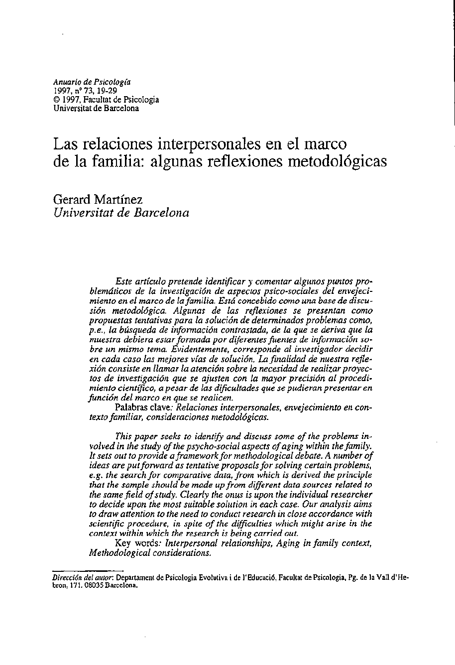 Anuario de Psicologia 1997, no 73, 19-29 O 1997, Facultat de Psicologia Universitat de Barcelona Las relaciones interpersonales en el marco de la familia: algunas reflexiones metodológicas Gerard Martínez Universitat de Barcelona Este articulo pretende identificar y comentar algunos puntos pro- blemúticos de la investigación de aspectos psico-sociales del envejeci- miento en el marco de la familia. Esta' concebido como una base de discu- sión metodológica. Algunas de las rejexiones se presentan como propuestas tentativas para la solución de determinados problemas como, p.e., la búsqueda de inforrnación contrastada, de la que se deriva que la muestra debiera estar fonnada por diferentes fuentes de infomzación so- bre un mismo tema. Evidentemente, corresponde al investigador decidir en cada caso las mejores vias de solución. La finalidad de nuestra rejie- xión consiste en llamar la atención sobre la necesidad de realizarproyec- tos de investigación que se ajusten con la mayor precisión al procedi- miento cientíjico, a pesar de las d@cultades que se pudieran presentar en función del marco en que se realicen. Palabras clave: Relaciones interpersonales, envejecimiento en con- texto familiar, consideraciones metodológicas. This paper seeks to identifv and discuss some o f the problems in- volved in thk &dy of the psycho~ocial aspects of uging withjn rhe family. It sets out to provide a framework for methodolonical debate. A nurnber of ideas are pui fonvard Ús tentati~e"~ro~osals for ;olving certain problemi, e.g. the search for comparative data, from which is derived rhe principle that the sample should be made up from different data sources related to the samefield of study. Clearly the onus is upon the individual researcher to decide upon the most suitable solution in each case. Our analysis aims to draw attention to the need to conduct research in close accordance with scientific procedure, in spite of the dificulties which might arise in rhe context within which the research is being carried out. Key words: Interpersonal relationships, Aging in family context, Methodological considerations. Dirrcción del autor: Departament de Psicologia Evolutiva i de i'Educaci6, Facultat de Psicologia, Pg. de la Vall #He- bron, 171.08035 Barcelona. 20 G. Martínez El marco familiar: su importancia para las personas mayores Desde una perspectiva social sistémica, la familia puede considerarse, de forma poc0 comprometida -eludiendo 10s aspectos de la dinámica emocional-, como un sistema de relaciones interdependientes (Schaie y Willis, 1991). Cada miembro juega un rol especifico en el sistema y el resto de miembros dependen del hecho de que cada uno juegue su papel. Los niños y 10s ancianos de rnás edad dependen de sus familiares para cubrir sus necesidades básicas (protección, des- plazamiento, comida, etc.). Desde esta perspectiva, la historia de la vida de las personas, desde el punto de vista familiar, consistiria en la pertenencia a dife- rentes sistemas de interdependencia en función de 10s roles que nos toca desem- peñar según las diferentes edades. Que hablemos de menor grado de compromiso no significa en absolut0 que el estudio desde una perspectiva sistémica sea sencillo. Por ejemplo, esta perspectiva considera la familia inmersa en otros sistemas sociales más amplios, como el vecindario, la comunidad, la subcultura, etc. por 10 cua1 resulta compli- cado investigar el tip0 de interrelación que se puede producir en función de 10s diferentes contextos (Bronfenbrenner, 1987). En el proceso de envejecimiento en el marco de la familia se producen cambios en tomo a 10s dos aspectos siguientes: a) Las relaciones sociales cambian a 10 largo de la vida volviéndose más intimas y centrándose en el ambiente familiar. Es decir, la red social a que se ha- bia pertenecido cuando se es joven se rompe a partir del matrimonio. La modifi- cación supone, por 10 general, que a 10 largo de la madurez la familia se convierte , en el núcleo fundamental de relación social, si bien el trabajo o las relaciones ex- trafamiliares son todavia importantes. Finalmente, hacia la última etapa de la vida, el anciano se relaciona fundamentalmente con su grupo familiar. b) El grupo de pertenencia que más se mantiene con la vejez est6 formado a partir de dos vertientes. Por una parte, la familia consanguínea, destacada como la mis importante y, por otra, 10s componentes del hogar familiar. Si bien ambos núcleos -familia y componentes del hogar -suelen coincidir habitual- mente, cabe tener en cuenta 10s casos en que esto no sea asi, por el tip0 de dini- mica relacional que se pueda generar. En definitiva, la mayoria de ancianos comparten su hogar con su familia consanguinea. Este marco familiar es especialmente importante porque permite mantener contactos con otras generaciones con diferentes formas de pensar y ac- tuar. Las relaciones intergeneracionales, entre abuelos y niños y adolescentes, se producen en este marco familiar ccclásico>>. Estas pocas ideas nos presentan un cuadro inicial de gran interés que esta- blece una relación entre el cambio evolutivo en el proceso de envejecimiento y un marco familiar que puede contemplar diversos aspectos y otorgarles mayor o me- nor importnacia. Creemos que es fundamental abordar con objetivos psicológicos y procedimientos cientificos el estudio del proceso de envejecimiento en relación a este contexto de convivencia. Tal estudio deberia considerar con especial aten- ción la dinámica interna de las relaciones, contemplando variables como 10s sen- timientos y la afectividad; partiendo de la base de que si bien la familia es básica- Las relaciones interpersonales en el marco de la familia: algunas reflexiones nzetodológicas 21 mente un grupo social, puede ser fundamental tener en cuenta que estarnos ante un sistema de relaciones teñido de emocionalidad, que circula siempre en dos di- recciones: del anciano hacia el resto de componentes de l