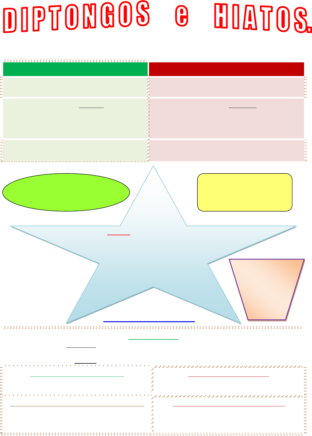 CONOCE LA LENGUA ESPAÑOLA. CEIP Manuel Siurot (La Palma del Condado). La “y” puede ser una vocal (si aparece al final de una palabra), o una consonante. Cuando en una palabra aparecen dos vocales juntas, pueden pertenecer a la misma sílaba o a sílabas distintas. Entonces se produce un diptongo o un hiato. Vamos a ver cuando se da cada caso: DIPTONGOS (“juntas”). HIATOS (“se separan”) Las dos vocales forman parte de la misma sílaba, ya que al hablar se pronuncian juntas en una sola sílaba. Las dos vocales forman parte de distintas sílabas, ya que al hablar se pronuncian separadas, en distintas sílabas. Una vocal cerrada SIN TILDE (i / u) + una vocal abierta, con o sin tilde, da igual (a / e / o). Y viceversa (abierta + cerrada sin tilde). Una vocal cerrada CON TILDE (í / ú) + una vocal abierta, con o sin tilde, da igual (a / e / o). Y viceversa (abierta + cerrada sin tilde). Dos vocales cerradas (i+u / u+i) con o sin tilde. Dos vocales abiertas (a / e / o), con o sin tilde; o dos vocales cerradas iguales, con o sin tilde (u+u o i+i). OOTTRROOSS CCAASSOOSS TRIPTONGOS Se producen cuando tres vocales forman parte de una misma sílaba. Siguen las mismas reglas que los diptongos. (Las palabras agudas terminadas en triptongo con “y” final no llevan tilde, aunque deberían llevarla: Uruguay…) Ejemplos: miau, apreciéis, tatuáis, Paraguay, buey, renunciáis… PALABRAS CON DOS DIPTONGOS En una misma palabra pueden aparecer dos diptongos a la vez: Australia, Tailandia, Claudia, Suecia, Mauricio… PALABRAS CON DOS HIATOS En una misma palabra pueden aparecer dos hiatos a la vez: aéreo, aérea… PALABRAS CON DIPTONGOS E HIATOS A LA VEZ En una misma palabra pueden aparecer un diptongo y un hiato a la vez (o más): Ainhoa, esternocleidomastoideo (tiene dos diptongos y un hiato), aeropuerto… HIATOS QUE SEPARAN A TRES VOCALES Sería el caso contrario al triptongo. Podría llamarse “trihiato”: oía, reía, veías… Incluso con ¡4 vocales! (“trihiato” + diptongo): reíais, oíais… TRUCO: dos vocales se separan si: - Aparece la “i” o la “u” con TILDE + “a, o, e” (“vocales con circulito”). - O si aparecen la “a, e, o” juntas (“vocales con circulito). - O si aparecen “uu” o “ii”. Hay palabras que no deberían llevar tilde según las Reglas Generales de Acentuación, pero debido al hiato la llevan: Andalucía (llana y acaba en vocal), raíl, reír, evalúas… La “h” intercalada no se tiene en cuenta en los diptongos e hiatos, es como si no existiera. Ejemplos: ahumado, almohada, ahí, búho… CONOCE LA LENGUA ESPAÑOLA. CEIP Manuel Siurot (La Palma del Condado). CUADRO DE EJEMPLOS (con todos los casos de situaciones posibles). DIPTONGOS HIATOS ia: acacia, Adrián, alcaide, Albania, Alemania, Alicia, Arabia, Argelia, arriar, arriate, Asia, asiático, Babia, Bosnia, Bulgaria, cambiar, Checoslovaquia, circunstancia, circunstancial… ai: ahijado, Aida, aire, aislar, amainar, ay, bailar, bailarín, Bombay, caimán, (El) Cairo, caray, ensaimada, espray, hay, Maicena, Mairena, mosaico… ae: acaecer, aeronave, aeropuerto, Baena, Báez, caer, decaedro, decaer, dodecaedro, faena, Jaén, Maestranza, maestro, octaedro, octaédrico, paella… ea: abofetear, abuchear, afear, Andrea, apnea, Atenea, babear, Beatriz, Benjumea, cesárea, cineasta, cocear, cojear, coquetear, córnea, cornear… ie: abierto, acierto, ambiente, apriete, asciende, bien, bienvenido, caliente, cien, cierne, ciervo, cliente, conciencia, concierne, concierto, crie, crié, cuatrocientos, desciende, diciembre… ei: aceite, beige, Beirut, despeinar, empeine, Heidi, ley, moviéndose, murciélago, nieto, nieve, nimiedad, noviembre, peinar, peine… eo: abucheo, acordeón, anteojos, cabreo, cesáreo, cetáceo, coqueteo, Cleopatra, Coliseo, creó, cretáceo, deseo, deseoso, Eliseo, estereotipo, famoseo, fariseo… oe: aloe, coeducación, coeficiente, coercitivo, cohete, corroer, héroe, Noé, Noelia, Noemí, poema, poesía, poeta, proeza, roedor, soez… io: acuario, adquisición, afección, antimonio, antibiótico, Antonio, anuncio, Arsenio, avión, biblioteca, biótico, camión, canción, capricornio, coacción, coito, columpio… oi: androide, boina, cenozoico, coincidir, coito, convoy, cowboy, Eloy, espermatozoide, estoico, estoy, fanerozoico, heroico… oa: Abengoa, almohada, azoar, boa, barbacoa, Boabdil, boato, canoa, cloaca, coágulo, coartar, croar, koala, incoar, Lisboa, loar, oasis, ocozoal, proa, roaming… ao: ahogar, ahora, ahorcado, ahorrar, aorta, bacalao, baobab, Bilbao, cacao, chao, callaos, caoba, caos, caótico, faraón, karaoke, Laos, Macaos, Mahón… ua: acuático, agua, aguador, aguanta, cuaderno, cuadro, cuajada, cuarto, cuatro, Ecuador, Eduardo, Guadalupe, Guadalquivir, Guadiana, guapo, guapura, igual, Juan… au: aplaudir, aula, aullar, aunque, Aurora, autista, auto, auxiliar, auxilio, bautizo, Cáucaso, causa, cauterizar, defraudar, exhausto, fatuo, fauces, fauna, fauno… aa: Aarón, albahaca, azahar, Azahara, Sahara… ee: babee (babeé), cacaree, canee, cojee, creer, desee, leer, mee, patee, pelee, preelegir, preexistencia, reeditar… oo: alcohol (alcohólico…), cohombro, cooperar (cooperador…), coopositor, cooptar, coordenada, coordinar (coordinador…) ue: absuelto, abuelo, abuñuelado, buñuelo, cacahuete, cigüeña, consuelo, cruel, crueldad, cuece, cuenco, cuéntame, cuesco, cuesta, después, esfuerzo, fue, fuego… eu: Ceuta, deuda, eucalipto, eunuco, Eureka, Europa, farmacéutico, feudal, neumático, pseudónimo, reubicar, reunir, reunión, Reus, terapéutico… ía: acabaría, agradecía, alcancía, Andalucía, armonía, baldía, biografía, carnicería, cronología, daría... íe: alíe, andalusíes, confíe, críes, desconfíe, fíe, fríes, líe, píe, porfíe, ríe, sonríe, suníes, surubíes… ío: baldío, Clío, crío, Darío, frío, hastío, lío, mío, navío, río, período, pío, Rocío, tío, vacío… uo: acuoso, ambig