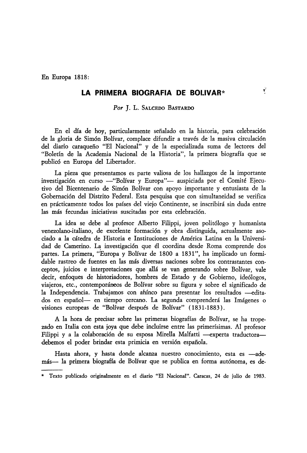 En Europa 1818: LA PRIMERA BIOGRAFIA DE BOLIVAR* Por J. L. SALCEDO BASTARDO En el día de hoy, particularmente señalado en la historia, para celebraci6n de la gloria de Sim6n Bolívar, complace difundir a través de·la masiva circulación del diario caraqueño "El Nacional" y de la especializada suma de lectores del "Boletín de la Academia Nacional de la Historia", la primera biografía que se publicó en Europa del Libertador. La pieza que presentamos es parte valiosa de los hallazgos de la importante investigaci6n en curso -"Bolívar y Europa"- auspiciada por el Comité Ejecu- tivo del Bicentenario de Simón Bolívar con apoyo importante y entusiasta de la Gobernación del Distrito Federal. Esta pesquisa que con simultaneidad se verifica en prácticamente todos los países del viejo Continente, se inscribirá sin duda entre las más fecundas iniciativas suscitadas por esta celebraci6n. La idea se debe al profesor Alberto Filippi, joven politólogo y humanista venezolano-italiano, de excelente formación y obra distinguida, actualmente aso- ciado a la cátedra de Historia e Instituciones de América Latina en la Universi- dad de Camerino. La investigación que él coordina desde Roma comprende dos partes. La primera, "Europa y Bolívar de 1800 a 1831", ha implicado un formi- dable rastreo de fuentes en las más diversas naciones sobre los contrastantes con- ceptos, juicios e interpretaciones que allá se van generando sobre Bolívar, vale decir, enfoques de historiadores, hombres de Estado y de Gobierno, ide6logos, viajeros, etc., contemporáneos de Bolívar sobre su figura y sobre el significado de la Independencia. Trabajamos con ahínco para presentar los resultados -edita- dos en español- en tiempo cercano. La segunda comprenderá las Imágenes o visiones europeas de "Bolívar después de Bolívar" (1831-1883). A la hora de precisar sobre las primeras biografías de Bolívar, se ha trope- zado en Italia con esta joya que debe incluirse entre las primerísimas. Al profesor Filippi y a la colaboración de su esposa Mirella Malfatti -experta traductora- debemos el poder brindar esta primicia en versión española. Hasta ahora, y hasta donde alcanza nuestro conocimiento, esta es -ade- más- la primera biografía de Bolívar que se publica en forma autónoma, es de- * Texto publicado originalmente en el diario "El Nacional". Caracas, 24 de julio de 1983. 268 BOLETIN DE LA ACADEMIA NACIONAL DE LA HISTORIA cir, separada de cualquier otro texto. Salió en fascículo, del mismo tamaño de todos los de la serie de "Vida y retratos de famosos personajes de los últimos tiempos" publicada en Milán en 1818, siguiendo a una iniciativa francesa de 1816 que apareció con el título de "Biografía de Hombres vivos o Historia de todos los hombres que se han hecho notar por sus acciones o sus escritos". El profesor Filippi ha destacado aquí en Caracas, en el reciente Congreso convocado por la Academia Nacional de la Historia, que él comparte la observación de que en la serie milanesa "resalta una creciente subordinación de las biografías a la icono- grafía. -y añade-. El caso de Bolívar .es ejemplar: su imagen, que las exigen- cias editoriales solicitaban por encima de todo y a toda costa, al ser totalmente desconocida y probablemente no sólo en Italia fue inventada de pies a cabeza por Demarchi". Esta lámina de Bolívar, ataviado con una versión moderada del "sombrero Bolívar" muy popular en los círculos liberales y románticos de Europa, se publi- có en Bogotá en 1930 y aparece en la "Iconografía del Libertador" recopilada por Enrique Uribe White, sin otra referencia que "Grabado. Museo Nacional, Bogotá. Catálogo N'? 1831. Dimensiones 0.34 x 0.25. Leyenda: Demarchi Dib. /T.T. Inv./ SIMONE BOLIVAR". Allí se advierte: "Publicada sin indicación de fecha ni origen ... ", esto es, sin la menor pista que ahora revelamos entera. Impresiona mucho la exactitud del texto en cuanto a los hechos de Bolívar, a quien por cierto se considera más joven, asignándole como año de nacimiento el de 1785. Llama la atención que en 1818, cuando Simón Bolívar estaba en el inicio de su trayectoria: todavía sin Angostura, Boyacá, Carabobo, Junín, y sin la convocatoria de Panamá ni la demostración cabal de su grandeza, 'ya se le inclu- yera en la compañía de varones de la talla de Lord Byron, del Vizconde Chateau- briand, de Ugo Foscolo, Fichte, Herder, del príncipe Kutusov-Smolerskoi, de La- place, Mendelssohn, Pastalozzi, Rousseau, Montesquieu, Goethe, Volta, Sir Wal- ter Scott ... El ensayo biográfico termina con un ant1c1po razonable -en la cercana perspectiva de 1819- sobre la creación de .Colombia, y con un voto que reconoce para Bolívar el mérito mayor en la empresa para entonces incierta de la emanci- pación. Ofrecemos el texto completo para deleite y conocimiento de nuestros lec- tores. Los errores son mínimos, y las deducciones tienen el sabor de la época. Nos alegra la prioridad italiana europea en la producción y publicación de una Biografía de Bolívar, apenas sobrepasada en los Estados Unidos por la que el inol- vidable Monseñor Nicolás E. Navarro localizó en el periódico "The Columbian", de Nueva York, entrega del sábado 7 de septiembre de 1816 N'.' 2.115, incluida en la sección de Cartas al Editor. Italia ha tenido en este año de 1983 la prioridad europea en la Celebración Bicentenaria con el imponente acto cumplido en el Ins- tituto !talo-Latinoamericano de Roma, el 4 de febrero, con la presencia de la cúpula entera de los poderes de la República italiana, hecho de alta relevancia, y prestigiado con la asistencia del flamante ·segundo Cardenal de Venezuela, Mon- señor José Alí Lebrún, del ex-presidente de Colombia Julio César Turbay Ayala, de una calificada representación de Venezuela y del cuerpo diplomático acredita- LA PRIMERA BIOGRAFIA DE BOLIVAR 269 do en Roma. Nos correspondió allí la intervención central, y resaltando los víncu- los