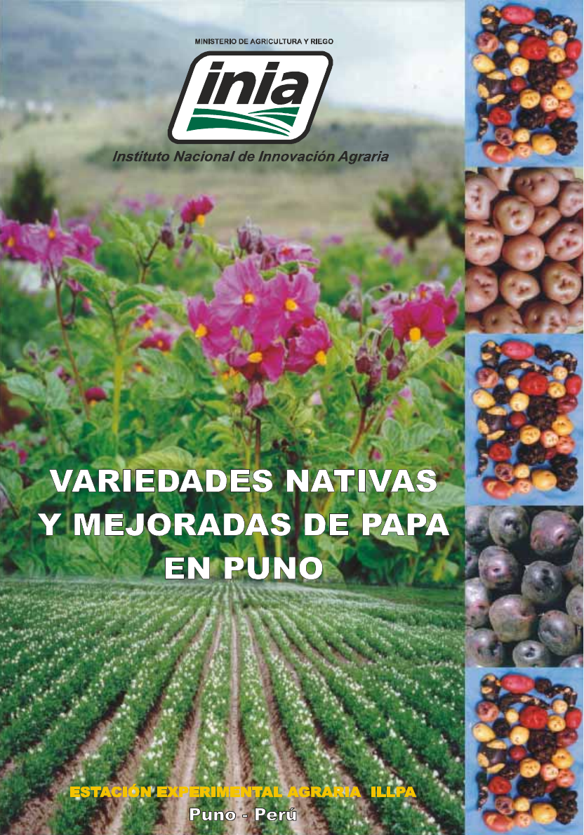 INSTITUTO NACIONAL DE INVESTIGACIÓN AGRARIA DIRECCIÓN GENERAL DE INVESTIGACIÓN AGRARIA PROGRAMA DE INVESTIGACIÓN EN PAPA Y CAMOTE ESTACION EXPERIMENTAL ILLPA-PUNO VVVVVARIEDADES NAARIEDADES NAARIEDADES NAARIEDADES NAARIEDADES NATIVTIVTIVTIVTIVAS YAS YAS YAS YAS Y MEJORADAS DE PMEJORADAS DE PMEJORADAS DE PMEJORADAS DE PMEJORADAS DE PAPAPAPAPAPA ENA ENA ENA ENA EN PUNOPUNOPUNOPUNOPUNO Rodolfo Cahuana Quispe Jesús Arcos Pineda Serie Lima - Perú Libro No 01- 2002 Agosto, 2002 LA PUBLICACIÓN DEL PRESENTE LIBRO HA SIDO FINANCIADA POR LA UNIDAD DE TRANSFERENCIA DE TECNOLOGÍA DE LA ESTACION EXPERIMENTAL ILLPA PUNO © © © © © INSTITUTO NACIONAL DE INVESTIGACION AGRARIA –INIA DIRECCON GENERAL DE INVESTIGACIÓN AGRARIA DIRECCIÓN GENERAL DE TRANSFERENCIA DE TECNOLOGÍA AGRARIA Revisión: Comité de Publicaciones de la Estación Experimental Illpa-Puno Responsables de la Edición: Danilo E. Farfán Loaiza Nicanor De La Riva Aragón Diagramación y Composición Fernando Ruelas Enríquez Primera Edición: Agosto, 2002 Tiraje: 1000 ejemplares CONTENIDO PRESENTACIÓN ....................................................................................... 5 I. INTRODUCCIÓN ....................................................................................... 9 II. ASPECTOS GENERALES DEL CULTIVO DE PAPA EN PUNO ............. 10 2.1. Situación Actual del Cultivo de papa ................................................ 10 2.2. Zonas de producción de papa .......................................................... 11 2.3. Superficie cosechada y rendimientos ............................................... 12 2.4. Diversidad genética de papa ............................................................ 13 2.5. Variedad y cultivar ............................................................................. 15 2.6. Variedades cultivadas de papa ......................................................... 15 2.6.1. Variedades Nativas de papa .................................................. 15 2.6.2. Variedades Mejoradas de papa ............................................. 20 2.7. Evolución Histórica del Mejoramiento de variedades de papa en el Perú ................................................................................. 20 2.8. Perspectivas de la Investigación y Producción de Semilla de papa en Puno .................................................................................... 27 III. CARACTERÍSTICAS DE LAS VARIEDADES NATIVAS Y MEJORADAS DE PAPA .......................................................................... 29 3.1. Variedades Nativas de papa dulce ................................................... 29 * Ccompis ...................................................................................... 30 * Imilla Negra, Yana Imilla, Chiar Imilla ...................................... 32 * Imilla Blanca o Jancko Imilla .................................................... 34 * Sani Imilla ................................................................................... 36 * Imilla Roja o Wila Imilla ............................................................ 38 * Alca Tarma .................................................................................. 40 * Peruanita, Milagro, ofrenda ...................................................... 42 * Sutamari ..................................................................................... 44 * Tuni ............................................................................................. 46 * Casa Blanca ............................................................................... 48 * Amajaya ...................................................................................... 50 * Ccoillo ......................................................................................... 52 * Llujta para ................................................................................... 54 * Alcca Imilla o Santa Rita ........................................................... 56 * Imilla Rosada o Pacco Imilla .................................................... 58 * Acu Talega, Acu Huayacca ....................................................... 60 * Paula ........................................................................................... 62 * Saccampaya ............................................................................... 64 * Puca Mari .................................................................................... 66 * Piña ............................................................................................. 68 * Chiquiña ...................................................................................... 70 * Pitiquiña ...................................................................................... 72 * Candarave .................................................................................. 74 * Albina o Lomo ............................................................................ 76 * Huaycha Puneña ....................................................................... 78 3.2. Variedades Nativas de Papa Amarga ............................................ 81 * Piñaza ......................................................................................... 82 * Loka ............................................................................................ 84 * K’eta ............................................................................................ 86 * Ruckii .......................................................................................... 88 * Parina .......................................................................................... 90 * Parko ........................................................................................... 92 * Kuchijiph’illa ............................................................................... 94 * Ocucuri Morado o Choquepito Morado .................................... 96 * Ocucuri Blanco o Jank
