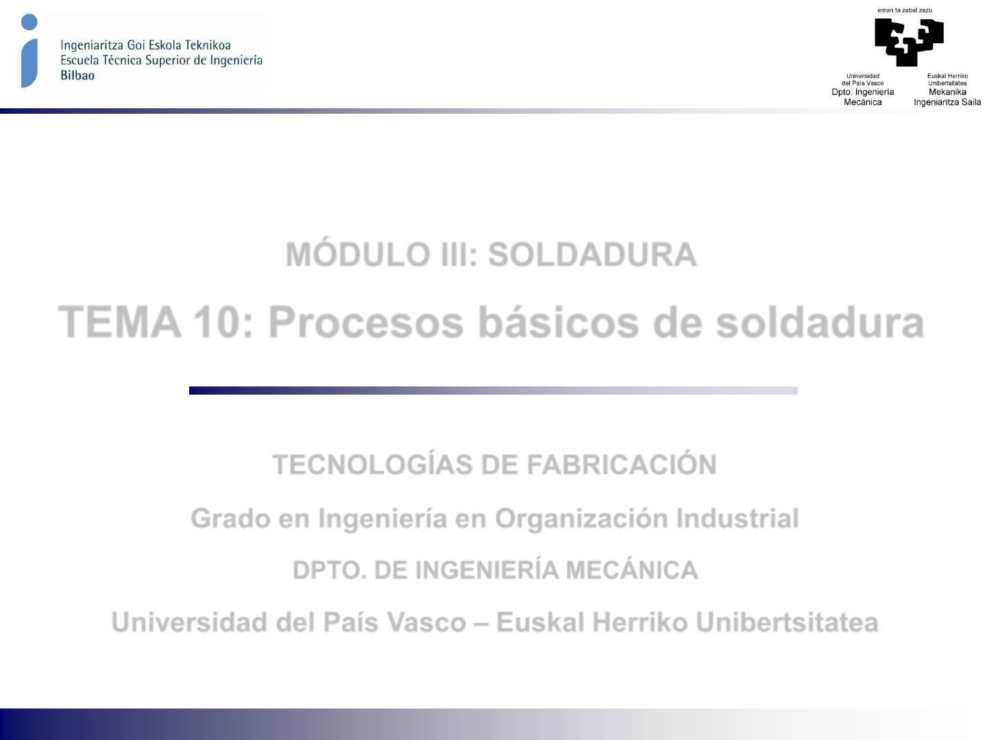 Tema 10: Procesos de soldadura 1/22 MÓDULO III: SOLDADURA TEMA 10: Procesos básicos de soldadura TECNOLOGÍAS DE FABRICACIÓN Grado en Ingeniería en Organización Industrial DPTO. DE INGENIERÍA MECÁNICA Universidad del País Vasco – Euskal Herriko Unibertsitatea Tema 10: Procesos de soldadura 2/22 Contenidos 1. Procesos Termo-Químicos 2. Procesos de Arco Eléctrico - Características comunes - Principales procesos 3. Procesos de Resistencia Eléctrica 4. Ejemplos de Aplicabilidad 5. Cuestionario tutorizado 6. Oportunidades laborales: empresas y productos Tema 10: Procesos de soldadura 3/22 1. Procesos Termo-Químicos Soldadura OXIACETILÉNICA: la energía para al fusión proviene de la combustión de la mezcla de Oxígeno y Acetileno (C2H2) • Procedimiento MANUAL • Metal de APORTACIÓN POR SEPARADO • Poco control del calor aportado: soldaduras de BAJA RESPONSABILIDAD • EQUIPO • Botellas de acetileno y de oxígeno • Mangueras • Soplete • Material de aportación Tema 10: Procesos de soldadura 4/22 1. Procesos Termo-Químicos Soldadura OXIACETILÉNICA: • Regiones de la llama: • DARDO: zona de combustión (brillante) • REDUCTORA: zona de soldadura (azul) • PENACHO: zona de protección (rosada) • Tipos de llama: • NEUTRA: la más utilizada (aceros con bajo contenido en C) • REDUCTORA: temperatura más baja (fundiciones) • OXIDANTE: llama corta con temperaturas muy altas (latones) Tema 10: Procesos de soldadura 5/22 2. Procesos de Arco Eléctrico http://www.youtube.com/watch?v=XX30Qy6QbeM Fundamentos • La energía se obtiene a partir de un arco transferido entre electrodo y pieza. • Concepto de cebado del arco: • Contacto electrodo-pieza • Alta intensidad de corriente, emisión termo-iónica • Separación electrodo-pieza • Ionización del hueco, establecimiento de un canal de plasma conductor • Mantenimiento del arco controlando la distancia electrodo-pieza • Electrodo: • Permanente • Consumible • Gas de protección: • Inerte (Helio, Argon) • Activo (CO2) http://www.youtube.com/watch?v=XX30Qy6QbeM Tema 10: Procesos de soldadura 6/22 2. Procesos de Arco Eléctrico Curvas características del arco y de la fuente • El punto de trabajo (combinación I,V) es el de intersección entre ambas curvas, y debe ser mantenido durante la operación Familia de Curvas Características del arco Curvas Características de diferentes fuentes: de intensidad constante y de tensión constante Tema 10: Procesos de soldadura 7/22 2. Procesos de Arco Eléctrico Influencia del tipo de corriente • CORRIENTE CONTINUA • CORRIENTE ALTERNA • Semi-periodo de polaridad directa: • El electrodo se enfría y se aumenta la penetración del baño • Semi-periodo de polaridad inversa: • Efecto de limpieza del baño • Mayor inestabilidad del arco • Más Q a pieza • Buena penetración • Baño estrecho • Más Q a electrodo • Poca penetración • Baño ancho • Mayor inestabilidad de arco • Efecto “limpiador” de óxidos del baño • Adecuado para electrodo consumible Tema 10: Procesos de soldadura 8/22 2. Procesos de Arco Eléctrico Principales Procesos de Arco Eléctrico • Procesos de Arco protegido por Gas: • Soldadura TIG (GTAW): Tungsten Inert Gas • Soldadura MIG/MAG (GMAW): Metal Inert/Active Gas • Procesos de Arco protegido por polvo decapante • Soldadura con electrodo recubierto (SMAW): Shielded Metal Arc Welding • Soldadura por arco sumergido (SAW): Submerged Arc Welding TIG MIG Electrodos recubiertos SAW http://terpconnect.umd.edu/~deng/stick/pics/stick-welding-rods.JPG Tema 10: Procesos de soldadura 9/22 2. Procesos de Arco Eléctrico SOLDADURA TIG • Electrodo de Tungsteno NO CONSUMIBLE • Gas INERTE de protección: Argón y Helio • Soldadura de ALTA CALIDAD, manual o robotizada Tema 10: Procesos de soldadura 10/22 2. Procesos de Arco Eléctrico SOLDADURA TIG • Generalmente, CORRIENTE CONTINUA y POLARIDAD DIRECTA • En soldadura de Aluminio se usa corriente alterna para limpiar el baño de óxido de aluminio • Electrodo de pequeño diámetro y con punta para focalizar el calor • Soldaduras de gran calidad en todo tipo de posiciones y juntas, aunque no es económica para espesores grandes • Soldadura típica para Aluminio y aleaciones aeronáuticas en juntas de calidad • TIG pulsada: automoción, espesores pequeños • Fuente de característica de intensidad constante • Mayor estabilidad del arco frente a variaciones de longitud Tema 10: Procesos de soldadura 11/22 2. Procesos de Arco Eléctrico SOLDADURA MIG/MAG • El electrodo se emplea como MATERIAL DE APORTACIÓN y se suministra de forma automática • Rango de aplicación muy amplio y generalista. EXCLUYE: • Soldaduras de muy alta calidad • Productividades muy elevadas y soldaduras ocasionales • Materiales: • MIG: aceros de alta aleación, aleaciones de Al, Cu y Ni • MAG: aceros al carbono y de baja aleación. El gas activo proporciona mayor penetración pero mayor riesgo de defectos • Normalmente corriente continua, polaridad inversa Tema 10: Procesos de soldadura 12/22 2. Procesos de Arco Eléctrico • ARCO SPRAY: • Intensidad alta, gran velocidad de depósito y fuerte penetración • GLOBULAR • Intensidad media, menor penetración, superficies horizontales • CORTOCIRCUITO • Contacto electrodo-pieza, soldadura de chapas finas SOLDADURA MIG/MAG: MODOS DE TRANSFERENCIA SOLDADURA MIG/MAG PULSADA: mayor control Tema 10: Procesos de soldadura 13/22 2. Procesos de Arco Eléctrico SOLDADURA MIG/MAG: REGULACIÓN DEL ARCO • El OBJETIVO es conseguir la ESTABILIDAD DEL ARCO de soldadura ante variaciones de longitud del mismo ARCO AUTORREGULADO ARCO CONTROLADO Tema 10: Procesos de soldadura 14/22 2. Procesos de Arco Eléctrico SOLDADURA MIG/MAG: EQUIPAMIENTO • Pistola (incluye refrigeración) • Unidad de alimentación del hilo (electrodo): • Con arco autorregulado, velocidad constante • Con arco controlado, regulación 