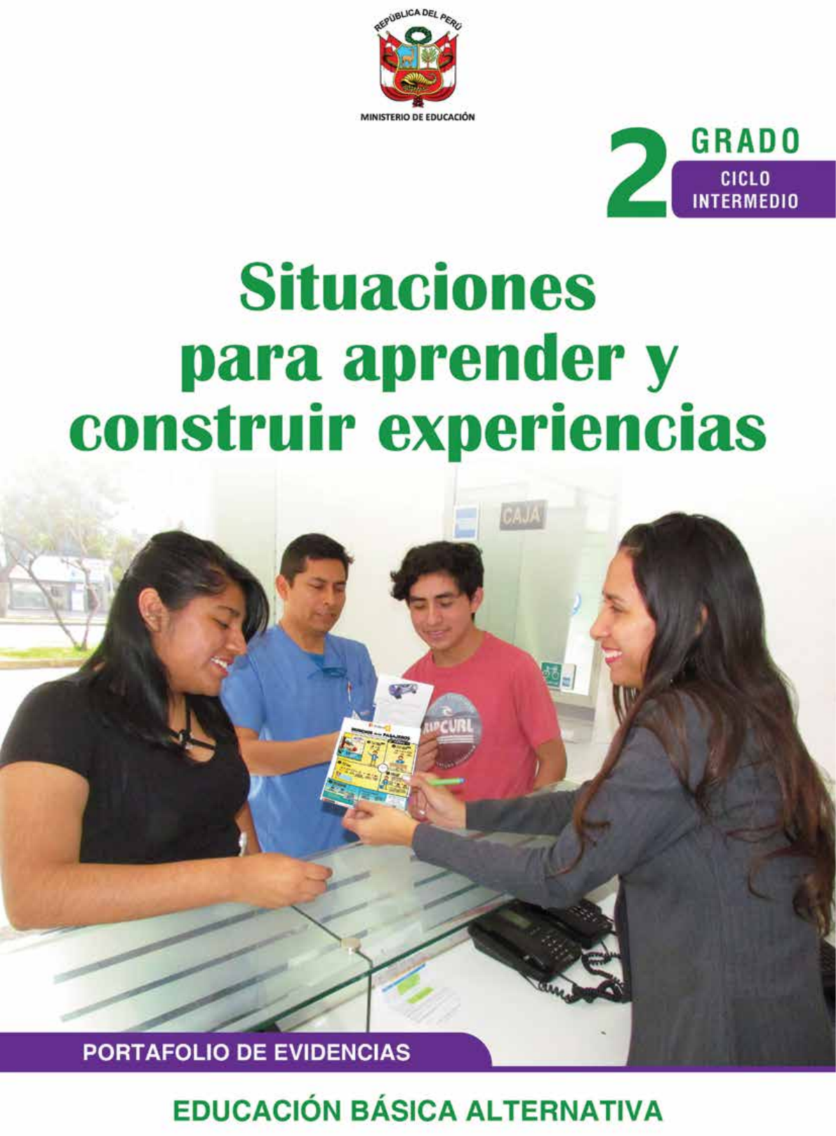 1 Situaciones para aprender y construir experiencias Segundo grado. Ciclo intermedio Portafolio de evidencias - Globalizado © Ministerio de Educación Calle del Comercio 193, San Borja Lima, Perú Teléfono: 615-5800 www.gob.pe/minedu Primera edición: noviembre de 2018 Segunda edición: enero de 2020 Tercera edición: junio de 2020 Tiraje: 21 125 ejemplares Revisión pedagógica Pedro Christian Pachas Vivanco, Diana Clara Zavala Rodríguez, Fernando Barboza Venegas, Renato Ramiro Cajahuamán Bravo, Rosa Luz Montañez Bambaren Reajuste de diseño y diagramación Julio César García Acuña Cuidado de edición de contenidos Menna Petronila Salazar Ayllón, Diana Clara Zavala Rodríguez, Pedro Christian Pachas Vivanco, Fernando Barboza Venegas, Alejandro Jorge Aliaga Artica, Renato Ramiro Cajahuamán Bravo Cuidado de edición gráfica Ursula L. Clavarino Cortez Julio César García Acuña Hecho el Depósito Legal en la Biblioteca Nacional del Perú N.° 2020-01799 Se terminó de imprimir en febrero del 2020, en los talleres gráficos de la empresa Pacífico Editores S.A.C, sito en Jr. Castrovirreyna 224 - Breña. Todos los derechos reservados. Prohibida la reproducción total o parcial de este documento sin permiso del Ministerio de Educación. Impreso en el Perú / Printed in Peru MINISTERIO DE EDUCACIÓN Dirección General de Educación Básica Alternativa, Intercultural Bilingüe y de Servicios Educativos en el Ámbito Rural (Digeibira) Dirección de Educación Básica Alternativa (DEBA) 3 Estimado estudiante: El material educativo Situaciones para aprender y construir experiencias pertenece al segundo grado del ciclo Intermedio de Educación Básica Alternativa (EBA). El material está compuesto por un Texto y un Portafolio de evidencias, cada uno de los cuales contiene ocho unidades de aprendizaje explícitamente relacionadas con los ámbitos de la vida de las personas jóvenes y adultas. Texto Portafol io de evidencias Índice de unidades del portafolio Unidad Nombre de la unidad Página 1 Recorremos caminos de esperanza 6 2 Mi nuevo terruño es mi segundo hogar 38 3 La creatividad nos ayuda a emprender 72 4 Valoramos las diferencias y nos cuidamos 104 5 Los valores del pasado son un valioso presente 138 6 Un paseo en el tiempo: historia y biodiversidad 172 7 Somos responsables del ambiente 206 8 En busca de un bien común: trabajo, productividad y emprendimiento 238 4 Estructura del portafolio 1Unida d 76 Recorremos caminos de esperanza Describe oralmente la portada a un compañero. Reflexiona a partir de las siguientes preguntas: � ¿Qué crees que quiere expresar el título de la unidad? � ¿Consideras que los peruanos recorremos caminos de esperanza? ¿En qué sentido? Compartimos lo que sabemos 1. Pon a prueba tus conocimientos sobre las festividades del Perú. Luego, comparte las respuestas con un compañero. 3. Dialoga con un compañero. a. ¿Qué son los acuerdos y normas de convivencia? b. ¿Consideras que son necesarios en el aula? ¿Por qué? c. ¿Cuál crees que es una norma que se debe considerar en tu aula? Explica. Fiesta Fecha de celebración Corpus Christi Cusco. La Virgen de Candelaria en Puno. Las celebraciones de la Semana Santa en Ayacucho. La procesión del Señor de los Milagros en Lima. La fiesta de la Virgen del Carmen en Paucartambo (Cusco). La peregrinación al Santuario del Señor de Qoyllurit'i. La Fiesta de San Juan en la región amazónica 2. Dibuja o pega una imagen que represente una manifestación cultural de tu familia. Luego, explica oralmente por qué la elegiste. Fuente: https://bit.ly/2NsJG8i Imagen mot ivadora Ubica los temas de las áreas en situaciones reales y cotidianas, e incentiva el diálogo. Número de la unidad Número de página Actividades Permiten desarrollar y demostrar los desempeños alcanzados en cada área. Preguntas de apertura Inician el diálogo y exploran tus conocimientos relacionándolos con contextos reales y cercanos. A lo largo del portafolio, encontrarás los siguientes elementos: J Personajes dinamizadores. Te brindan recomendaciones y te ayudan a construir las ideas de cada área. J Íconos. Orientan las acciones que debes realizar. Indica que debes observar un video en el CD que viene con tu portafolio. Indica que la actividad debe realizarse en grupo. Indica que la actividad debe realizarse individualmente. Nombre de la unidad 5 Instrumentos de evaluación Se presentan rúbricas y listas de cotejo con el objetivo de garantizar la evaluación de los desempeños. Juegos Ayudan a aplicar de manera divertida los desempeños adquiridos. Actividades del proyecto Permiten que apliques lo que has aprendido en las distintas áreas en una situación real que te motive a reflexionar y demostrar tus desempeños. Actividades para demostrar aprendizajes Lo que puedo hacer Demuestro lo que aprendí Actividades variadas Para aplicar en contexto lo desarrollado en clase. Hay actividades individuales, en pareja y grupales. Solapa Indica el área que se está desarrollando. 171 b. Elaboramos el borrador del díptico sobre las tradiciones. Enumera los aspectos que desarrollarás en él. Paso 3. Publico. a. Exponemos el díptico. Tomamos en cuenta que uno de los dos tendrá que presentar brevemente el producto. Paso 4. Evalúo. a. Marco con un Sí o No según corresponda. Criterios Sí No Las tradiciones elegidas son representativas de la región. El díptico elaborado cumplió con las características recomendadas. Mi grupo presentó con la claridad nuestro díptico. 135 Áreas Competencias Capacidades Logrado En proceso En inicio D es ar ro llo P er so na l y Ci ud ad an o Construye su identidad. Se valora a sí mismo. Explico la importancia de la privacidad. Explico con ayuda la importancia de la privacidad. No sé con exactitud qué es privacidad. Reflexiona y argumenta éticamente. Investigo sobre enfermedades infecciosas. Investigo con ayuda sobre enfermedades infecciosas. No conozco cuáles son las enfermedades infecciosas
