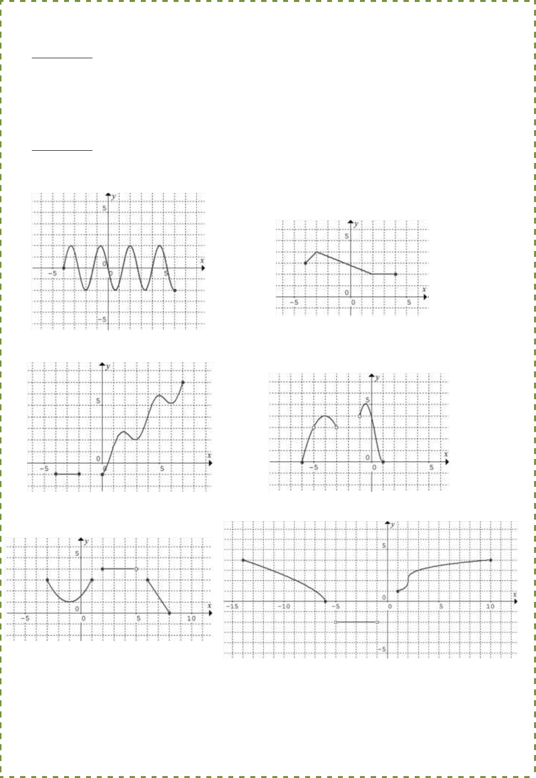 Prof. Noelia Aquino 5to 1ra Eco. Ejercicio 6: Indiquen el dominio de cada una de las siguientes funciones: a. Precio de un paquete de galletitas en función del peso. b. Cantidad de harina necesaria para una receta en función de las porciones que se quiere hacer. c. Variación de la temperatura en una ciudad en función del tiempo. Ejercicio 7: Indica mediante intervalos el dominio y la imagen de cada función. Se colocaron puntos en los extremos del gráfico para indicar que el mismo no continúa. a. b. c. d. e. f. Prof. Noelia Aquino 5to 1ra Eco. g. h. i. j. k. l. Prof. Noelia Aquino 5to 1ra Eco. Ejercicio 8: ¿Cómo es posible hallar el dominio de las siguientes funciones? a. b. Ejercicio 9: Unan cada función con su dominio. Ejercicio 10: Hallen el dominio de las siguientes funciones. a. b. c. d. e. f. g. h. i. j. k. l. m. n. o. p. q. r. s. t.