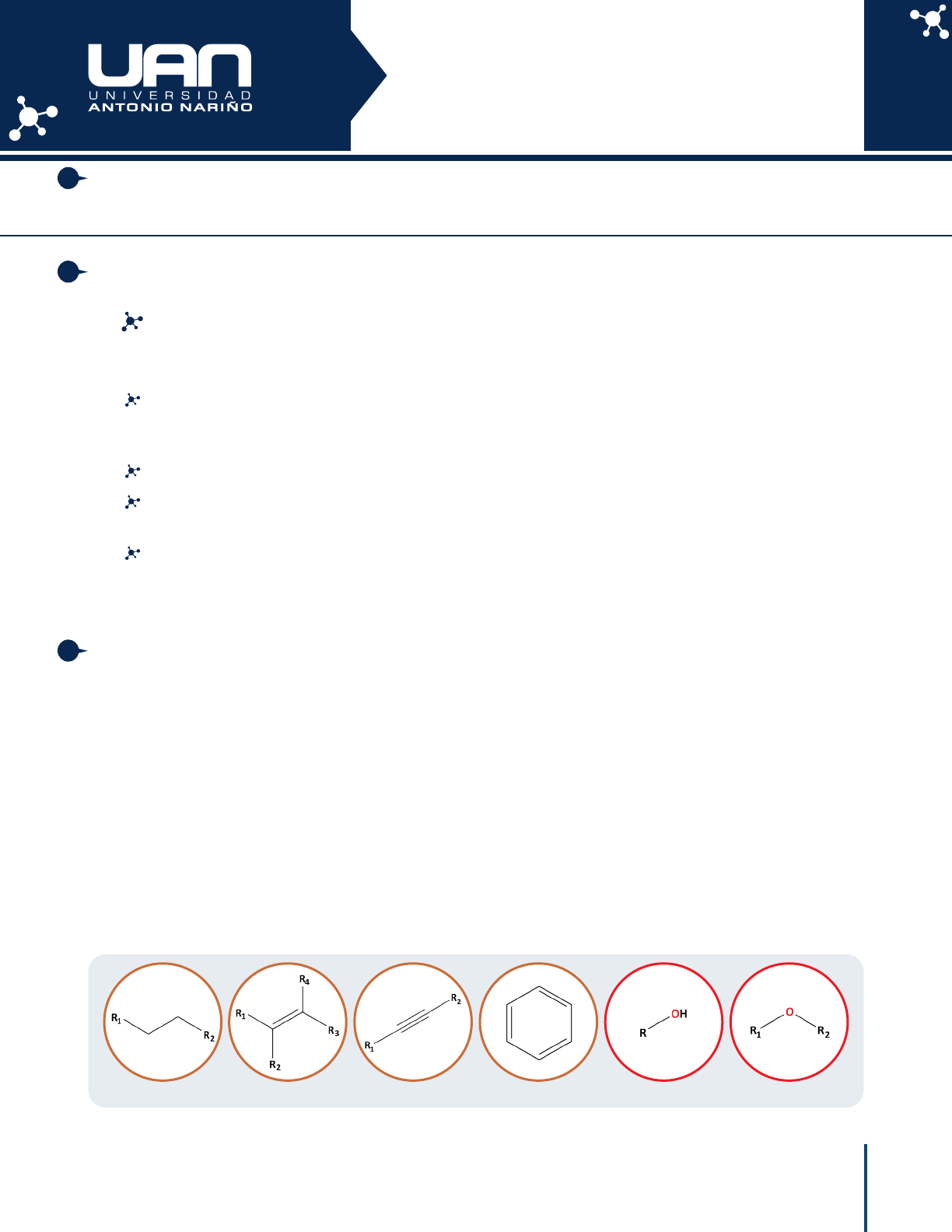 Guía 5 1/7 RECONOCIMIENTO DE GRUPOS FUNCIONALES ORGÁNICOS OBJETIVOS Identificar los grupos funcionales presentes en compuestos orgánicos por medio de reacciones específicas para cada función orgánica mediante las pruebas de clasificación. Generales: Reconocer e identificar la diferencia de reactividad entre alcoholes primarios, secundarios y terciarios a través de la reacción de sustitución (reactivo de Lucas) y diferenciar entre alcoholes alifáticos y aromáticos por medio de la prueba del ión férrico. Reconocer e identificar el carácter reductor de los aldehídos a través de la reacción de Tollens. Reconocer la presencia de ácidos carboxílicos a través de la prueba del yodato-yoduro. Así como la identificación de la presencia de aminas a través de la prueba con el ión cobre. Establecer un mecanismo de reconocimiento de compuestos orgánicos por medio de sus propiedades químicas de forma experimental con el fin de complementar el desarrollo de los conocimientos teórico prácticos. Específicos: 1 2 REFERENTES CONCEPTUALES En química orgánica se conoce como grupo funcional al átomo o grupo de átomos que define la estructura de una familia particular de compuestos orgánicos y al mismo tiempo determina sus propiedades. La aplicación de pruebas de clasificación se lleva a cabo después de una serie de pruebas físicas y químicas. Como identificación química de compuestos orgánicos, se busca información específica frente a la presencia de un determinado conjunto de grupos funcionales por medio de reacciones específicas llevadas a cabo en los procedimientos experimentales. En la figura 1 se presentan las familias mas representativas de los compuestos orgánicos indicando su grupo 1 funcional. Las reacciones típicas de cada función orgánica ocurren en el grupo de átomos que constituyen el grupo funcional y son estos grupos los que permiten realizar una identificación cualitativa de la molécula. Tanto las propiedades físicas (punto de fusión y ebullición, solubilidad, densidad, etc.) y químicas en términos de la reactividad de los compuestos orgánicos dependen de los grupos funcionales que contenga. 3 Grupos funcionales orgánicos Alquenos Alquinos Aromáticos ÉteresAlcoholesAlcanos Figura 1: Principales grupos funcionales orgánicos. FACULTAD DE CIENCIAS DEPARTAMENTO DE QUÍMICA Asignatura: Bioquímica I Ciencias de la salud Título de la práctica de laboratorio: 2/7 FACULTAD DE CIENCIAS DEPARTAMENTO DE QUÍMICA Fenoles Aldehídos Cetonas Ácidos carboxílicos Ésteres Anhídridos AminasAmidas Haluro de acilo Iminas Nitrilos Tioles Figura 1 (continuación): Principales grupos funcionales orgánicos. Identificación de grupos funcionales orgánicos Diferenciación entre alcoholes primarios, secundarios y terciarios (Ensayo de Lucas) Al reaccionar un alcohol con el reactivo formado por HCl y ZnCl (reactivo de Lucas) se produce un halogenuro de 2 2alquilo. Los alcoholes terciarios reaccionan con facilidad con ZnCl /HCl concentrado para producir cloruros de 2 alquilo insolubles en agua (ecuación 1), mientras que los secundarios reaccionan lentamente y los primarios permanecen prácticamente inertes. La prueba no es válida para alcoholes arílicos o insolubles en agua. Alcohol rio rio (3 o 2 ) Ácido Clorhídrico Halogenuro de alquilo Agua Identificación de aldehídos - Ensayo con el reactivo de Tollens Los aldehídos se caracterizan y distinguen en particular de las cetonas por su facilidad de oxidación. Por regla 3general casi cualquier reactivo que oxide un alcohol, oxida también un aldehído. Las sales de permanganato y dicromato son los agentes oxidantes mas empleados, pero no son los únicos reactivos que se pueden utilizar. Los + +2 aldehídos también se pueden oxidar mediante agentes oxidantes suaves tales como Ag o Cu . El reactivo de Tollens (solución alcalina de un complejo plata-amoniacal) se utiliza como prueba para +reconocimiento de aldehídos. El grupo aldehído se oxida al anión carboxilato, la Ag en el reactivo de Tollens se reduce a plata metálica (espejo de plata) como se muestra en la ecuación 2. (Ec. 1) ZnCl₂ Plata metálica (Espejo de plata) (Ec. 2) Aldehído Complejo diamina-plata Carboxilato 3/7 FACULTAD DE CIENCIAS DEPARTAMENTO DE QUÍMICA Identificación de ácidos carboxílicos - Ensayo del yodato/yoduro Un prueba que se utiliza para el reconocimiento de ácidos carboxílicos es el ensayo del yodato-yoduro: Esta prueba se basa en la reacción entre el yodato y el yoduro que en medio débilmente ácido (proporcionado por un 4ácido carboxílico), ocurre rápidamente liberando yodo el cual se detecta fácilmente con almidón (ecuación 3). Otros grupos funcionales como las aminas se pueden reconocer en el laboratorio con el ensayo del ión cúprico y los fenoles con la prueba del ión férrico. Ácido carboxílico Yodato de potasio Yoduro de potasio Carboxilato de potasio Agua Yodo (Ec. 3) Materiales y equipos Reactivos Materiales que debe traer el estudiante Ÿ Elementos de bioseguridad (Bata, guantes de nitrilo, monogafas). Ÿ Toallas absorbentes. Ÿ Marcador Sharpie y Encendedor. MATERIALES, EQUIPOS Y REACTIVOS4 10. Tubo de ensayo. 1. Gradilla. 1. Pinza para tubo de ensayo. 1. Beaker de 250 mL. 10. Pipeta Pasteur de plástico. 1. Agitador de vidrio. 1. Frasco lavador. 1. Plancha de calentamiento. 1 mL Etanol. 1 mL terc-butanol. 1 mL Formaldehído. 1 mL Ácido cítrico 5%. 1 mL KIO 4%.3 1 mL KI 2%. 1 mL Almidón 0,1%. 1 mL Trietanolamina. 1 mL CuSO 10%.4 0,5 g Fenol. 1 mL FeCl 2,5%.3 1 mL Reactivo de Tollens. 3 mL Reactivo de Lucas. 1 mL HNO 0,1 M3 Agua destilada. PROCEDIMIENTO5 Ÿ En un tubo de ensayo limpio y seco agregue 0,5 mL de etanol. Posteriormente agregue 0,5 mL de reactivo de Lucas. No agitar Ÿ Dejar reposar la mezcla (10 min aprox.) Ÿ Repita este procedimiento reemplazando el etanol por el terc-butanol. 1. Prueba de Lucas - Diferenciación entre alcoholes primarios, secundarios y terciarios Ÿ 