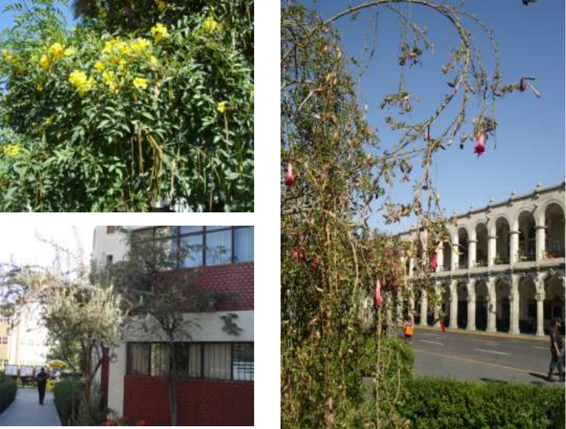 0 SELECCIÓN DE ESPECIES ADECUADAS PARA FORESTAR Y REFORESTAR LA CIUDAD AREQUIPA Por: Blga. Eliana Linares Perea A: Gerencia del Centro Histórico y Zona Monumental Municipalidad Provincial de Arequipa AREQUIPA – JULIO 2008 1 RESUMEN Se presenta la propuesta de 13 especies de plantas para forestar y reforestar la ciudad de Arequipa, especies nativas y algunas adaptadas a las condiciones climatológicas y de aridez de la ciudad. Alternativa de especies que deben ser utilizadas dentro del casco urbano por sus caracteres morfológicos y fisiológicos, para hacer un uso adecuado del recurso hídrico, contrarrestar la alta incidencia solar, aportar oxígeno al ambiente, proporcionar bienestar a la población y promocionarlas como parte de las bondades turísticas de la ciudad. Estas especies son: Acacia macracantha – “huarango”, Adenathera colubrina – “vilco”, Buddelja coriácea – “colle”, Caesalpinea spinosa -“tara”, Cantua buxifolia “cantuta”, Cantua candelilla “cantuta”, Jacaranda mimosifolia - “jacaranda”, Polylepis rugulosa “queñoa”, Salix humboltiana – “sauce”, Schinus molle – “molle”, Tecoma arequipensis – “cahuato o huarango”, Tecoma sambucifolia – “huaranhuay” y Thuja orientalis – “árbol de vida”. I. INTRODUCCION La Región Arequipa está influenciada por dos grandes fenómenos naturales: la corriente peruana de aguas frías y la Cordillera de los Andes. Estas dos influencias provocan una diversa gradación ambiental altitudinal, con indicadores comunes como son su extrema aridez en la costa y sequías constantes en las vertientes occidentales y valles interandinos; asociado a ello están las temperaturas frías y las heladas en las altas punas. En estas condiciones y sobre una fisiografía sumamente accidentada se ha generado, a través de un proceso de selección natural y evolución de cientos de miles de años, un recurso forestal con especies de plantas que llegaron a formar bosques, y constituir hermoso jardines como los del convento de Santa Catalina. La Región Arequipa tiene una superficie de 6.352.462 hectáreas, de las que sólo 1.412.029 son utilizadas para actividades agropecuarias (22%). De este total, 1.284.325 hectáreas son pastos naturales, 37.601 son montes o bosques y 90.102 tierras agrícolas. (Talavera et al., 1999). El casco urbano de la ciudad de Arequipa se ha desarrollado con muy poca planificación dentro de un valle y sobre áreas agrícolas rodeadas con vegetación de condiciones xéricas, áreas ubicadas ahora en los alrededores y que cada día se van 2 perdiendo por el aumento de edificaciones. El centro de Arequipa particularmente carece de vegetación y la poca que hay, se ha instalado sin considerar la protección y manejo del medio ambiente. No se han tomado en cuenta los factores ecológicos relacionados con especies de otros lugares que pueden resultar invasoras, y todo lo que aporta un área de vegetación en medio de un casco urbano, que debe contribuir a la estética y al sosiego de los vecinos “Arborizar” una calle céntrica y comercial y mejorar un parque, debe hacerse teniendo en cuenta los factores ecológicos del área, para conseguir un hábitat adecuado que proporcione oxigeno, armonía y descanso, en un medio muy contaminado y por el cual transitan diariamente muchas personas. 1.1 Objetivo Uso de especies vegetales forestales adaptadas a las condiciones climatológicas y xéricas de la ciudad de Arequipa, en la forestación de la calle Mercaderes y reforestación de la plaza 15 de Agosto, como alternativa para mejorar el bienestar social de la población y la estética de la ciudad en armonía con su arquitectura. 1.2 Justificación de la propuesta El crecimiento poblacional en la ciudad de Arequipa y por ende la acelerada contaminación por el parque automotor, ha generado espacios comerciales saturados que resulta cansado caminar por ellos, en lugar de constituirse en un hábitat adecuado y armonizado con la arquitectura de la ciudad. Por lo cual es básico, pensar y ejecutar proyectos de forestación y reforestación considerando las condiciones climatológicas extremas de nuestra localidad para mitigar la alta radiación solar, la escasez del recurso hídrico y proporcionar bienestar a la población. 1.3 Antecedentes Se han realizado reforestaciones y forestaciones en toda la ciudad, verdeando calles, jardines, parques, bermas centrales y laterales con especies de plantas cuyos requerimientos fisiológicos son mayores a los que las condiciones de la ciudad puede darles. 3 Ubicación biogeográfica de Arequipa Los departamentos de Arequipa (15,6ºS), Moquegua y Tacna (17,5ºS), y el departamento de Puno, desde la frontera de Tacna hasta la localidad de Mazo Cruz (Fig. 1, Fig. 7). Geográficamente se trata de la continuación hacia el N del altiplano boliviano, interrumpido por la cuenca del lago Titicaca, y caracterizado por una enorme cadena volcánica [Chachani (6075 m), Misti (5822 m), Pichu Pichu (5571 m), Ubinas (5672 m), Omate (5151 m), Ticsani (5391 m), Tutupaca (5815 m), Yucamani (5497 m)], coladas de lava más o menos planas y cuencas endorreicas con salares mucho más pequeños que los chilenos y bolivianos. En cuanto a la hidrografía podemos destacar las lagunas situadas a más de 3000 m de altitud. De N a S podemos destacar Salinas, Lagunillas, Jucumarim, Ajuachaya, Viscachas, Suches y Aricota. Los principales ríos que vierten sus aguas al océano Pacífico son Colca, Tambo, Moquegua, Locumba, Sama y Caplina. El relieve volcánico y glacial configuran la orografía del territorio, con numerosos conos volcánicos y coladas de lavas de diferentes edades, sobre todo de origen terciario. También destacan rocas volcánico-sedimentarias que por erosión forman valles profundos y abarrancamientos, y extensas áreas de arenas volcánicas que constituyen depósitos eólicos sedimentarios. El relieve glacial aparece representado por pequeños circos glac