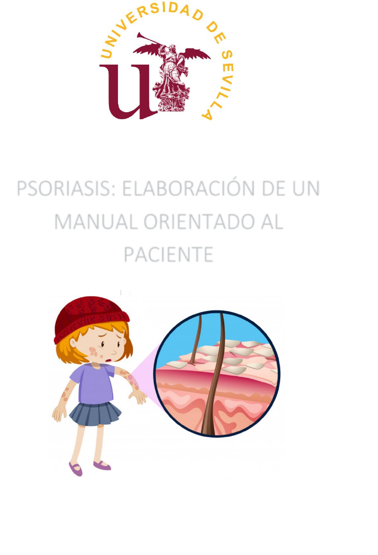 UNIVERSIDAD DE SEVILLA FACULTAD DE FARMACIA PSORIASIS: ELABORACIÓN DE UN MANUAL ORIENTADO AL PACIENTE Autor: Gabriel Naranjo Ordóñez UNIVERSIDAD DE SEVILLA Facultad de Farmacia TRABAJO FIN DE MÁSTER Máster en Especialización Profesional en Farmacia. Especialidad: Gestión y Calidad Asistencial en la Oficina de Farmacia Título del trabajo: “Psoriasis: Elaboración de un manual orientado al paciente” Autor: Gabriel Naranjo Ordóñez Lugar y fecha de presentación: Sevilla, julio 2020 Departamento: Farmacología Tutora: Elena María Talero Barrientos Tipología del trabajo: Bibliográfico Código Seguro De Verificación Wvc5QOfWHa33gmqoDXP1XA== Fecha 29/06/2020 Firmado Por MARIA CONCEPCION PEREZ GUERRERO Url De Verificación https://pfirma.us.es/verifirma/code/Wvc5QOfWHa33gmqoDXP1XA== Página 1/1 ELENA MARÍA TALERO BARRIENTOS, Profesora Titular del Departamento de Farmacología de la Universidad de Sevilla, INFORMA, que el presente trabajo titulado Psoriasis: Elaboración de un manual orientado al paciente ha sido realizado, bajo mi tutorización y asesoramiento, dentro del Departamento de Farmacología durante el curso académico 2019/20, constituyendo la memoria que presenta el Ldo. GABRIEL NARANJO ORDÓÑEZ como Trabajo Fin de Máster del Máster en Especialización Profesional en Farmacia, especialidad Gestión y Calidad Asistencial en la Oficina de Farmacia , y que cumple los requisitos necesarios para ser presentado como Trabajo Fin de Máster. Y para que conste, a los efectos oportunos, se expide el presente informe en Sevilla, a 29 de Junio de 2020 TALERO BARRIENTOS ELENA MARIA - 77803902P Digitally signed by TALERO BARRIENTOS ELENA MARIA - 77803902P Date: 2020.06.30 22:38:03 +02'00' Fdo.: Elena Mª Talero Barrientos Vº Bº Fdo.: [CONCEPCIÓN PÉREZ GUERRERO Director del Departamento RESUMEN Introducción: La psoriasis es una enfermedad crónica con afectación cutánea, que aparece en individuos con predisposición genética, aunque es necesario la participación de determinados factores externos para su activación. No suele comprometer la vida de la persona, pero si su calidad de vida, al cursar con otras patologías. No se desarrolla de igual forma durante toda la vida, alternando periodos de brotes con etapas libres de la enfermedad. Se diagnostica de forma clínica, observando la aparición de nuevas lesiones cutáneas en regiones características. No existe un tratamiento que la cure definitivamente, pero el mayor conocimiento de su patogenia ha permitido desarrollar nuevas terapias, aumentando así la eficacia terapéutica y el control de la enfermedad. El objetivo del trabajo ha sido revisar el estado actual de la psoriasis, así como la elaboración de un manual y de un tríptico que ayude al paciente a entender mejor la patología que padece. Metodología: Las bases de datos utilizadas han sido PubMed y MedlinePlus, así como diversas guías clínicas elaboradas por asociaciones de pacientes. Resultados: El paciente frecuentemente se siente desinformado sobre la propia enfermedad o sobre cómo debe actuar en determinadas circunstancias. Por ello, es fundamental la realización de manuales sobre la psoriasis. El desarrollado en este trabajo no se limita a explicar los conceptos claves de la patología, ya que, además, informa al paciente sobre cómo debe proceder en numerosas situaciones cotidianas que pueden surgirle durante su vida y donde puede acudir si necesita ayuda. Conclusiones: A pesar de los avances conseguidos sobre nuevas terapias, es necesario continuar investigando para conseguir un tratamiento que permita al paciente tener una mejor calidad de vida. Además, es muy importante que sea tratado de forma sistémica, siga consejos de autocuidado para mejorar el control de la enfermedad y se sienta integrado social y laboralmente. PALABRAS CLAVES Psoriasis, patogenia, tratamiento, manual clínico, autocuidado. ABSTRACT Introduction: Psoriasis is a chronic disease with skin involvement, which occurs in individuals with genetic predisposition, although it is necessary to involve certain external factors for activation. It does not usually compromise the life of the person, but it could compromise his quality of life, when taking with other pathologies. It does not develop in the same way throughout life, alternating periods of outbreaks with disease-free stages. It is diagnosed clinically, observing the appearance of new skin lesions in characteristic regions. There is not treatment that cures it definitively, but the greater knowledge of its pathogenic disease has allowed to develop new therapies, thus increasing the therapeutic efficacy and control of the disease. The objective of the work has been to review the current state of psoriasis, as well as the elaboration of a manual and a triptych that helps the patient to better understand the pathology they suffer. Methodology: The databases used have been PubMed and MedlinePlus, as well as various clinical guides developed by patient associations. Results: The patient often feels uninformed about the disease itself or how he or she should act in certain circumstances. Therefore, manuals on psoriasis are essential. The one developed in this work does not merely explain the key concepts of pathology, since it also informs the patient about how to proceed in numerous everyday situations that may arise during their life and where they can go if they need help. Conclusions: Despite the progress made on new therapies, further research is needed to achieve a treatment that allows the patient to have a better quality of life. In addition, it is very important that you are treated systemically, follow self-care advice to improve disease control, and feel socially and labor-integrated. KEYWORDS Psoriasis, pathogenesis, treatment, clinical manual, self-care. ÍNDICE I. INTRODUCCIÓN .........................................................................................................................1 1. Psoria
