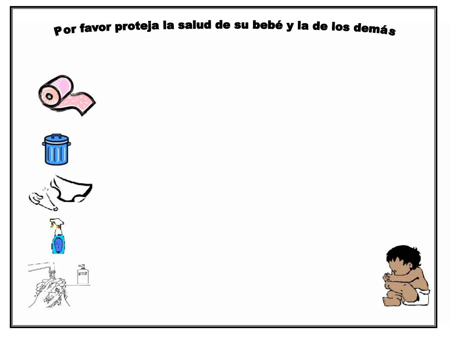 1. Coloque toallas limpias de papel sobre la superficie. 2. Coloque a su bebé sobre las toallas y luego quítele la ropa manchada y el pañal. 3. Limpie a su bebé y bote a la basura las toallitas húmedas usadas (wipes) y el pañal sucio, así como las toallas de papel usadas. Coloque la ropa manchada en una bolsa de plástico. 4. Límpiese las manos con toallitas húmedas y bótelas a la basura. 5. Póngale a su bebé ropa y un pañal limpios. 6. Retire al bebé de la zona para cambiar pañales y lávele las manos. 7. Limpie las áreas que se mancharon en la superficie para cambiar pañales con toallitas húmedas y bótelas a la basura. 8. Rocíe la superficie para cambiar pañales con una solución en aerosol desinfectante y deje que se seque al aire libre. 9. Lávese bien las manos con agua y jabón o use una solución tipo gel para lavarse las manos. ¡Mantenga esta estación limpia!