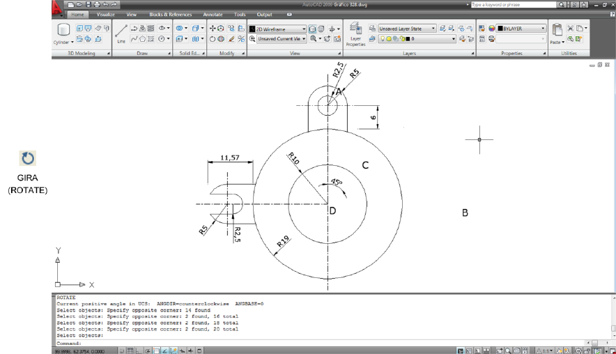 Guía 87 Práctica GIRAR Gráfico 334. Girar. En CD Gráfico 334. Girar Escribir G (R) y oprimir INTRO (ENTER) para activar el comando GIRA (ROTATE). Oprimir clic sobre la entidad marcada con la letra A. Oprimir INTRO (ENTER) para no seleccionar más entidades. Oprimir clic sobre la entidad marcada con la letra B para indicar la base. Escribir 90 y oprimir INTRO (ENTER) para indicar que gire 90 grados en contra del sentido del giro de las manecillas del reloj.
