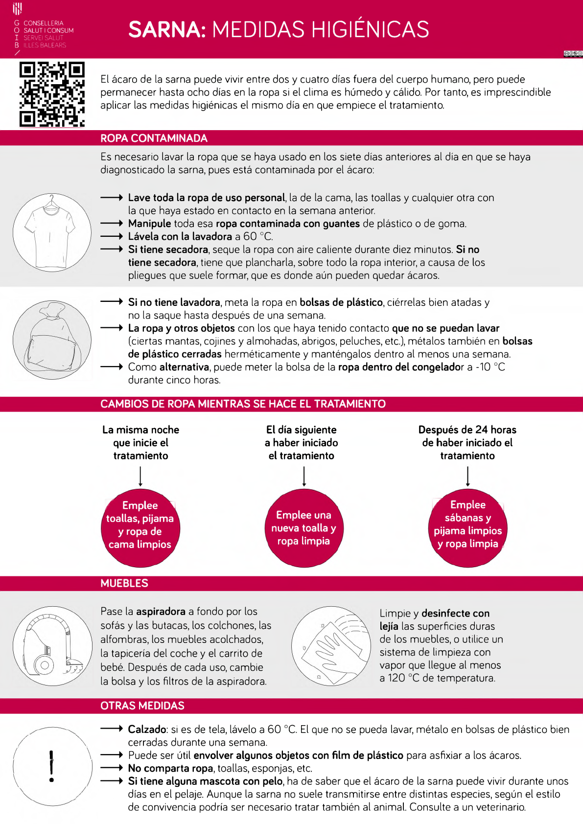 SARNA: MEDIDAS HIGIÉNICASG CONSELLERIA O SALUT ICONSUM I SERVEI SALUT B ILLES BALEARS El àcaro de la sarna puede vivir entre dos y cuatro días fuera del cuerpo humano, pero puede permanecer hasta ocho días en la ropa si el clima es húmedo y cálido. Por tanto, es imprescindible aplicar las medidas higiénicas el mismo día en que empiece el tratamiento. ROPA CONTAMINADA Es necesario lavar la ropa que se haya usado en los siete días anteriores al día en que se haya diagnosticado la sarna, pues está contaminada por el ácaro: ----- ► Lave toda la ropa de uso personal, la de la cama, las toallas y cualquier otra con la que haya estado en contacto en la semana anterior. ----- ► Manipule toda esa ropa contaminada con guantes de plástico o de goma. ----- ► Lávela con la lavadora a 60 °C. ----- ► Si tiene secadora, seque la ropa con aire caliente durante diez minutos. Si no tiene secadora, tiene que plancharla, sobre todo la ropa interior, a causa de los pliegues que suele formar, que es donde aún pueden quedar ácaros. ----- ► Si no tiene lavadora, meta la ropa en bolsas de plástico, ciérrelas bien atadas y no la saque hasta después de una semana. ----- ► La ropa y otros objetos con los que haya tenido contacto que no se puedan lavar (ciertas mantas, cojines y almohadas, abrigos, peluches, etc.), métalos también en bolsas de plástico cerradas herméticamente y manténgalos dentro al menos una semana. ----- ► Como alternativa, puede meter la bolsa de la ropa dentro del congelador a -10 °C durante cinco horas. CAMBIOS DE ROPA MIENTRAS SE HACE EL TRATAMIENTO La misma noche que inicie el tratamiento El día siguiente a haber iniciado el tratamiento Después de 24 horas de haber iniciado el tratamiento V Emplee 1 toallas, pijama y ropa de cama limpios Emplee una nueva toalla y ropa limpia V Emplee i sábanas y pijama limpios y ropa limpia . MUEBLES Pase la aspiradora a fondo por los sofás y las butacas, los colchones, las alfombras, los muebles acolchados, la tapicería del coche y el carrito de bebé. Después de cada uso, cambie la bolsa y los filtros de la aspiradora. Limpie y desinfecte con lejía las superficies duras de los muebles, o utilice un sistema de limpieza con vapor que llegue al menos a 120 °C de temperatura. OTRAS MEDIDAS ----- ► Calzado: si es de tela, lávelo a 60 °C. El que no se pueda lavar, métalo en bolsas de plástico bien X \ cerradas durante una semana. / I \ ----- ► Puede ser útil envolver algunos objetos con film de plástico para asfixiar a los ácaros. | ----- ► No comparta ropa, toallas, esponjas, etc. \ * ----- ► Si tiene alguna mascota con pelo, ha de saber que el ácaro de la sarna puede vivir durante unos 7 días en el pelaje. Aunque la sarna no suele transmitirse entre distintas especies, según el estilo de convivencia podría ser necesario tratar también al animal. Consulte a un veterinario.