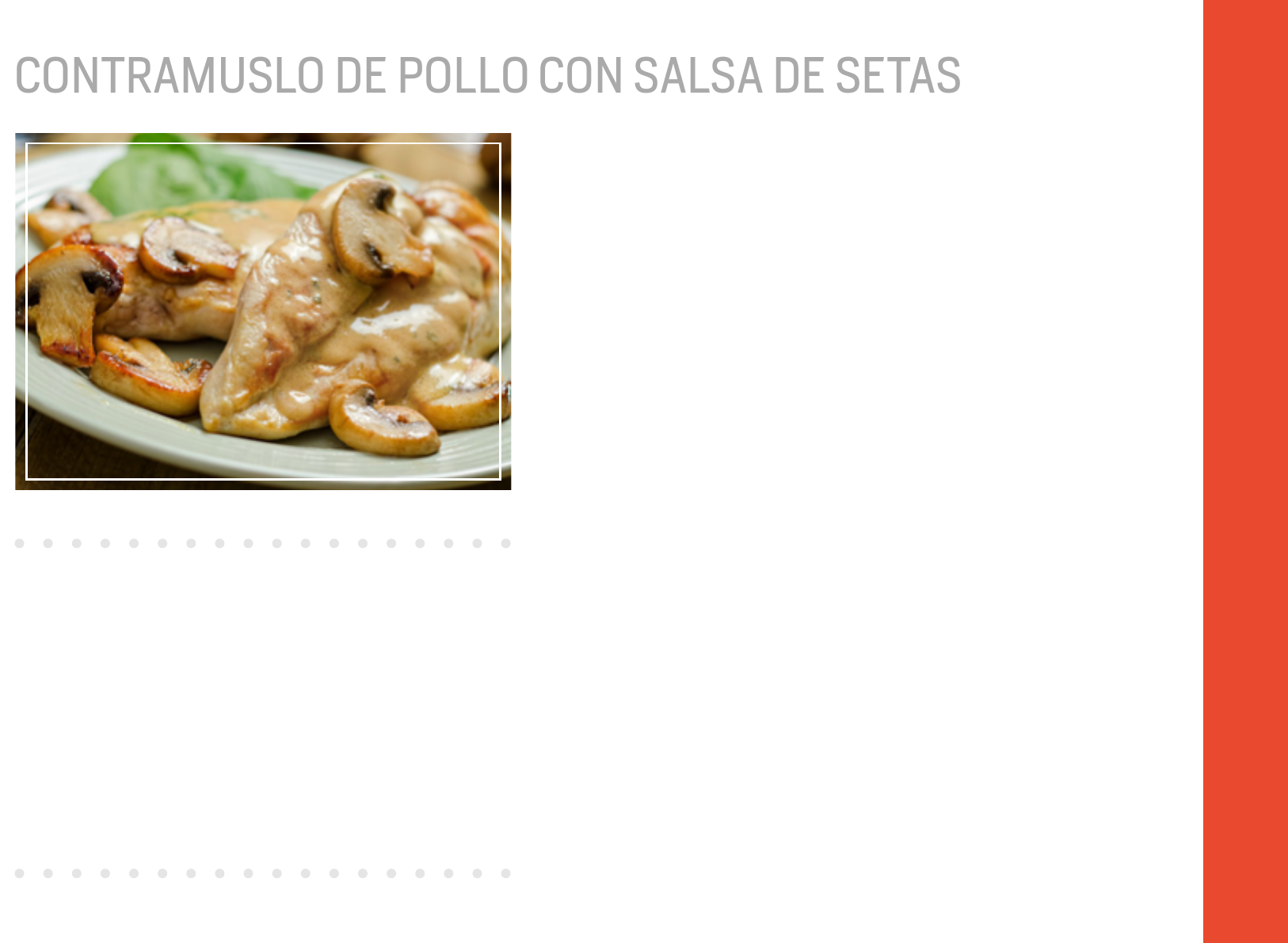 41 CE N ACONTRAMUSLO DE POLLO CON SALSA DE SETAS Carbohidratos: 4% (8g) CALORÍAS TOTALES: 764 Kcal Grasa: 78% (66g) Proteína: 17% (33g) • 1 contramuslo de pollo deshuesado • 1 c.s. de aceite de oliva • 100g de champiñones, laminados • 1 c.s. de cebolla roja, picada finamente • ½ c.s. de mantequilla • 100ml de nata para cocinar • Sal y pimienta, al gusto 1. Calentar la sartén y añadir la mantequilla junto a la cebolla picada. Cocer a fuego medio hasta que estén translúcidas (sin llegar a tostarse). 2. Subir el fuego y añadir los champiñones. Cocer hasta que estén marrones. 3. Cocer hasta que la mayoría del líquido se haya evaporado. Sin dejar de remover. 4. Añadir la nata, reducir el fuego y dejar que suelte vapor hasta obtener una salsa un poco más consitente. 5. Salpimentar al gusto. 6. Por otro lado, cocer a la parrilla o sartén los contramuslos deshuesados con un poco de sal y aceide de oliva. 7. Servir los contramuslos con la salsa por encima. INFORMACIÓN NUTRICIONAL INGREDIENTES / 1 RACIÓN PREPARACIÓN