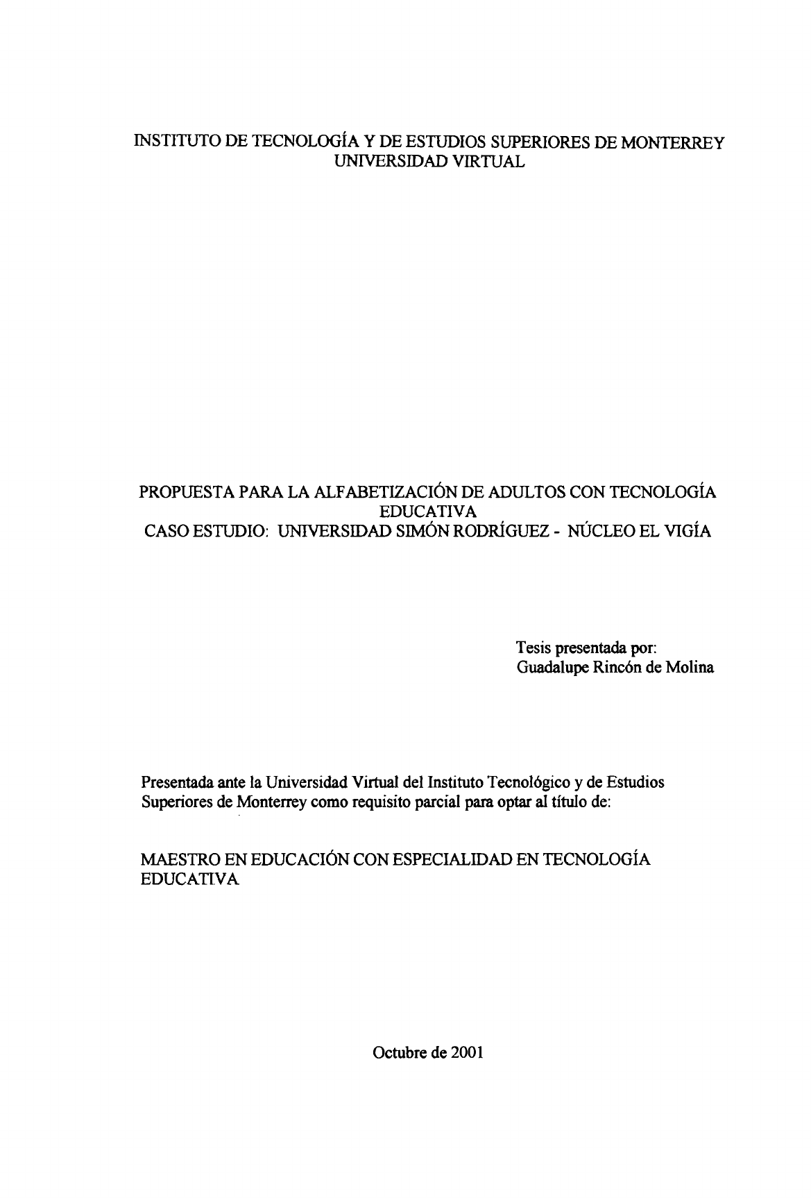 INSTITUTO DE TECNOLOGÍA Y DE ESTUDIOS SUPERIORES DE MONTERREY UNIVERSIDAD VIRTUAL PROPUESTA PARA LA ALFABETIZACIÓN DE ADULTOS CON TECNOLOGÍA EDUCATIVA CASO ESTUDIO: UNIVERSIDAD SIMÓN RODRÍGUEZ - NÚCLEO EL VIGÍA Tesis presentada por: Guadalupe Rincón de Molina Presentada ante la Universidad Virtual del Instituto Tecnológico y de Estudios Superiores de Monterrey como requisito parcíal para optar al título de: MAESTRO EN EDUCACIÓN CON ESPECIALIDAD EN TECNOLOGÍA EDUCATlVA Octubre de 2001 RESUMEN PROPUESTA PARA LA ALFABETIZACIÓN DE ADULTOS CON TENCOLOGÍA EDUCATIVA. CASO ESTIJDIO: UNIVERSIDAD SIMÓN RODRÍGUEZ - NÚCLEO EL VIGÍA Octubre 2001 Guadalupe Rincón de Molina Doctora en Andragogía Universidad lnteramericana de Educación a Distancia de Panamá Dirigida por el Dr. Laurentino Gudiño B. La presente investigación tuvo como propósito diseñar una propuesta de alfabetización de adultos con tecnología educativa, a ser desarrollada por docentes y estudiantes de la universidad Simón Rodríguez (UNESR) - Núcleo El Vigía, para lograr atender a las personas en condiciones de iletradas y neoanalfabetas, que existen en el municipio Alberto Adriani, del estado Mérida y las áreas adyacentes aledañas de influencia. El estudio se enmarcó en la modalidad de proyecto factible, apoyado en una investigación descriptiva, de campo. Los sujetos investigados fueron 7 docentes y 66 estudiantes. La propuesta se desarrolló en tres fases: I fase diagnóstico, 11 fase factibilidad y lII fase diseft.o de la propuesta. La información se obtuvo a través de la aplicación de un cuestionario, con escala de ítems cerrados ( si, no), de 30 preguntas. La validez del instrumento se realizó por medio de juicios de expertos, y los resultados fueron sometidos a la prueba de las dos mitades (ítems pares e impares), obteniendo 0,77 (versión no corregida) y 0,87 en la versión corregida de Speannan- lV Brown. Los datos recolectados fueron procesados y analizados mediante la técnica de frecuencia, estadística porcentualizada, descriptivamente. De los resultados obtenidos, se dedujo, que no se desarrolla una actividad alfabetizadora eficiente a causa de falta de programas idóneos. con la cobertura necesaria, calidad y pertinencia de Jos métodos y recursos didácticos~ Jo que determinó la necesidad de 1a rea1ización de una propuesta. V AGRADECIMIENTOS RESUMEN INDICE DE CONTENIDO INDICE TABLAS Y CUADROS INDICE DE GRAFICOS INTRODUCCIÓN INDICE DE CONTENIDO CAPITULO l. EL TEMA DE LA INVESTIGACIÓN .................................................. . Pregunta inicial ...................................................................................................... . Contextualización de la temática .......................................................................... . Justificación ........................................................................................................... . Ubicación del estudio ............................................................................................ . Estudios análogos ................................................................................................. . CAPITULO 11. EL PROBLEMA DE INVESTIGACIÓN Pp lll IV Vl Vlll IX X 13 13 14 14 16 18 24 Enunciado el problema........................................................................................... 24 Referencia empírica............................................................................................... 25 Problema a investigar........................................................................................ 27 Búsqueda de literatura referente al tema............................................................ 29 Objetivo general y específicos.............................................................................. 30 Hipótesis................................................................................................................. 31 Las variables: Identificación, relación y operacionalización............................... 32 VI Propuesta de un marco de referencia ................................................................... . CAPITIJLO 111. MARCO TEORICO RELACIONADO AL TEMA ........................... . Alfabetización: visión histórica ............................................................................ . Universidad y Alfabetización ............................................................................... .. Diagnóstico institucional: UNESR - Núcleo El Vigía ......................................... .. La tecnología educativa y sus implicaciones ....................................................... . Bases legales ....................................................................................................... . Clarificación de términos ................................................................................... . CAPITIJLO N. METODOLOGÍA. .............................................................................. . T . d . . 'ó 1pos e 1nvest1gac1 n ........................................................................................... . Descripción de la metodología .............................................................................. . Población y Muestra .............................................................................................. . Procedimiento para la obtención de datos ............................................................. . Validez y Confiabilidad del instrumento ............................................................... . Flujo grama de pasos cumplidos en la investigación .............................................. . CAPITULO V. DIAGNOSTICO QUE SUSTENTA LA PROPUESTA. .................... .. Presentación de cuadros y gráficos ....................................................................... .. Análisis .........................................................................................................