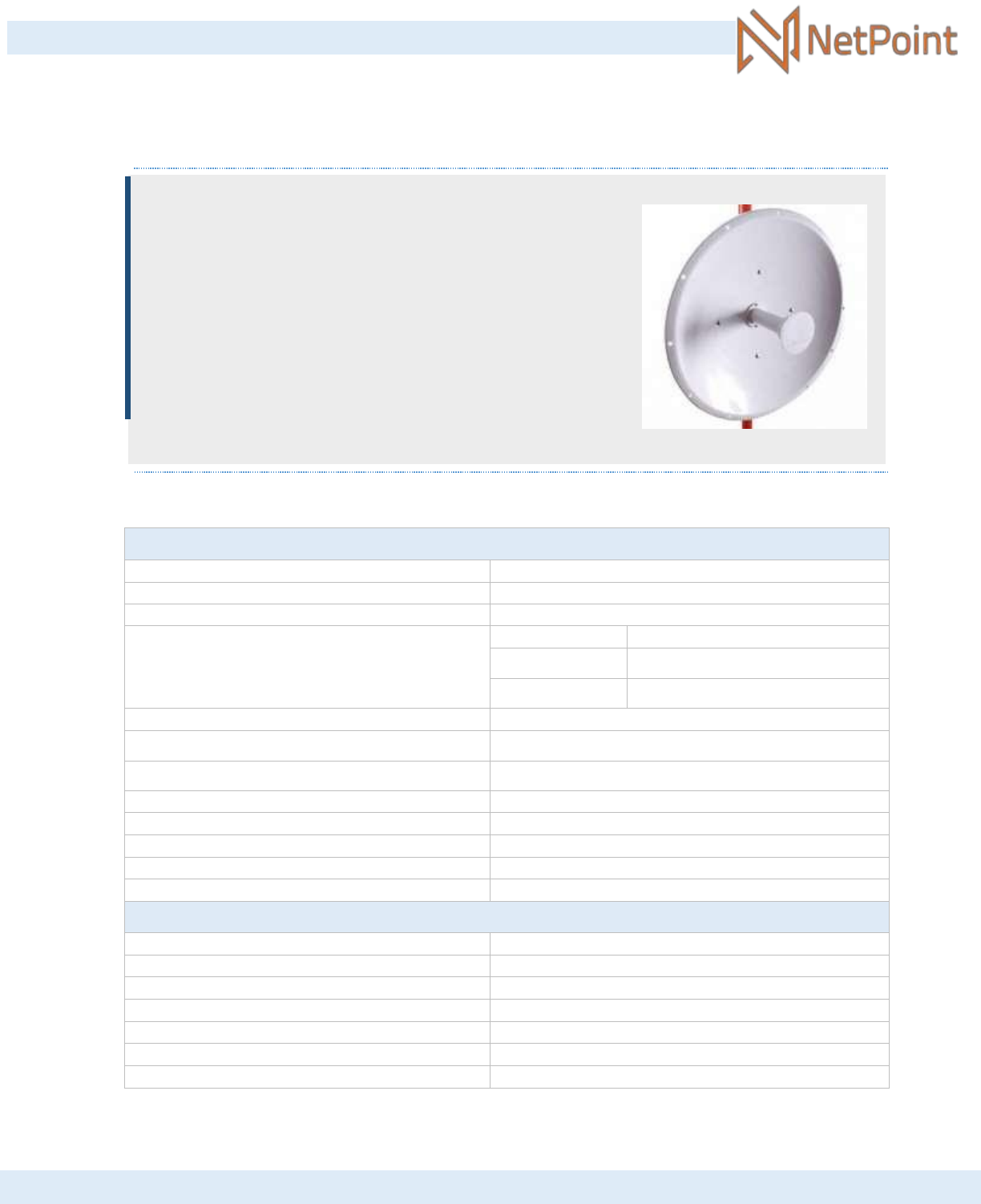 APLICACIONES: ✓ Enlaces Punto – Punto. DETALLES: ✓ Reflector parabólico de alta precisión. ✓ Fabricación en aluminio extruido. ✓ V/H Polarización Dual. ✓ Incluye Montaje. ✓ Incluye soporte para Radio Universal. ✓ Incluye jumper LMR400 con 2 conectores N macho ✓ Capacidad para fijar polarización a 45 ° ✓ Compatible con radomo modelo AJ-RD60. NP-1CN: ANTENA PARABÓLICA DIRECCIONAL 4.9-6.2 GHZ 30 DB Antena parabólica de 60cm de diámetro para enlace punto a punto. CARACTERÍSTICAS PRINCIPALES: ESPECIFICACIONES ELÉCTRICAS Rango de Frecuencia - GHz 4.9 - 6.2 GHz Tipo de Antena Parabólica Tipo de Conector N - Hembra Ganancia (dBi) Baja 28 Media 29.3 Alta 30 VSWR 1.0 - 1.03 HPOL ancho de haz 6.38° VPOL ancho de haz 6.38° Perdida de retorno (dB) 14 ISO (dB) 25 F/B Radio (dB) 36 XPD (dB) 30 Polarización Dual ESPECIFICACIONES MECÁNICAS Velocidad de resistencia al viento (k/h) 120 Ajuste en Azimut (°) 360 Ajuste de Elevación (°) ±15 Diámetro del mástil sugerido (mm) 50 - 70, 100 - 114 Temperatura de Operación (℃) De -45 a + 60 Peso Bruto (kg) 6.5 Peso Neto (kg) 5.5 |||| ANTENAS DE JALISCO PARA COMUNICACIONES S.A. DE C.V. Certificado de Calibración CALIBRATION CERTIFICATE Responsable de la calibración: / Calibrated by Aprobó: / Approved by Luis Eduardo Carrión Rivera Mariano Botello Pérez Firma electrónica N0756-551-21-426603 N0613-162-21-426612 Notes [Notes]: - Es responsabilidad del usuario establecer la fecha de una nueva calibración del instrumento. El tiempo de validez de los resultados contenidos en este certificado depende tanto de las características del instrumento calibrado como de las prácticas para su manejo y uso. [The user is responsible for establishing re-calibration periods, based on the characteristics of the instrument and the conditions of handling and use.] - No es recomendable la reproducción parcial de este certificado, ya que puede dar lugar a interpretaciones equivocadas de sus resultados. [Partial reproduction may lead to misleading interpretations.] - Este certificado se emite de manera electrónica. La versión oficial puede ser consultada en el domicilio electrónico http://www.cenam.mx/transparencia/certificados.aspx con la contraseña entregada a la empresa identificada como “Cliente”. Aún sin contar con esta contraseña, los datos del equipo calibrado pueden obtenerse en el mismo portal con el número de certificado. [This is an electronic certificate. The official version may be obtained at the website http://www.cenam.mx/transparencia/certificados.aspx, using the password provided to the customer identified at the top of this page. Identification information for the instrument calibrated may be obtained at the same site without the need of a password.] NetPoint NP-1 Sin Serie NA Sitio de calibración de Antenas del CENAM (CALTS-CENAM) No. de servicio: / Service number 173840 Fecha de calibración: / Calibration date 2017-11-28 Antena parabólica de alta ganancia Instrumento: Instrument Marca: Brand name Modelo: Model No. de serie Serial number No. de identificación: ID number Lugar donde se efectuó la calibración: Place where the calibration was carried out No. de certificado: / Certificate number CNM-CC-440-182/2017 Fecha de emisión: / Date of issue 2017-12-01 Alan Agraz Huitrón Cuauhtémoc 17, Buenavista, Tlajomulco de Zúñiga, Jalisco C.P. 45640 Cliente: Customer http://www.cenam.mx/transparencia/certificados.aspx http://www.cenam.mx/transparencia/certificados.aspx |||| ANTENAS DE JALISCO PARA COMUNICACIONES S.A. DE C.V. GRÁFICAS DE LOS DIAGRAMAS DE RADIACIÓN FRECUENCIA 4.9 GHz Figura 1. Diagrama de radiación. Frecuencia 4.9 GHz. Plano E. Figura 2. Diagrama de radiación. Frecuencia 4.9 GHz. Plano H. FRECUENCIA 5.5 GHz Figura 3. Diagrama de radiación. Frecuencia 5.5 GHz. Plano E. Figura 4. Diagrama de radiación. Frecuencia 5.5 GHz. Plano H. |||| ANTENAS DE JALISCO PARA COMUNICACIONES S.A. DE C.V. FABRICADO POR: ANTENAS DE JALISCO PARA COMUNICACIONES S.A. DE C.V. Netpoint tiene el respaldo de Antenas de Jalisco que está cerca de cumplir 45 años siendo fabricante y distribuidor de equipo de telecomunicaciones en México y Centroamérica. CONTACTANOS: Cuauhtémoc #17, Col. Buenavista, C.P. 45640 Tlajomulco de Zúñiga, Jalisco, México Tel. +52 (33) 3796 0808 Fax. +52 (33) 3796 0909 Email: info@antenas.com.mx www.antenas.com.mx www.netpointmexico.com Antenas de Jalisco Figura 6. Diagrama de radiación. Frecuencia 6.2 GHz. Plano H. Figura 5. Diagrama de radiación. Frecuencia 6.2 GHz. Plano E. FRECUENCIA 6.2 GHz mailto:info@antenas.com.mx http://www.antenas.com.mx/ http://www.netpointmexico.com/