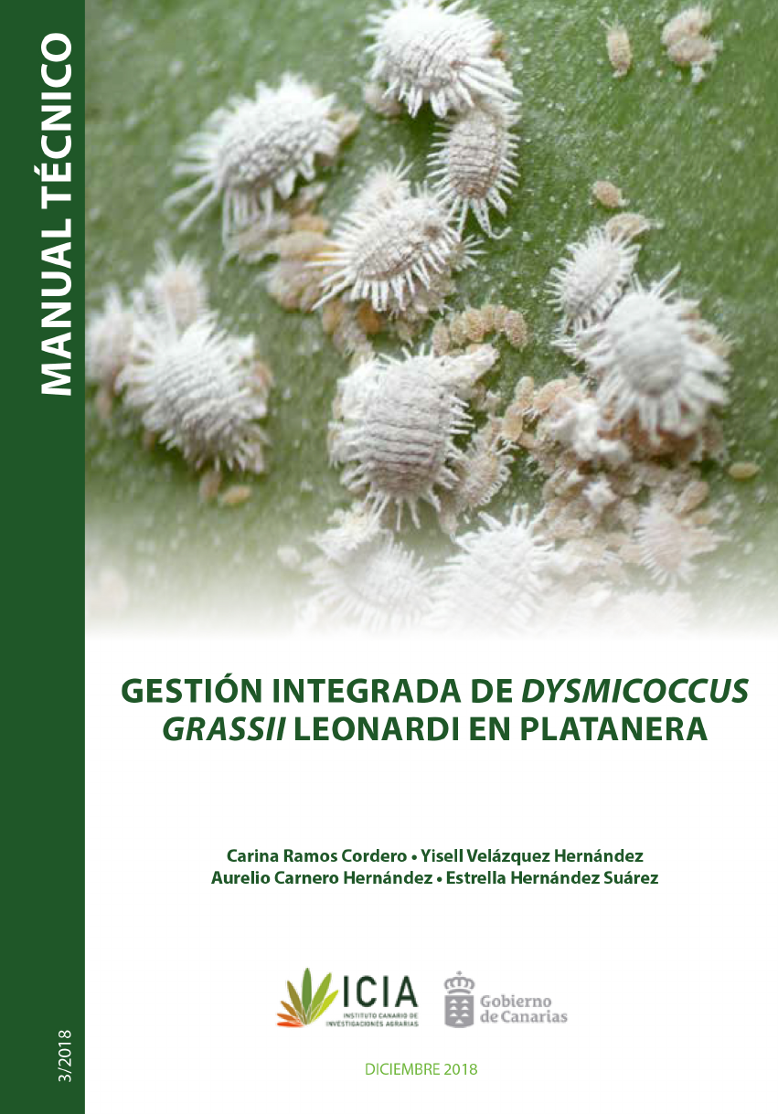 GESTIÓN INTEGRADA DE DYSMICOCCUS GRASSII LEONARDI EN PLATANERA 2 Se autoriza la reproducción, sin fines comerciales, de este trabajo, citándolo como: Ramos Cordero, C., Velázquez Hernández, Y., Carnero Hernández, A. y Hernández Suárez, E. 2018. Gestión Integrada de Dysmicoccus grassii Leonardi en platanera. Manual Técnico N° X. Instituto Canario de Investigaciones Agrarias. XX p. El trabajo incluido en esta obra ha sido financiado por el Proyecto MAC/1/C054 Biomusa, titulado “Transferencia de I+D+i para el desarrollo sostenible del cultivo del plátano en las RUPsMac”; por los Préstamos EBT20100052 con la empresa INCA Islas Canarias S.A., titulado “Diseño y puesta en marcha de una biofábrica para producción in situ de enemigos naturales para el control biológico de Dysmicoccus grassii” y por la subvención para la rea- lización de Proyectos I+D+i de la ACIISI con la empresa INCA Islas Canarias S.A., titulado “Desarrollo y puesta en marcha de un programa de control biológico para Dysmicoccus grassii”. Colección Manual Técnico N° 3 Autores: Carina Ramos Cordero, Yisell Velázquez Hernández, Aurelio Carnero Hernández y Estrella Hernández Suárez. Departamento de Protección Vegetal del Instituto Canario de Investigaciones Agrarias. Edita: Instituto Canario de Investigaciones Agrarias, ICIA Maquetación y diseño: Fermín Correa Rodríguez (ICIA) Impresión: Imprenta Bonnet S.L. Depósito Legal:TF.262-2018 ISSN:2603-882X 3 Prólogo La ausencia en nuestro país de estudios exhaustivos, continuados y específicos, sobre el grupo entomológico de las llamadas “cochinillas” es un hecho que requeriría una reflexión más allá de una simple explicación, especialmente cuando se trata de un grupo de una importancia clara y evidente como plaga de muchos cultivos, plantas ornamentales y de jardín, o zonas boscosas; con efectos tan dañinos que la hacen con frecuencia ser la plaga de más difícil combate desde cualquier punto de vista. Es por lo que esta publicación que aquí reseñamos y comentamos tiene un gran valor técnico siguiendo las pautas del primer estudio casi pionero, por lo detallado de las aportaciones, de Mc Dougall que se publicó en 1926 y más tarde con el completo trabajo realizado por la Dra. Gemma Pérez Guerra en 1984, que ha servido de modelo como se destaca en el primer capítulo de este manual. Por lo tanto, debemos alegrarnos de que de nuevo se aborde un estudio tan completo sobre esta cochinilla y que sirve para afianzar aún más la línea emprendida por la unidad de Entomologia Aplicada que con tanta diligencia y dedicación dirige la Dra. Estrella Hernández Suárez en aquellos aspectos tan abandonados, como he reiterado, sobre el conocimiento del grupo de las cochinillas. Entrando de lleno y concretando los detalles de esta publicación señalar el contenido bien organizado, y criterios claros y precisos alrededor del control biológico y los enemigos naturales nativos encontrados en Canarias, una línea firme y continuada que la Unidad de Entomología mantiene como filosofía básica y que le da una impronta única y singular dentro del panorama de la investigación agrícola en Canarias. También es verdad que no se deja de lado la capacidad de control por otros medios y enemigos naturales conocidos fuera de nuestras fronteras para reunir todos los detalles y explicaciones en una salida evidente sobre la realidad de que el control integrado es la vía mas realista sobre la lucha contra Dysmicoccus grassii en platanera y Canarias. 4 Para terminar solo debemos al menos indicar, sin entrar en profundidades, lo que se van encontrar los futuros lectores de como se ha ordenado el texto y que confirme lo expuesto anteriormente. No se pretende un exceso de alabanza ni un intento de exaltar los valores evidentes que tiene la publicación, que en un buen sentido no es totalmente completo sino que deja abierto todas las puertas para futuras investigaciones en forma de artículos, trabajos de fin de carrera, diplomas masters y tesis doctorales. De la introducción destacar el párrafo final donde se hace énfasis en que se agrupa toda la información procedente de diversas fuentes que son poco accesibles para la mayoría del sector platanero. Sólo por este hecho vale la pena prestar la debida atención al texto. La estructura dentro del mismo se hace con un criterio muy sensato desde unas indicaciones generales sobre la especie hasta finalizar con todos los experimentos realizados para el control biológico de la cochinilla algodonosa tanto en laboratorio como en campo. Dr. Aurelio Carnero Hernández 5 Introducción . . . . . . . . . . . . . . . . . . . . . . . . . . .7 1. Gestión Integrada de Plagas (GIP) . . . . . . . . . . . . . .9 2. Dysmicoccus grassii (Leonardi, 1913) . . . . . . . . . . 13 2.1 Encuadre taxonómico y sinonimias de la especie . 13 2.2 Descripción y reconocimiento de la especie . . . 13 2.3 Origen y distribución geográfica . . . . . . . . . 21 2.4 Biología y ecología . . . . . . . . . . . . . . . . . 22 2.5 Monitoreo y localización de Dysmicoccus grassii en platanera . . . . . . . . . . . . . . . . . . . 24 2.6 Incidencia y daños en la platanera . . . . . . . . 26 2.7 Plantas hospedantes . . . . . . . . . . . . . . . . 28 2.8 Modo de dispersión . . . . . . . . . . . . . . . . 30 2.9 Asociación hormiga-cochinilla . . . . . . . . . . 31 2.10 Cría de Dysmicoccus grassii . . . . . . . . . . . 32 3. Gestión Integrada de Dysmicoccus grassii . . . . . . . . 37 3.1 Identificación . . . . . . . . . . . . . . . . . . . . 39 3.1.1 ¿Cómo identificar a Dysmicoccus grassii? . . . 39 3.1.2 Identificación de sus enemigos naturales . . . . 41 3.2 Monitoreo . . . . . . . . . . . . . . . . . . . . . . 59 3.2.1 ¿Dónde podemos encontrar a Dysmicoccus grassii? . . . . . . . . . . . . . . . . . . . . . . . . 59 3.2.2 ¿Cúando realizar el monitoreo? . . . . . . . . 59 ÍNDICE 6 3.3 Toma de decisiones . . . . . . . . . 