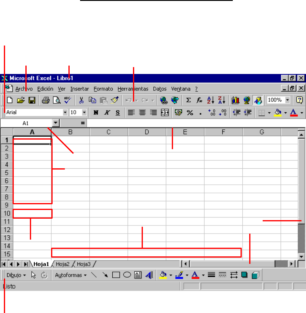 MICROSOFT EXCEL 97 La Ventana Principal ( Barra de Dibujo Celda Columna Barras de desplazamiento Barra de Formato Barra Estándar Barra de Menús Barra de Título Cuadro de nombres Barra de Fórmulas Fila ) Barra de Título Es una barra que muestra el nombre del programa, en este caso, Microsoft Excel, seguido del nombre del documento abierto. Barra de Menús Esta barra contiene los siguientes menús desplegables: Archivo, Edición, Ver, Insertar, Formato, Herramientas, Datos, Ventana y Ayuda. En ellos se encuentran todos los comandos que Microsoft Excel permite utilizar. Barra Estándar Esta barra contiene los comandos básicos como Nuevo, Abrir, Guardar, Imprimir, etc. Barra de Formato Esta barra contiene los comandos de formato: tipo y tamaño de letra, alineación del texto, estilo de moneda, etc. Cuadro de nombres Es un espacio que contiene el nombre de la celda seleccionada. Si escribimos un nombre de celda (Ej.: D5) y presionamos Enter se seleccionará esa celda. Barra de Fórmulas En esta barra se escriben las fórmulas que queremos aplicar a las celdas. Por Ej.: =SUMA(A1:A4) en este caso se sumarán los números contenidos entre las celdas A1 y A4. Barra de Dibujo Esta barra tiene los comandos de dibujo y algunos de formato como: Autoformas, Fondo, Subrayado, etc. MENÚ ARCHIVO Se halla ubicado en la Barra de Menús. Se puede llegar con el mouse o presionando las teclas ALT+A. Nuevo: Crea un documento nuevo. Se abre una ventana con diferentes opciones, entre ellas, hojas de cálculo predeterminadas. Abrir: Abre un documento existente. Cuando elegimos esta opción se abre una ventana en la que seleccionamos diferentes propiedades del documento como su nombre y el tipo de archivo. Cerrar: Cierra el documento actualmente abierto (y seleccionado), NO LA APLICACIÓN. Guardar: Guarda los cambios realizados en un documento ya existente. Si no está guardado aparece la ventana Guardar Como. Guardar como: Guarda un documento cuando todavía no ha sido guardado o cuando se quiere guardar con un nuevo nombre y/o tipo de archivo. Guardar área de trabajo: Guarda un grupo de libros. Los libros deben estar guardados independientemente. Configurar página: Establece los márgenes, la fuente y tamaño del papel, la orientación de la página y otras opciones de diseño del archivo activo. Área de impresión: Crea un área de impresión, o sea, el área que se imprimirá (Recordemos que la hoja de cálculo tiene una cantidad enorme de celdas) También se puede eliminar un área de impresión creada previamente. Vista preliminar: muestra una vista reducida del área a imprimir. Imprimir: Abre una ventana con las opciones para imprimir el documento. Propiedades: Muestra las propiedades (atributos) del archivo actualmente abierto. Salir: Cierra la aplicación completa (Microsoft Excel) MENÚ EDICIÓN Se encuentra en Barra de Menús, se llega con el mouse o presionando las teclas Alt+E. Deshacer: Deshace el último comando realizado o elimina los últimos datos ingresados. Si no se produjeron cambios o no se introdujeron datos el comando cambia a Imposible Deshacer. Repetir: Repite una acción que habíamos eliminado con el comando Deshacer. Si no se realizó ninguna acción el comando cambia a Imposible Repetir. Cortar: Copia las celdas seleccionadas y las coloca en el portapapeles. Una vez pegadas en otra ubicación, la selección se borra de su ubicación original. Copiar: Copia las celdas seleccionadas y las coloca en el portapapeles. La diferencia con Cortar es que al pegar los datos en otra ubicación, la ubicación original se mantiene. Pegar: Coloca los datos contenidos en el portapapeles en la/s celda/s seleccionada/s. NOTA: No sólo se pueden Cortar, Copiar y Pegar caracteres, sino también imágenes, gráficos, cuadros, etc. Pegado especial: Permite pegar, vincular o incrustar el contenido del portapapeles con diferentes formatos. Pegar como hipervínculo: Inserta el contenido del portapapeles y lo vincula al archivo especificado. Rellenar: Copia el contenido de la celda seleccionada a las celdas de arriba, abajo, izquierda, etc. Borrar: Permite borrar Todo el contenido del documento, su Formato, sus Comentarios, o el contenido de las celdas seleccionadas. Eliminar: Elimina celdas o columnas según los parámetros establecidos por el usuario. Eliminar hoja: Elimina la/s hoja/s actualmente seleccionada/s y todo su contenido. Mover o copiar hoja: Mueve o copia la/s hoja/s seleccionada/s a otro libro de Excel o las copia en el mismo libro. Buscar: Busca los caracteres escritos en el espacio en blanco de la ventana Buscar según los parámetros establecidos. Reemplazar: Busca los caracteres deseados y los reemplaza por otros que correspondan. Ir a: Selecciona la celda, rango o celdas con las características que se especifiquen. Vínculos: Muestra los vínculos establecidos en el documento y permite modificarlos. Objeto: Permite modificar un objeto en la aplicación en la que fue creada. MENÚ VER Se halla en la Barra de Menús. Se activa con el mouse o presionando las teclas ALT+V. Normal: Pasa a vista normal, que es la vista predeterminada del documento para la mayoría de las tareas de Microsoft Excel, como entrar datos, filtrar, trazar gráficos y dar formato. Vista previa de salto de página: Pasa la hoja de cálculo a vista previa de salto de página, que es una vista de modificación que muestra la hoja de cálculo tal y como se va a imprimir. En esta vista, pueden moverse los saltos de página arrastrándolos con el mouse. Barra de herramientas: Aquí debemos seleccionar las barras de herramientas que queremos ver permanentemente en la pantalla de Excel. Barra de fórmulas y de Estado: Muestra la barra de herramientas correspondiente. Encabezado y pie de página: Agrega o cambia el texto que aparece en la parte superior e inferior de las páginas. Comentarios: Activa o desactiva la presentación de comentarios en la hoja de cálculo. Vistas personalizadas: Crea diferentes vistas de u