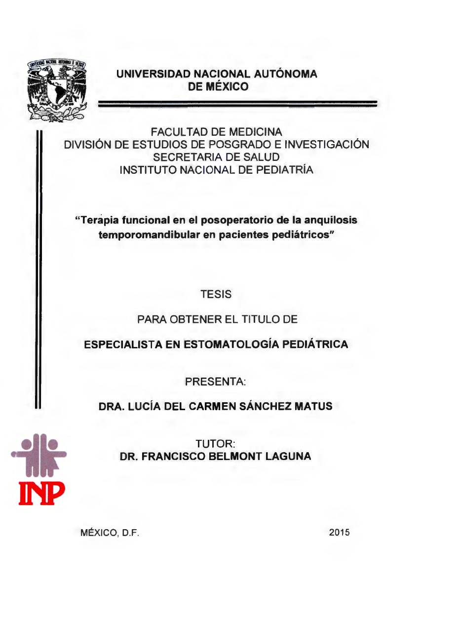 UNIVERSIDAD NACIONAL AUTÓNOMA DE MÉXICO FACULTAD DE MEDICINA DIVISIÓN DE ESTUDIOS DE POSGRADO E INVESTIGACIÓN SECRETARIA DE SALUD ilr INP INSTITUTO NACIONAL DE PEDIATRÍA "Terapia funcional en el posoperatorio de la anquilosis temporomandibular en pacientes pediátricos" TESIS PARA OBTENER EL TITULO DE ESPECIALISTA EN ESTOMATOLOGÍA PEDIÁ TRI CA PRESENTA: DRA. LUCÍA DEL CARMEN SÁNCHEZ MATUS TUTOR: DR. FRANCISCO BELMONT LAGUNA MÉXICO, D.F. 2015 "TERAPIA FUNCIONAL EN EL POSOPERATORIO DE LA ANQUILOSIS TEMPOROMANDIBULAR EN PACIENTES PEDIÁTRICOS" JEFE DEL DEPARTAMENTO DE PRE Y POSGRADO DR. EDUARDwru=H1"'. PROFESOR TITULAR DEL C DE ESTOMATOLOGIA PEDIÁTRICA DR. FRANCISlMONT LAGUNA TUTOR DE TESIS AGRADECIMIENTOS A mis padres, mi esposo y mis hijas. A mi asesor Dr. Francisco Belmont Laguna A mi asesor Dr. Jorge Téllez Rodríguez A mi asesora Dra. Hilda Ceballos Hernández A los Ores. Eduardo de la Teja Angeles y Gerardo Elías Madrigal por sus observaciones en la realización de este trabajo. ÍNDICE Pág . 1. Introducción ............. ....... ..... ...... .......... .. .. ....... ... ...... ... .... ... .. .. ....... .. ...... . 5 2. Anquilosis temporomandibular ..... ... ... ..... ...... ... ... .. .... ... ....... .. ....... .... .. ... 6 3. Terapia funcional . .. ..... ... .......... .. .... .... .... ............ 9 4. Pistas planas .... ....... .. ........... .... ... ..... .......... .... ... .. . .. 14 5. Discusión . ....... .... ........ .... ..... .. ...... .... .......... .. ........ ........ ............ ... ..... 16 6. Conclusión 17 7. Referencias bibliográficas .... .. . ....... .... .. .. .... .......... .......... ........... ... 18 1. INTRODUCCIÓN La anquilosis temporomandibular es una alteración en la infancia que causa graves trastornos funcionales, orgánicos y de armonía facial. Debe ser tratada por especialistas en una labor multi e interdisciplinaria. Una parte fundamental del tratamiento es la terapia funciona l con aparatos ortopédicos que debe iniciarse 24 horas después evitar la recidiva. La terapia consiste en real izar movimientos de apertura, cierre y lateralidad; en una etapa subsiguiente se corrigen algunas secuelas. El objetivo de este articulo es establecer en el Instituto Nacional de Pediatría las bases para la rehabilitación de los pacientes posoperados de anquilosis temporomandibular, con aparatos ortopédicos adecuados a las características de cada paciente. 5 2. ANQUILOSIS TEMPOROMANDIBULAR Anquilosis es la fusión total o parcial de los componentes de una articulación. En la anquilosis temporomandibular se fusionan el cóndilo mandibular, la fosa glenoidea y la eminencia articular del hueso temporal , lo que impide la apertura bucal y limita los movimientos mandibulares normales. Esto interfiere con el crecimiento y con el desarrol lo de la mandíbula, provocando graves trastornos funcionales, orgánicos y alterando la armonía facial. De ahí la importancia de un diagnóstico y tratamiento quirúrgico oportunos.1 La anquilosis temporomandibular puede deberse a un traumatismo craneoencefálico, facial , principalmente mandibular sobre todo en el mentón. Los pacientes jóvenes sufren con mayor frecuencia fractura del cuello del cóndilo generalmente en tallo verde. Si no se diagnostican o si se tratan de manera incorrecta se produce anquilosis, principalmente en niños menores de diez años de edad.2 La causa más frecuente son los accidentes automovilísticos, los deportes o la violencia a La anquilosis temporomandibular también puede ocurrir como secuela de infecciones del oído medio, infecciones de la mastoides que se extienden a la articulación por contigüidad, afectan las superficies articulares y causan la fusión con el hueso temporal; por osteomielitis del cuerpo de la mandíbula, debida a una infección dental; por enfermedades sistémicas que afecten las articulaciones como la artritis reumatoide juvenil. La de tipo congénito es muy difícil de determinar, es causada ocasionalmente por mal uso de fórceps al momento del parto 4 Es importante conocer la etiología para prevenir las secuelas de la anquilosis. Se requiere además un control clínico y radiológico ya que el seguimiento de estos pacientes no sólo es durante el período de consolidación de la fractura, sino durante todo el periodo de crecimiento del niño, hasta que hay una oclusión armónica y movimientos mandibulares de protrusión y lateralidad adecuados (cuadros 2 y 3).s 6 El objetivo del tratamiento de las fracturas de la articulación temporomandibular (ATM), es por un lado, consolidar el sitio de la fractu ra y por otro, devolver la apertura bucal del paciente con sus movimientos de lateralidad; así se logra la funcionalidad de la articulación y se evita una anquilosis ósea o fibrosa, las alteraciones en el plano de la oclusión y algún otro desorden de la ATM. Todo esto, con un tratamiento oportuno y apropiado reduce el impacto que tendría en el crecimiento facial y en la oclusión, para evitar una alteración en la estética facial. 3· 5 - 7 El diagnóstico se basa en la experiencia cl ínica para reconocer los signos y síntomas y en el uso de métodos auxiliares de diagnóstico: radiografías simples como la towne baja, la tomografia computada con reconstrucción tridimensional , la resonancia magnética y la estereolitografía para apoyar el diagnóstico y planear el tratamiento (cuadro 1). Es esencial un programa terapéutico para la correcta regeneración del cóndilo. Si se restaura la oclusión y la función se normaliza, la superficie articular puede regenerarse y remodelarse (cuadros 2 y 3)3 ·5- 7 Una fractura no atendida conduce a la anquilosis ósea o fibrosa.1 · 7 Dependiendo del tiempo que dure la anquilosis puede originar los siguientes signos y síntomas. En el caso de ser unilateral se presenta desviación al lado afectado, desviación de la línea media, inclinación del plano oclusal y acortamiento de la rama anquilosad