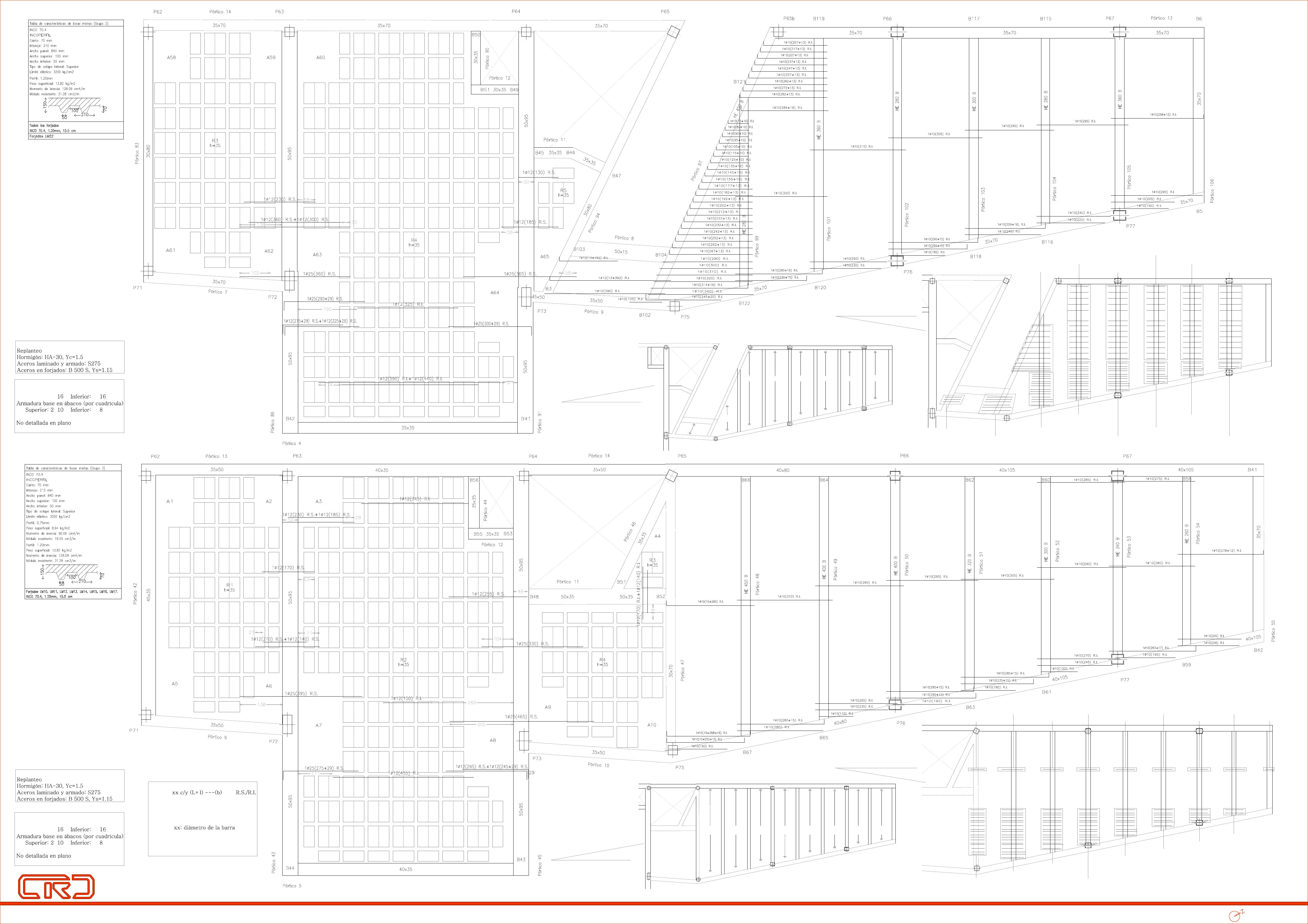 ESCALA 1:50 14estructuraCENTRO DE RECURSOS DIGITALES, LA LAGUNA (SANTA CRUZ DE TENERIFE) DOMINGO TRUJILLO VELÁZQUEZ E.T.S.A. SEVILLA TRIBUNAL E82 SEPTIEMBRE 2011 planta +1 cota +4.5 planta 0 cota 0.0 r.s. en forjado de chapa colaborante escala 1:100 planta 0 cota 0.0 (29)---1∅6c/30 (110)---(81) (109)---2∅6c/30 (195)---(86) (65)---1∅6c/30 (140)---(75) 2∅6c/30 (a+15)---(b) 115<b<245 130<a<260 (61)---1∅6c/30 (125)---(64) (75)---2∅6c/30 (140)---(65) (63)---1∅6c/30 (125)---(62) (63)---2∅6c/30 (125)---(62) (62)---2∅6c/30 (120)---(58) (62)---1∅6c/30 (120)---(58) (59)---2∅6c/30 (120)---(61) (59)---1∅6c/30 (120)---(61) (61)---1∅6c/30 (130)---(69) (61)---2∅6c/30 (140)---(79) sentido de forja en tramos chapa colaborante planta 0 cota 0.0 Nervios de chapa colaborante perpendiculares al sentido de forja LM22 LM17 LM10 LM11 LM12 LM13 LM14 LM15 r.s. en forjado de chapa colaborante escala 1:100 planta 0 cota +4.5 (35)---1∅6c/30 (90)---(55) sentido de forja en tramos chapa colaborante planta +1 cota +4.5 Nervios de chapa colaborante perpendiculares al sentido de forja LM10 LM11 LM12 LM13 LM14 LM15 LM16 LM17 (76)---1∅6c/30 (155)---(79) (65)---1∅6c/30 (135)---(70) (59)---1∅6c/30 (135)---(76) (62)---1∅6c/30 (140)---(78) (61)---1∅6c/30 (130)---(69) (60)---1∅6c/30 (130)---(70) (57)---1∅6c/30 (120)---(63) (35)---17∅6c/30 (90)---(55) (76)---17∅6c/30 (140)---(64) (63)---17∅6c/30 (120)---(57) (58)---17∅6c/30 (120)---(62) (62)---17∅6c/30 (125)---(63) (62)---17∅6c/30 (120)---(58) (59)---17∅6c/30 (115)---(58) (57)---17∅6c/30 (130)---(73) (50)---17∅6c/30 (65+15) Nota a la nomenclatura de refuerzos: (a)---n∅ n: número de barras ∅ L: longitud de la barra (cm) l: longitud de patilla (cm) R.S.: refuerzo superior R:I.: refuerzo inferior (a)---: distancia desde el eje de viga al extremo de la barra en ese lado (cm) Nivel +4.5 Reticular canto h=35cm (para todo R) Armadura base en nervios de reticular Superior: 2∅ 2∅ ∅ 2∅ Nivel 0.0 Reticular canto h=35cm (para todo R) Armadura base en nervios de reticular Superior: 2∅ 2∅ ∅ 2∅