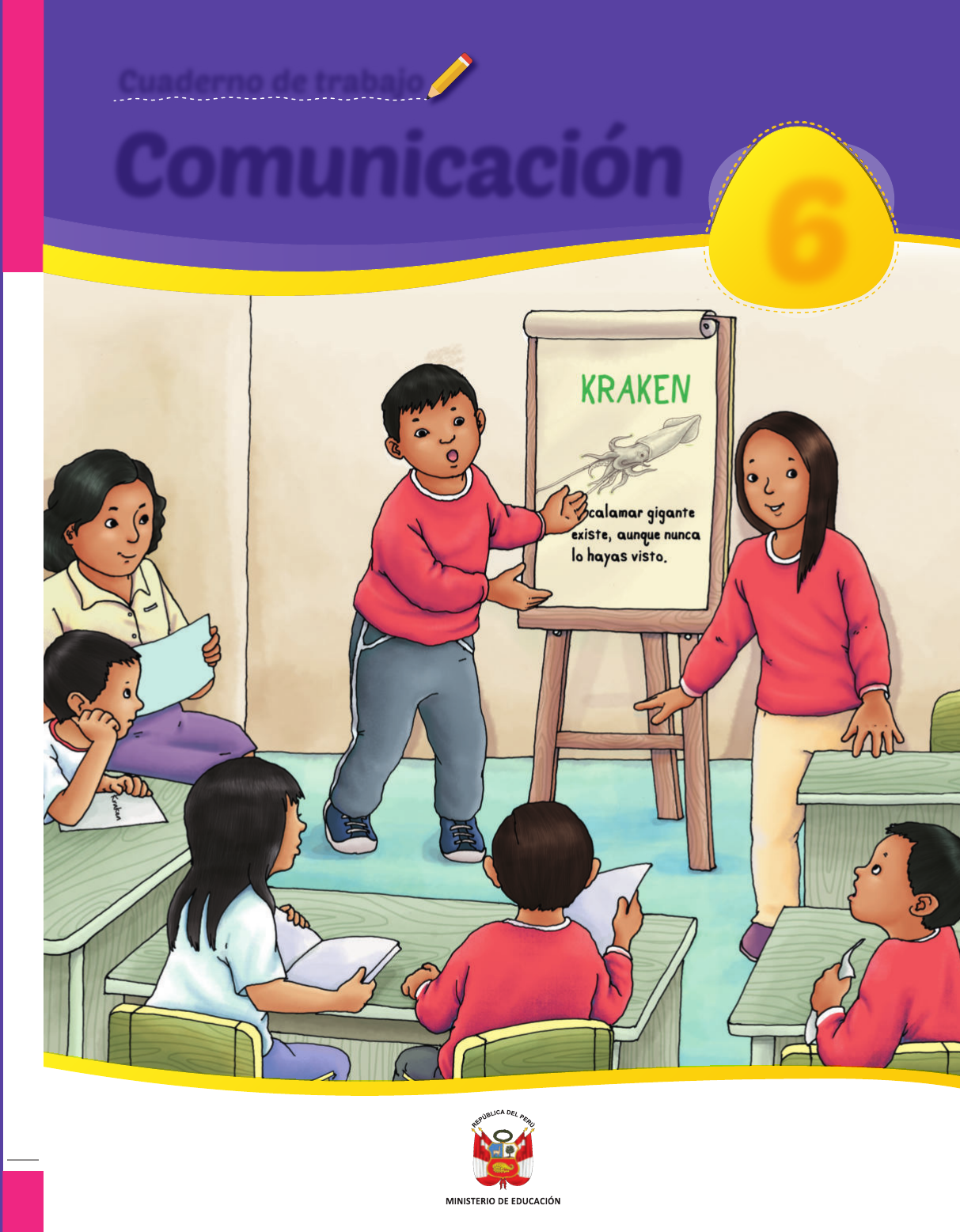 Comunicación Cuaderno de trabajoCuaderno de trabajo 66P R IM A R IA C O M U N IC A C IÓ N - C u a d e rn o d e t ra b a jo C O M U N IC A C IÓ N - C u a d e rn o d e t ra b a jo 66 creo La ciudadana y el ciudadano que queremos Perfil de egreso Propicia la vida en democracia comprendiendo los procesos históricos y sociales. Se reconoce como persona valiosa y se identifica con su cultura en diferentes contextos. Desarrolla procesos autónomos de aprendizaje. Gestiona proyectos de manera ética. Comprende y aprecia la dimensión espiritual y religiosa. Interpreta la realidad y toma decisiones con conocimientos matemáticos. Se comunica en su lengua materna, en castellano como segunda lengua y en inglés como lengua extranjera. Practica una vida activa y saludable. Indaga y comprende el mundo natural y artificial utilizando conocimientos científicos en diálogo con saberes locales. Aprecia manifestaciones artístico-culturales y crea proyectos de arte. Aprovecha responsablemente las tecnologías. 6 Comunicación Cuaderno de trabajo Mi nombre: Cuaderno de trabajo Comunicación 6 Sexto grado Editado por: ©Ministerio de Educación Calle Del Comercio 193, San Borja Lima 41, Perú Teléfono: 615-5800 www.minedu.gob.pe Participantes de la reedición y revisión pedagógica: Carmen Rosa León Ezcurra Beatriz Delia Narváez Mueras Ana María Orihuela Orrillo Diseño y diagramación: Henry David Llantoy Sandoval Jeanette López Pedemonte Corrección de estilo: Ricardo Ráez Casabona Ilustración: Patricia Ilia Nishimata Oishi Diseño e ilustración de carátula: Alfredo Jeli Torres Linares Primera edición: setiembre de 2017 Segunda edición: noviembre de 2018 Tercera edición: junio de 2019 Cuarta edición: noviembre de 2020 Quinta edición: junio de 2021 C. P. N.° 007-2021-MINEDU/VMGP/UE 120 Dotación: 2022 Tiraje: 471 020 ejemplares Impreso por: Quad Graphics Perú S.R.L. Se terminó de imprimir en octubre de 2021, en los talleres gráficos de Quad Graphics Perú S.R.L., sito en Av. Los Frutales N.° 344, Ate-Vitarte RUC N.° 20371828851 Todos los derechos reservados. Prohibida la reproducción de este cuaderno de trabajo por cualquier medio, total o parcialmente, sin permiso expreso del Ministerio de Educación. Hecho el Depósito Legal en la Biblioteca Nacional del Perú N.° 2021-08048 Impreso en el Perú / Printed in Peru Queridas niñas y queridos niños: Este Cuaderno de trabajo ha sido elaborado especialmente para ustedes: las niñas y los niños de las escuelas públicas del Perú. Con él podrán mejorar su lectura, escritura y forma de expresar lo que piensan o desean, y todo esto de manera divertida. Úsenlo y, sobre todo, ¡disfrútenlo! ¡Ah!... recurran a sus maestras o maestros cuando necesiten ayuda. ¡Hola! Ya me conocen, ¿verdad? Soy Mateo y este año me he propuesto aprender a expresarme mejor. ¡Hola, amigas y amigos! ¿Me recuerdan, verdad? Soy Esteban, por fin estoy en sexto grado y muy deseoso de empezar a usar mi Cuaderno de trabajo. ¡Qué tal! Soy Lili. Lo que yo quiero reforzar este año es mi lectura. ¿Nos recuerdan? Somos Ana, Lucía y José, y queremos desearles mucha suerte y éxitos en este año que empieza. ¿Qué contiene tu Cuaderno de trabajo? Unidad Títulos Página Estamos creciendo y nos planteamos un proyecto de vida Leemos para comprender los cambios en la pubertad 5 Entrevistas para conocer metas y proyectos de vida de adolescentes como tú y yo 11 Escribimos nuestro proyecto de vida en una infografía 19 Conocemos y difundimos nuestros derechos Leemos para conocer nuestros derechos 27 Escribimos una historieta para difundir nuestros derechos 35 Exponemos nuestros derechos en una campaña 41 Conocemos y promovemos el conocimiento de nuestro país Leemos la crónica de un viaje para conocer nuestro país 49 Escribimos una crónica para dar a conocer un lugar del Perú 56 Narramos y describimos lugares, tradiciones o costumbres 63 Reconocemos los aportes de la ciencia y la tecnología en nuestras vidas Leemos y mejoramos la vida con ciencia y tecnología 71 Escribimos para mostrar los resultados de nuestra investigación 77 Exponemos los resultados de nuestra investigación 85 Promovemos el cuidado del planeta Leemos y descubrimos la necesidad de cuidar el planeta 93 Debatimos para encontrar soluciones 99 Escribimos un texto para explicar un tema de interés 105 Advertimos… ¡Animales en peligro de extinción! Leemos y reflexionamos sobre la biodiversidad en peligro 113 Escribimos textos argumentativos para generar reflexión 119 Una representación teatral para difundir un mensaje 127 Opinamos y generamos reflexión sobre el uso de los recursos naturales Leemos para saber cómo se explotan nuestros recursos naturales 135 Escribimos para expresar nuestra opinión 141 Un conversatorio para compartir ideas y sentimientos 147 Para seguir leyendo 155 11 U NIDAD 5 Estamos creciendo y nos planteamos un proyecto de vida Estamos creciendo y nos planteamos un proyecto de vida Siento mi cuerpo y mis sentimientos diferentes, no son como antes. Quiero saber más sobre los cambios que se están produciendo en mí. Leemos para comprender los cambios en la pubertad 1 Realiza una lectura rápida del texto de la página 6 y contesta las siguientes preguntas: b. ¿Por qué en el texto habrá expresiones resaltadas en negrita? Explica. c. ¿Las imágenes y el título del texto se relacionan? Explica cómo. 2 ¿Con qué finalidad leeré el texto “Los cambios en la adolescencia”? Escribe. Comprenderemos los cambios que experimentamos cuando crecemos; para ello, leeremos un texto, ubicaremos las ideas principales, escribiremos notas al margen e identificaremos el uso de algunos recursos (uso de negritas, uso de los adjetivos, uso de las comillas) que otorgan sentido al texto. 11 U NIDAD a. La vida de una persona pasa por diferentes etapas. ¿En qué etapa te encuentras tú: en la niñez o en la adolescencia? Niñez Adolescencia 6 La mayoría de los expertos creen q