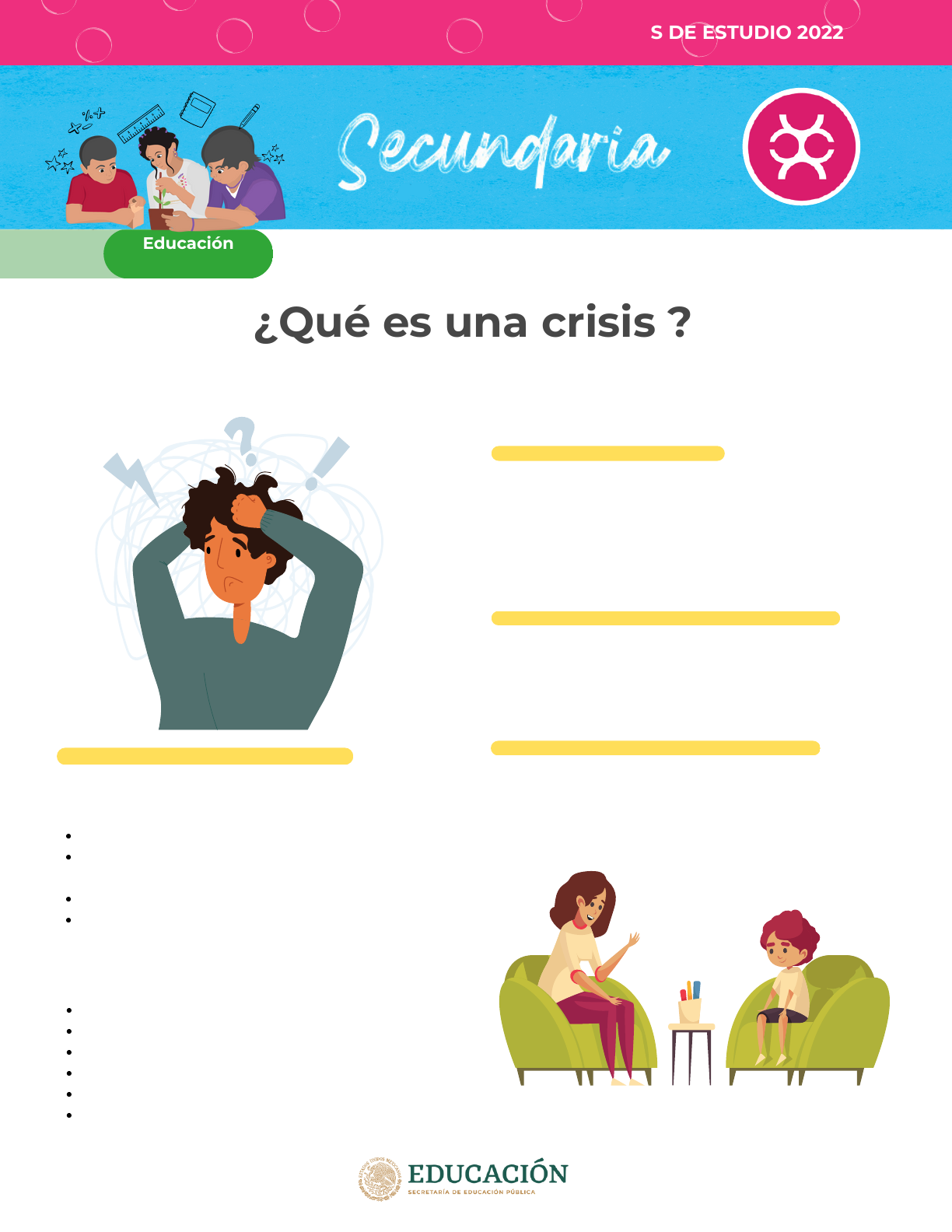 <p>¿QUÉ INFLUYE EN UNA CRISIS?</p><p>Existen diferentes factores que pueden</p><p>desencadenar una crisis. El ambiente, la habilidad</p><p>para regular las emociones, las creencias internas y</p><p>las expectativas de las demás personas, son algunos</p><p>factores que las propician.</p><p>¿POR QUÉ SON IMPORTANTES LAS EMOCIONES?</p><p>Las emociones fungen un papel importante en los</p><p>momentos de crisis, ya que en ocasiones, el no</p><p>saber cómo regularlas favorece que se produzcan.</p><p>¿CUÁNDO CONTACTAR A UN ESPECIALISTA?</p><p>Es importante canalizar al estudiante con un</p><p>especialista si tiene crisis continuas y se le dificulta</p><p>la toma de decisiones asertivas.</p><p>¿QUÉ PUEDO HACER COMO DOCENTE?</p><p>Prevención:</p><p>Favorecer la confianza y la seguridad</p><p>Ayudar a reconocer sus fortalezas y áreas</p><p>de oportunidad</p><p>Propiciar el conocimiento de sí</p><p>Fomentar el conocimiento de las</p><p>emociones y su autorregulación</p><p>En el momento:</p><p>Escuchar atentamente</p><p>Mostrar empatía</p><p>Fomentar la expresión</p><p>Dar tiempo para reflexionar</p><p>Evitar juicios</p><p>Salvaguardar la integridad de todas las personas</p><p>involucradas</p><p>Un estado temporal en el cual una persona pierde la capacidad de controlar</p><p>una situación utilizando las estrategias y herramientas que normalmente usaría</p><p>para resolver.</p><p>1/1</p><p>¿Qué es una crisis ?¿Qué es una crisis ?</p><p>Educación</p><p>Socioemocional</p><p>Apoyo a la apropiación del Plan y Programas de Estudio 2022 Apoyo a la apropiacion del Plan y Programas de Estudio 2022 APOYO A LA APROPIACIÓN DEL PLAN Y PROGRAMAS DE ESTUDIO 2022</p>