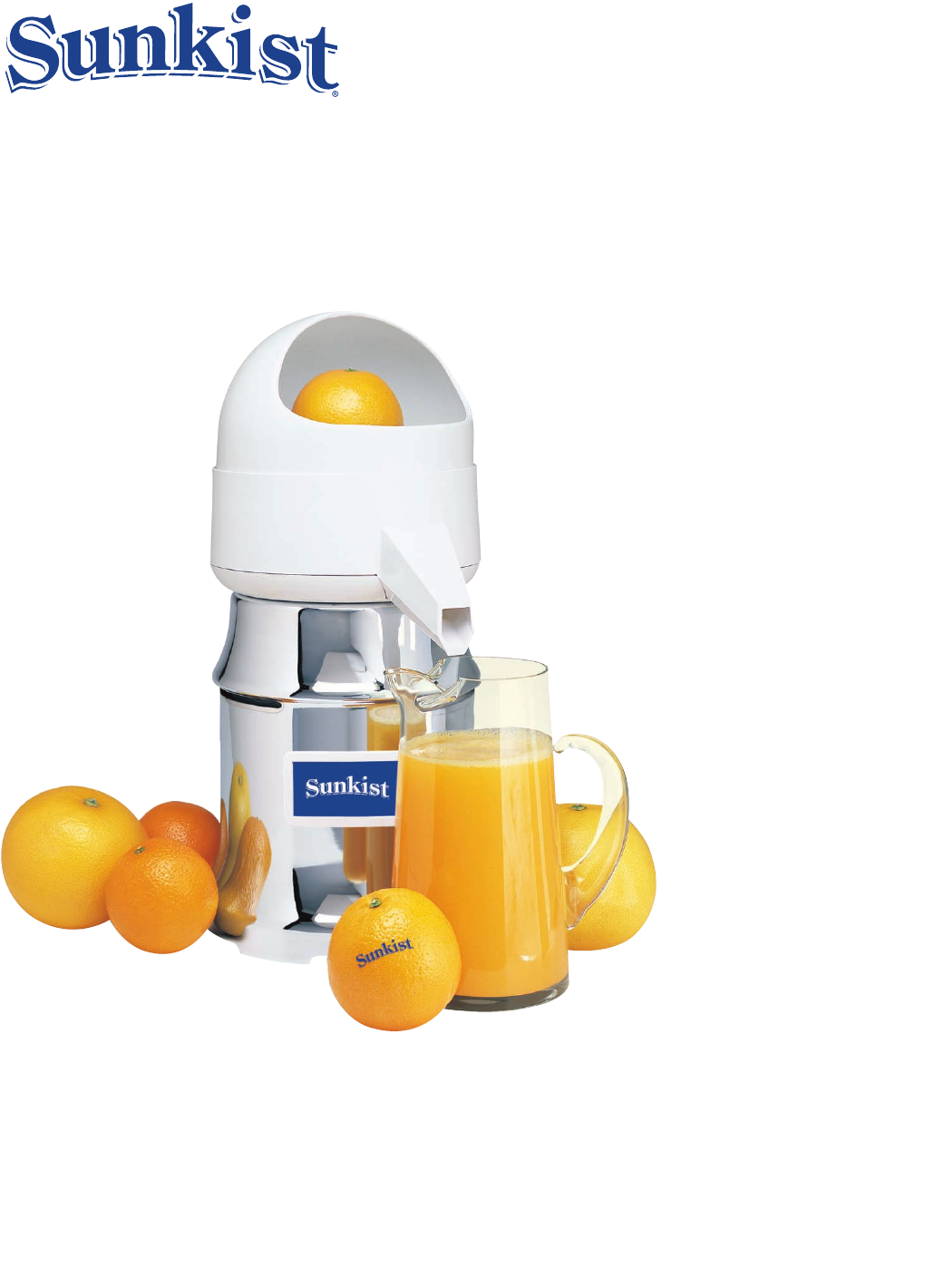 <p>Exprimidor</p><p>comercial</p><p>Disponible con su distribuidor de equipos para el servicio de alimentos</p><p>Contáctenos para saber cuál es el más cercano a usted:</p><p>800.383.7141 • fax 909.822.2125</p><p>Foodservice Equipment Sales, Sunkist Growers</p><p>10509 Business Dr., Unit B, Fontana, CA 92337</p><p>foodservice.sunkist.com/equipment</p><p>• Motor silencioso, aunque resistente</p><p>• Filtro oscilante único</p><p>• Capaz de extraer de 10 a 12 galones en</p><p>una hora</p><p>• Aprobado por UL, NSF Int’l, CUL, CE</p><p>(Europa)</p><p>• Bulbos extractores intercambiables</p><p>• Dos años de garantía</p><p>• Años de desempeño probado</p><p>Sunkist es una marca registrada comercial de ©2012 Sunkist Growers, Inc., Sherman Oaks, CA 91423, Estados Unidos. Todos los Derechos Reservados..</p><p>1. Conjunto de tazón plastico incl. domo (10A), canal</p><p>(10B) y soporte de tazón (10)</p><p>2. Juego de c extractores con inserto</p><p>de metal</p><p>(utilizar solamente con 17 o 17C)</p><p>A. Lima/limón sirve en el modelo No. 8</p><p>B. Naranja sirve en los modelos No. 7 y No. 8</p><p>C. Toronja sirve en los modelos No. 7 y No. 8</p><p>2R. Juego de bulbos extractores sin inserto</p><p>de metal</p><p>(utilizar solamente con el 17R)</p><p>AR. Limón/Lima</p><p>BR. Naranja</p><p>CR. Toronja</p><p>3. Palanca de fijación y tornillos para el filtro (para</p><p>el exprimidor No. 7 - no se ilustra)</p><p>4. Filtro con palanca de fijación y tornillos para el</p><p>filtro (para el exprimidor No. 7 - no se ilustra)</p><p>4A. Filtro para el exprimidor No. 8</p><p>4C. Extractor de filtro para el exprimidor No. 8</p><p>6. Tornillos, separadores, arandelas del soporte del</p><p>tazón (juego de 3)</p><p>7. Anillo de sombrilla con ornillo y junta de ajuste</p><p>(no se ilustra)</p><p>7B. Sello de sombrilla (sólo para usar el alojamientos</p><p>excéntricos ranurados, sustituye al 7, 8 y 9)</p><p>8. Tornillo de fijación del anillo de sombrilla</p><p>(incluido con el 7) (no se ilustra)</p><p>9. Junta del anillo de sombrilla (incluido con el 7)</p><p>(no se ilustra)</p><p>10. Solamente soporte plástico del tazón</p><p>(incluido con el No. 1)</p><p>10A. Solamente domo plástico (incluido con el No. 1)</p><p>10B. Solamente canal plástica (incluido con el No. 1)</p><p>11. Junta del soporte del tazón</p><p>12. Alojamiento cromado del motor</p><p>13. Buje del cable eléctrico (usar con 50B)</p><p>14. Cable eléctrico 115/60</p><p>14A. Cable de goma - Exportación</p><p>15. Interruptor conmutador con protector</p><p>(no ilustrado)</p><p>15D. Interruptor basculante con sello</p><p>15E. Conectores para 14A y 15D (juego 4)</p><p>(no ilustrado)</p><p>16. Patas de goma (juego de 3)</p><p>17. Punta de eje con pasador (no ilustrado)</p><p>(usar solamente con 2A, 2B y/o 2C)</p><p>17C. Punta de eje con pasador (pasador graduado)</p><p>(no ilustrado)</p><p>(utilizar solamente con 2A, 2B y/o 2C)</p><p>17R. Punta de eje con pasador (pasador plano)</p><p>(utilizar solamente con 2AR, 2BR y/o 2CR)</p><p>18. Junta de alojamiento excéntrico</p><p>(incluido con el No. 20)</p><p>18A. Junta de punta de eje (sirve al 17C y 17R)</p><p>19. Tubo de latón</p><p>20-7. Alojamiento excéntrico con rodamientos, junta y</p><p>tubo de latón, exprimidor No. 7</p><p>20-8. Alojamiento excéntrico con rodamientos, junta y</p><p>tubo de latón, exprimidor No. 8</p><p>20-8C. Mecanismo excéntrico del exprimidor No. 8</p><p>22. Cubo excéntrico con rodamiento y tornillo</p><p>24. Tornillo hexagonal del cubo excéntrico 1⁄4-20x1⁄2</p><p>25. Tornillo de resorte para montaje del motor</p><p>10-32</p><p>26. Arandelas de presión incl. 36 (2) y 37 (3)</p><p>27. Resorte helicoidal del buje de bronce para</p><p>montaje del motor 9⁄64 x 3⁄8 x 1⁄4</p><p>28. Resorte helicoidal</p><p>29. Resorte helicoidal del buje de bronce para el</p><p>alojamiento excéntrico 9⁄64 x 3⁄8 x 3⁄16</p><p>30. Tornillo del brazo - Pequeño1⁄4-32 x 11⁄16</p><p>31. Tornillo del brazo - Grande1⁄4-20 x 29⁄32</p><p>33. Tornillo de resorte para alojamiento</p><p>excéntrico1⁄4-32</p><p>34. Brazo excéntrico</p><p>35. Buje de bronce del brazo excéntrico</p><p>1⁄2 x 3⁄16 x 5⁄16</p><p>36. Arandela de presión, 3⁄16, dientes internos</p><p>37. Arandela de presión, 1⁄4, dientes internos</p><p>40. Fundición superior del motor</p><p>41A. Interruptor estacionario del motor - Bluffton Motor</p><p>41B. Interruptor centrífugo del motor 115V - Bluffton</p><p>Motor</p><p>41B1. Interruptor centrífugo del motor 230V - Bluffton</p><p>Motor</p><p>43. Rodamiento superior o inferior del motor - Bluffton</p><p>44-1. Rotor con eje Bluffton Motor 115/60</p><p>44B1. Rotor con eje Bluffton Motor 230/50</p><p>44D. Rotor con eje Bluffton Motor 230/60</p><p>45. Rodamiento superior o inferior del motor - Indiana</p><p>46. Tornillos del motor (juego de 4)</p><p>47. Estator (devanado) - Bluffton Motor 115/60</p><p>47B. Estator (devanado) - Bluffton Motor 230/50</p><p>48. Arandelas de tensión - Bluffton Motor</p><p>(juego de 2)</p><p>50. Aliviador de tensiones del cable eléctrico</p><p>para J-2</p><p>50B. Aliviador de tensiones del cable eléctrico para</p><p>J-1, J-4 y J-5</p><p>52. Placa base perforada</p><p>53. Tornillo de tierra con arandela de presión para</p><p>J-1, J-4 y J-5 (juego de 2)</p><p>54. Tornillos para la placa base para J-1, J-4 y</p><p>J-5 (juego de 3)</p><p>57. Placa de logotipo, etiqueta y sostenedores</p><p>61. Protector térmico contra sobrecargas 115/60 -</p><p>Bluffton Motor</p><p>62. Protector térmico contra sobrecargas 230/50 -</p><p>Bluffton Motor</p><p>64. Motor modelo No. 7 o No. 8 - 115/60</p><p>4,3 amp - 1725 rpm</p><p>65. Motor modelo No. 7 o No. 8 - 230/50</p><p>2,5 amp - 1425 rpm</p><p>67. Motor modelo No. 7 o No. 8 - 230/60</p><p>2,2 amp - 1725 rpm</p><p>Exprimidor comercial No. 8</p><p>Información de piezas</p><p>Fecha de entrada en vigor, 15 de julio</p><p>de 2005</p><p>Especificaciones</p><p>A