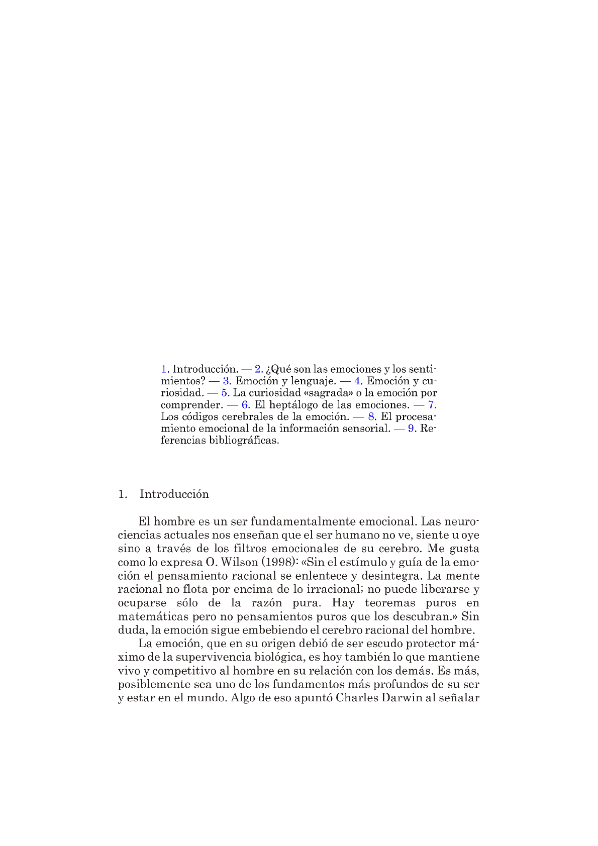 <p>1. Introducción. — 2. ¿Qué son las emociones y los senti</p><p>mientos? — 3. Emoción y lenguaje. — 4. Emoción y cu</p><p>riosidad. — 5. La curiosidad «sagrada» o la emoción por</p><p>comprender. — 6. El heptálogo de las emociones. — 7.</p><p>Los códigos cerebrales de la emoción. — 8. El procesa</p><p>miento emocional de la información sensorial. — 9. Re</p><p>ferencias bibliográficas.</p><p>1. Introducción</p><p>El hombre es un ser fundamentalmente emocional. Las neuro-</p><p>ciencias actuales nos enseñan que el ser humano no ve, siente u oye</p><p>sino a través de los filtros emocionales de su cerebro. Me gusta</p><p>como lo expresa O. Wilson (1998): «Sin el estímulo y guía de la emo</p><p>ción el pensamiento racional se enlentece y desintegra. La mente</p><p>racional no flota por encima de lo irracional; no puede liberarse y</p><p>ocuparse sólo de la razón pura. Hay teoremas puros en</p><p>matemáticas pero no pensamientos puros que los descubran.» Sin</p><p>duda, la emoción sigue embebiendo el cerebro racional del hombre.</p><p>La emoción, que en su origen debió de ser escudo protector má</p><p>ximo de la supervivencia biológica, es hoy también lo que mantiene</p><p>vivo y competitivo al hombre en su relación con los demás. Es más,</p><p>posiblemente sea uno de los fundamentos más profundos de su ser</p><p>y estar en el mundo. Algo de eso apuntó Charles Darwin al señalar</p><p>que «el lenguaje de las emociones es por sí mismo y sin lugar a du</p><p>das importante para el bienestar del género humano». Precisamen</p><p>te, la fuente de los estímulos que provocan las respuestas emocio</p><p>nales del hombre actual están más en el propio hombre que en los</p><p>estímulos primarios que mantuvieron su supervivencia biológica.</p><p>Señalaba Charles S. Sherrington: «Human doings, human feelings,</p><p>human hopes and fears move man as does nothing which is not hu</p><p>man.» Es así que el hombre, aun protegido por el manto social de</p><p>los demás, sigue siendo un ser fundamentalmente sintiente. «Wit-</p><p>hout emotion it could not dream of the tasks it does dream of» (She-</p><p>rrington, 1975).</p><p>2. ¿Qué son las emociones y los sentimientos?</p><p>Si nos atenemos a la estricta etimología de la palabra, emoción</p><p>quiere decir, en esencia, movimiento. Es decir, expresión motora</p><p>hecha a través de la conducta, sea ésta lenguaje verbal o simple</p><p>mente corporal. William James, ya en 1884, al preguntarse qué era</p><p>una emoción contestó que era una respuesta del organismo ante</p><p>determinados estímulos del medio ambiente.</p><p>Con todo, sin embargo, nada mejor para entender qué es una</p><p>emoción que la descripción de lo que ocurre y se siente cuando se</p><p>experimenta: imagínese a usted mismo sentado plácidamente en el</p><p>banco de un parque tomando el sol. Su percepción de lo que le rodea</p><p>o de sus propias imágenes mentales vaga dispersa, sin un foco de</p><p>atención preciso. De pronto, tras usted, oye un gruñido amenaza</p><p>dor. Un perro enorme, enseñando agresivamente los dientes, pare</p><p>ce presto a abalanzarse sobre usted. Ante esta fuente de peligro, su</p><p>cerebro, su mente y su cuerpo sufren un cambio brusco, inmediato.</p><p>Usted se apresta o bien a correr, o bien a luchar y defenderse. Su</p><p>foco de atención se centra ahora en el perro. Su corazón golpea fuer</p><p>temente el pecho. Usted respira más deprisa y más profundamen</p><p>te. Su cuerpo (lo que incluye su cerebro) experimenta miles de cam</p><p>bios — sensoriales, motores, endocrinos, metabólicos— , conducen</p><p>tes a facilitar la huida (correr) o el ataque (contra el enemigo). Está</p><p>usted ante una fuerte reacción emocional.</p><p>Lo descrito, sin embargo, no es más que un tipo de reacción</p><p>emocional. Hay otros. Por ejemplo, la reacción emocional ante de</p><p>terminados estímulos placenteros, sean éstos un buen alimento si</p><p>se está hambriento o la hembra para el macho, si éste está depriva</p><p>do de sexo. De aquí que Le Doux señalara que la emoción (en singu</p><p>lar) como tal no existe, «la emoción (el concepto) es sólo una manera</p><p>conveniente de hablar de ciertos aspectos del cerebro (del cuerpo) y</p><p>de la mente». Pero en cualquier caso, parece claro que por emocio</p><p>nes, en su más primitiva y profunda acepción, queremos señalar los</p><p>mecanismos que pone en marcha cualquier ser vivo para mantener</p><p>su supervivencia.</p><p>Estas reacciones ante el peligro o ante lo placentero ocurren en</p><p>cualquier especie animal y son inconscientes, incluso en el hombre.</p><p>Es decir, ocurren antes de que nos apercibamos de ellas (en el caso</p><p>de la visión del perro agresivo, nuestro cuerpo reacciona mucho an</p><p>tes de que nosotros tengamos una visión consciente de la situa</p><p>ción). El hombre, además, experimenta una sensación consciente.</p><p>(En el caso del ejemplo anterior, el sujeto «siente» miedo.) El hom</p><p>bre, pues, experimenta un sentimiento (consciente), sea éste de mie</p><p>do o placer o sus muchas variables (véase mas adelante).</p><p>Le Doux (1996, 1999) lo ha expresado de la manera más clara:</p><p>«Cuando estos sistemas (emocionales) funcionan en un animal que</p><p>también tiene la capacidad de ser consciente, entonces aparecen</p><p>las emociones conscientes o sentimientos. Esto claramente ocurre</p><p>en los seres humanos, pero nadie sabe con seguridad si otros ani</p><p>males tienen esta capacidad. No cuestiono qué animales son cons</p><p>cientes y cuáles no. Simplemente sostengo que, cuando estos meca</p><p>nismos ancestrales (como el que desencadena la conducta defensi</p><p>va ante el peligro) funcionan en un cerebro consciente, se desenca</p><p>denan sentimientos emocionales (como tener miedo). Cuando esto</p><p>no es así, el cerebro cumple con su función sin tener conocimi