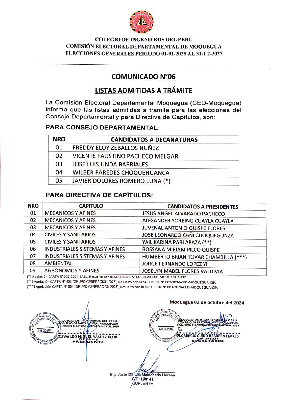 <p>NRO</p><p>02</p><p>04</p><p>05</p><p>06</p><p>07</p><p>NRO</p><p>La Comisión Electoral Departamental Moquegua (CED-Moquegua)</p><p>informa que las listas admitidas a trámite para las elecciones del</p><p>Consejo Departamental y para Directiva de Capitulos, son:</p><p>02</p><p>PARA CONSEJO DEPARTAMENTAL:</p><p>03</p><p>01 MECANICOS Y AFINES</p><p>04</p><p>05</p><p>03 MECANICOS Y AFINES</p><p>COMISIÓN ELECTORAL DEPARTAMENTAL DE MOQUEGUA</p><p>ELECCIONES GENERALES PERÍODO 01-01-2025 AL 31-1 2-2027</p><p>COLEGIO DE INGENIEROS DEL PERÚ</p><p>PRESIDENTE</p><p>NIAME</p><p>01 FREDDY ELOY ZEBALLOS NUÑEZ</p><p>VICENTE FAUSTINO PACHECO MELGAR</p><p>JOSE LUIS UNDA BARRIALES</p><p>WILBER PAREDES CHOQUEHUANCA</p><p>JAVIER DOLORES ROMERO LUNA (*)</p><p>MECANICOS Y AFINES</p><p>CAPITULO</p><p>CIVILESY SANITARIOS</p><p>PARA DIRECTIVA DE CAPÍTULOs:</p><p>LISTAS ADMITIDAS A TRÁMITE</p><p>IGENIER</p><p>COMUNICADO N°06</p><p>AGRONOMOS Y AFINES</p><p>1902</p><p>CIVILESY SANITARIOS</p><p>INDUSTRIALES SISTEMASY AFINES</p><p>INDUSTRIALES SISTEMÁS Y AFINES</p><p>AMBIENTAL</p><p>CANDIDATOS A DECANATURAS</p><p>AD</p><p>COLEGIO DE IEEROS DEL PERÚ</p><p>oNSEJO DEPARTANENKAL MOQUEGUA</p><p>MISIÓN ELECTORA6EPARTAMENTAL 20o24</p><p>(") Apelación CARTAN°O02-2024-SABL, Resuelto con RESOLUCION N° 001-2024-CED-MOQUEGUA-CIP.</p><p>eeeeeeeoeve0eeeeeeuee</p><p>(**) Apelación CARTA N° 003-"GRUPO GENERACION 2025", Resuelto con RESOLUCION N° 002-2024-CED-MOQUEGUA-CP.</p><p>(***) Apelación CARTAN° 004-"GRUPO GENERACION 2025", Resuelto con RESOLUCION N° 003-2024-CED-MOQUEGUA-CIP.</p><p>S%swALDO MIeEL VALDEZ FLOR</p><p>PRESSNE</p><p>CANDIDATOS A PRESIDENTES</p><p>JESUS ANGEL ALVARADO PACHECO</p><p>ALEXANDER YORBING CUAYLA CUAYLA</p><p>JUVENAL ANTONIO QUISPE FLORES</p><p>JOSE LEONARDO CAÑI CHOQUEGONZA</p><p>YAIL KARINA PARI APAZA (**)</p><p>ROSSANA MIRIAM PILCO QUISPE</p><p>HUMBERTO BRIAN TOVAR CHAMB0LLA (***)</p><p>JORGE FERNANDO LOPEZYI</p><p>JOSELYN MABEL FLORES VALDIVIA</p><p>Moquegua 03 de octubre del 2024.</p><p>IGENIERO</p><p>Oocen DE INGENIEROSD</p><p>SECRETARIO</p><p>PARTAMEN</p><p>CNSEJO DEPARAR</p><p>Ing. Justo Marços Maldonado Llerena</p><p>c¤P: 198141</p><p>sUPLENTE</p><p>PER</p><p>PLORENCIO GUIDÓ HERRERA FLORES</p><p>s24627, CRETAR</p><p>ISIÓN ELECTORAL DEPART MENTAL 2024</p><p>NRO</p><p>1 Freddy Eloy Zeballos Núñez</p><p>3</p><p>2 Javier Pedro Flores Arocutipa</p><p>4</p><p>7</p><p>"POR UNA INGENIERIA ETICA Y TECNICAMENTE</p><p>Nombresy apellidos</p><p>9</p><p>5 Javier Leonardo Salazar Muñoz</p><p>10</p><p>6 Javier Remberto Zeballos Chávez</p><p>Ricardo Diego Tapia Cossi</p><p>Robert Martin Rodriguez García</p><p>13</p><p>|Gustavo Antonio Cueto De La Fuente</p><p>Luis Alberto Zeballos Vélez</p><p>David Gregorio Rodriguez Diaz</p><p>Luis Alberto Toledo Okamoto</p><p>11 Edgar Virgilio Bedoya Justo</p><p>12 Frida Ada Páucar Albarracín</p><p>Carlos Ezequiel Mollinedo Olayunca</p><p>14 Lizbeth María Cam Hurtado</p><p>15 José Palomino Sullcachauman</p><p>16 Juver Zelin Vélez Ríos</p><p>17 Edwin Yuri Vargas Tapia</p><p>18 Ronnie Mercado Peñaranda</p><p>19 Dante Luis Pando Vera</p><p>20 Miguel Vicente Salas Zeballos</p><p>21 Carlos Hoover Centurión Yañez</p><p>22 Vicente Rolando Zeballos Catacora</p><p>23 Ciro Alejandro Zavaleta López</p><p>24 |César Augusto Hurtado Cuelar</p><p>25 Alexander David Blas Castro</p><p>26 Patricia Yovana Liendo Arce</p><p>MIS</p><p>PRLSIOONE</p><p>LISTA</p><p>COMPETENTE"</p><p>OEPST PARTA</p><p>N° CIP</p><p>19380</p><p>140774</p><p>16696</p><p>75204</p><p>38563</p><p>61757</p><p>5429</p><p>17759</p><p>24119</p><p>26346</p><p>41822</p><p>47311</p><p>60046</p><p>71145</p><p>72315</p><p>75123</p><p>82559</p><p>91999</p><p>105837</p><p>107903</p><p>125766</p><p>134694</p><p>139788</p><p>160558</p><p>161422</p><p>162796</p><p>Decano Departamental</p><p>Vice Decano Departamental</p><p>Director Secretario Departamental</p><p>Director Tesorero Departamental</p><p>Director Prosecretaria Departamental</p><p>Director Protesorero Departamental</p><p>ASAMBLEISTA 1</p><p>Cargos</p><p>ASION</p><p>ASAMBLEISTA 2</p><p>ASAMBLEISTA 3</p><p>ASAMBLEISTA 4</p><p>ASAMBLEISTA 5</p><p>ASAMBLEISTA 6</p><p>ASAMBLEISTA 7</p><p>ASAMBLEISTA 8</p><p>ASAMBLEISTA 9</p><p>ASAMBLEISTA 10</p><p>MIGEUIE</p><p>ASAMBLEISTA 11</p><p>ASAMBLEISTA 12</p><p>ASAMBLEISTA 13</p><p>ASAMBLEISTA 14</p><p>ASAMBLEISTA 15</p><p>ASAMBLEISTA 16</p><p>ASAMBLEISTA 17</p><p>ASAMBLEISTA 18</p><p>ASAMBLEISTA 19</p><p>ASAMBLEISTA 20</p><p>AARIO</p><p>RTAEA</p><p>FORMATO DE HOJA DE VIDA DE CANDIDATOS</p><p>Datos Personales</p><p>Nombres: Freddy Eloy</p><p>Apellidos: Zeballos Núñez</p><p>N° CIP: 19380</p><p>Capitulo: Industriales, Sistemas y afines</p><p>Fecha y lugar de nacimiento: 26/06/1953; Moquegua</p><p>Denominación de la lista por la que postula: POR UNA</p><p>INGENIERIA ETICA Y TECNICAMENTE COMPETENTE</p><p>Experiencia de trabajo, profesiones ylo trayectoria como diigente</p><p>Experiencia de Trabajo</p><p>DNI: 04412380</p><p>44 añios de ingeniero colegiado, trabajando en entidades públicas y privadas, destacando:</p><p>1. Provías Descentralizado -Coordinador Zonal de Ancash (ingresado por Concurso</p><p>publicado en el diario EI Comercio (6 años y 8 meses, terminó por límite de edad)</p><p>2. Empresa de Generación Eléctrica del Sur, Miembro del Directorio (3 años).</p><p>3. Proyecto Especial Regional Pasto Grande -Gerente General, Asesor, Miembro del</p><p>Directorio, Director Ejecutivo y Director de Estudios (8 años y 4 meses, no</p><p>continuos).</p><p>4. ZOTAC (Zona Franca de Tacna) -Gerente de Proyectos (10 años).</p><p>Trayectoria como dirigente:</p><p>1. Decano del CIP Moquegua (3 veces) 1988-1989, 1990-1991 y 2006-2007.</p><p>2. Ha publicado el libro: "Los 175 años del Proyecto Pasto Grande (1848-2023). y</p><p>sus 3 elefuntes blancos de ahora", que compila 19 artículos publicados, sobre:</p><p>"Chilota-Chincune", Lomas de Ilo" y "Centrales Hidroeléctricas Moquegua 1y</p><p>3" (l