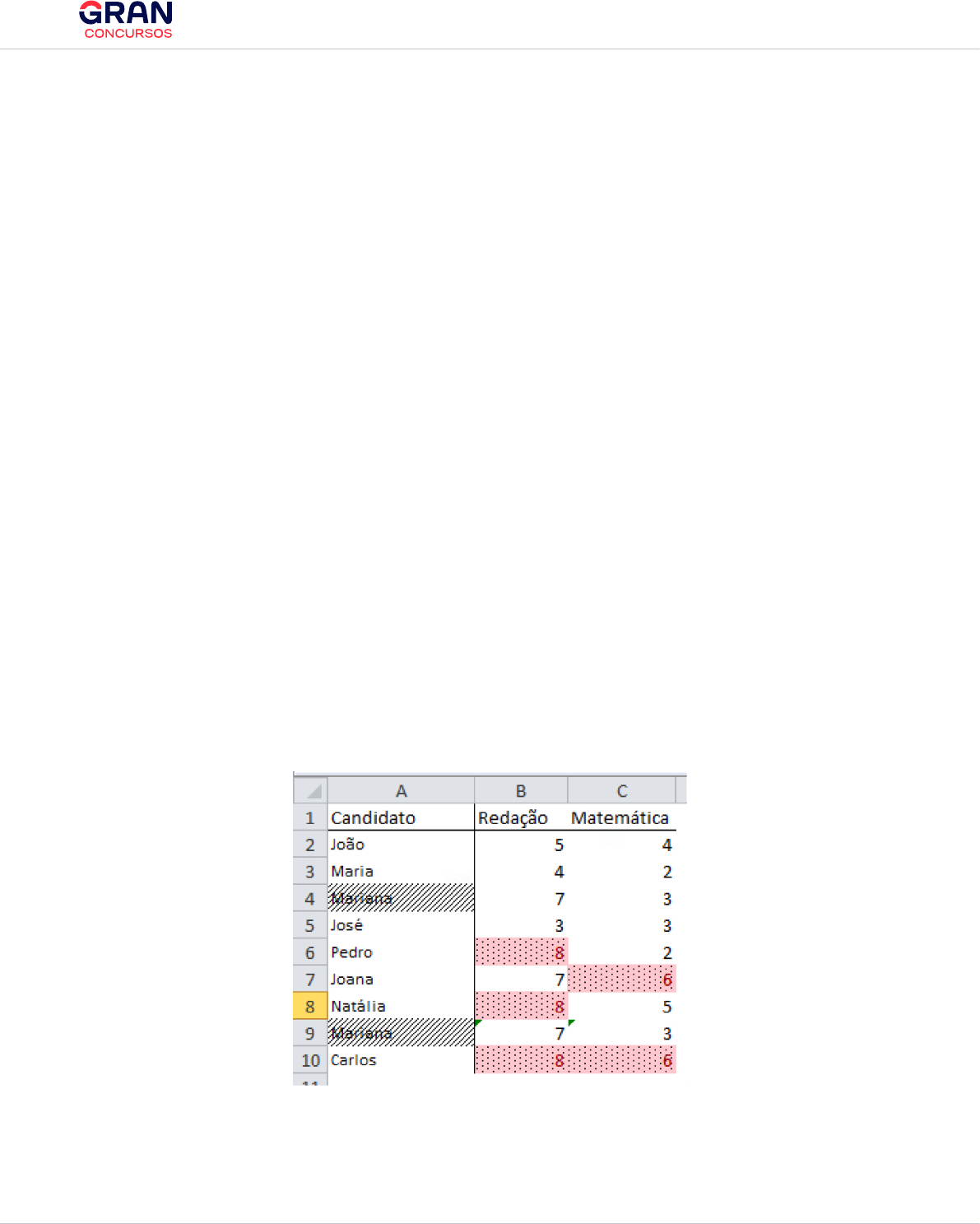 730 de 733gran.com.br Caderno de Questões – FGV Mais de 2000 questões gabaritadas! 1562. 1562. (FGV/2022/POLÍCIA MILITAR DO AMAZONAS/PM-AM/SOLDADO DA POLÍCIA MILITAR) Joana quer descobrir a capacidade, o espaço livre e o espaço usado do drive C: do seu notebook. Para tanto, depois de clicar com o botão direito sobre o drive no Explorador de Arquivos do Windows, Joana deve usar a opção a) Configurações. b) Expandir. c) Info. d) Propriedades. e) Recolher. 1563. 1563. (FGV/2022/POLÍCIA CIVIL DO RIO DE JANEIRO/PC-RJ/INSPETOR DE POLÍCIA CIVIL) No LibreOffice Writer, é possível selecionar partes não contíguas de um documento. Para isso, é preciso selecionar a parte desejada e: a) manter pressionada a tecla Ctrl e pressionar a tecla PgDn ou PgUp na direção desejada; b) manter pressionada a tecla Ctrl e pressionar uma tecla de seta na direção desejada; c) manter pressionada a tecla Ctrl enquanto seleciona mais partes; d) manter pressionada a tecla Shift e pressionar uma tecla de seta na direção desejada; e) manter pressionada a tecla Shift enquanto seleciona mais partes. 1564. 1564. (FGV/2022/CONTROLADORIA-GERAL DA UNIÃO/CGU-BR/TÉCNICO FEDERAL DE FINANÇAS E CONTROLE) Fernando recebeu um arquivo com o resultado de um teste de redação e matemática aplicado aos candidatos a uma vaga na sua instituição e importou os dados para uma planilha Excel 2010 no Windows 10. Com centenas de linhas, a lista contém o nome de cada candidato e as duas notas, como mostra o extrato a seguir. Fernando decidiu melhorar a visualização dos dados, de modo a identificar as melhores notas e os candidatos com notas consistentemente mais altas, além de localizar eventuais