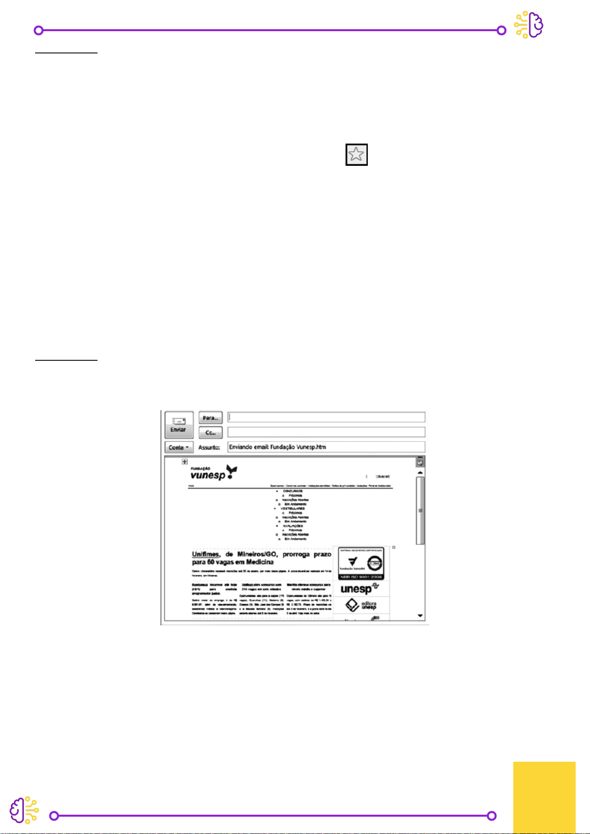 93 Questão 236: FGV - GP (CODEBA)/CODEBA/2016 Com relação ao navegador Internet Explorer 11 BR, analise as afirmativas a seguir. I. Para exibir o conteúdo da página de um site na modalidade tela cheia, deve-se acionar a tecla de função F11. II. Para imprimir o conteúdo de uma página de um site, deve-se executar o atalho de teclado Ctrl + P. III. Para acessar a janela Opções da Internet, deve-se acionar o ícone . Assinale: a) se somente a afirmativa I estiver correta. b) se somente a afirmativa II estiver correta. c) se somente as afirmativas I e II estiverem corretas. d) se somente as afirmativas II e III estiverem corretas. e) se todas as afirmativas estiverem corretas. Questão 237: VUNESP - Ag (IPSMI)/IPSMI/Administrativo/2016 Observe o e-mail criado automaticamente no MS-Outlook 2010 pelo Internet Explorer 11, na sua configuração padrão, enquanto o usuário visitava a página da Fundação Vunesp. Para criar o e-mail apresentado parcialmente na figura, no Internet Explorer, o usuário acessou o menu Arquivo, opção Enviar e clicou em a) Importar e exportar... b) Anexo por Email... c) Link por Email... d) URL por Email... e) Página por Email... Licenciado para - sara aparecida de souza consoli - 33544593874 - Protegido por Eduzz.com